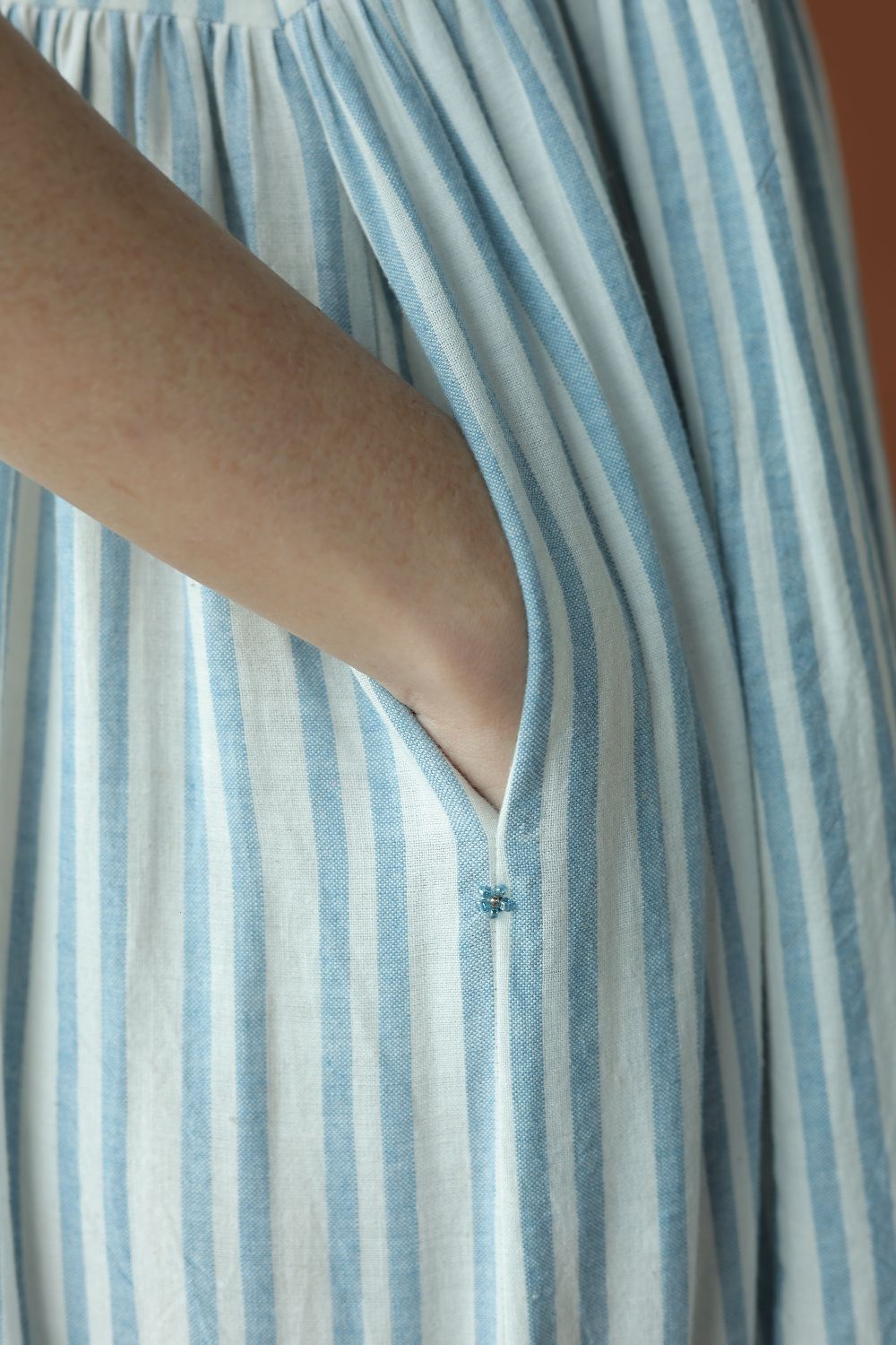 Alice' - The perfect summer sleeveless dress in blue strips. Gathers that run down the waist, large side pockets and subtle details to bring it all together.