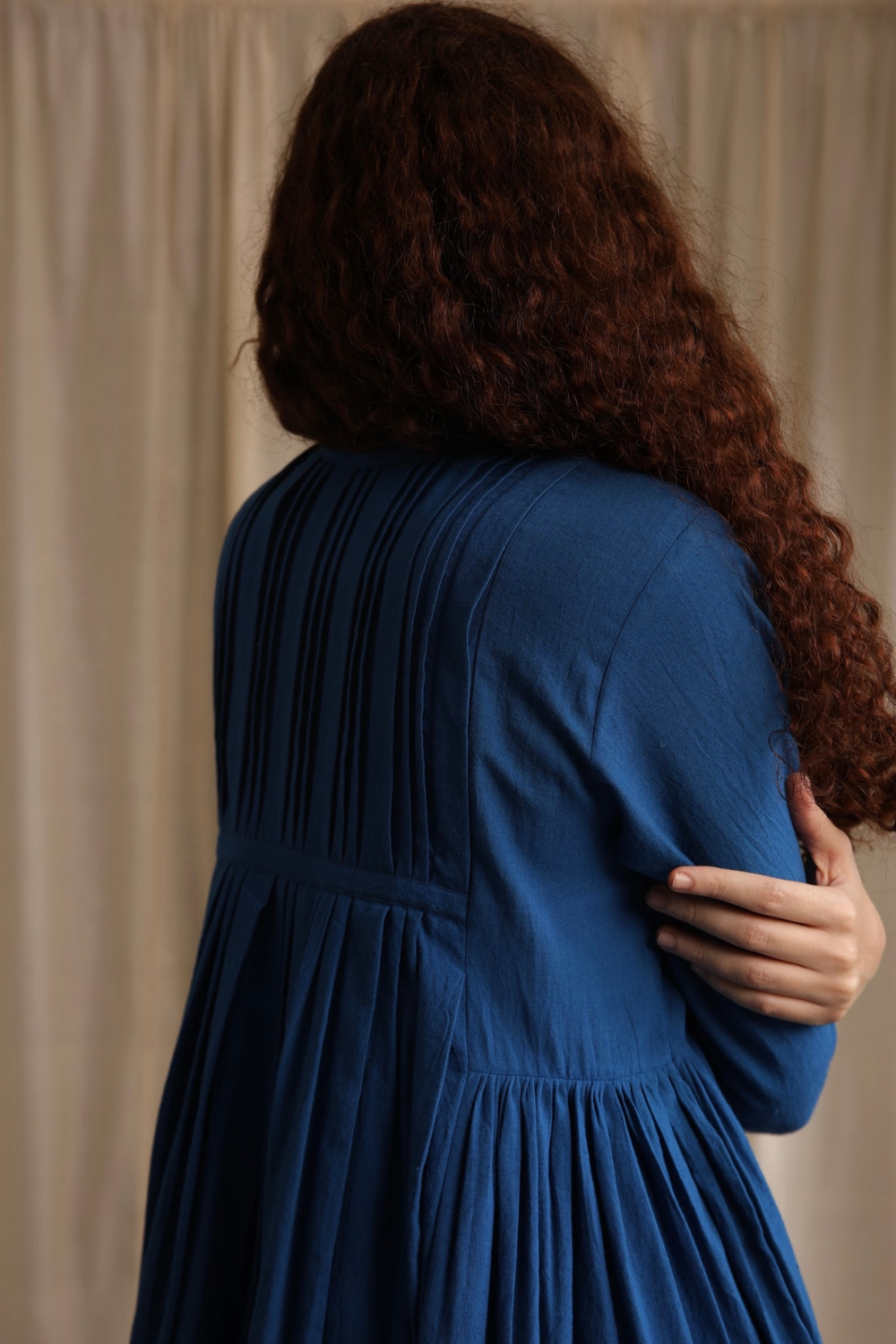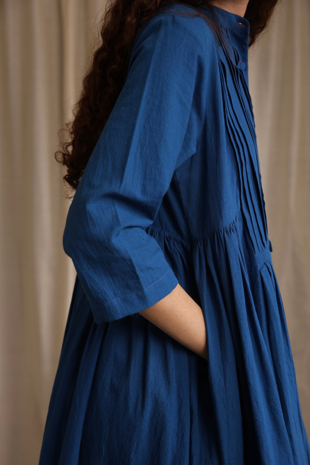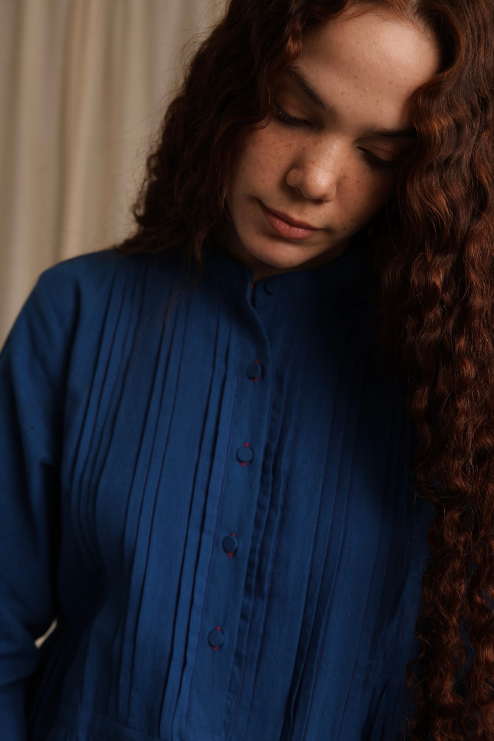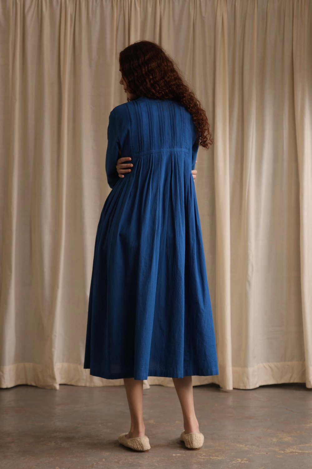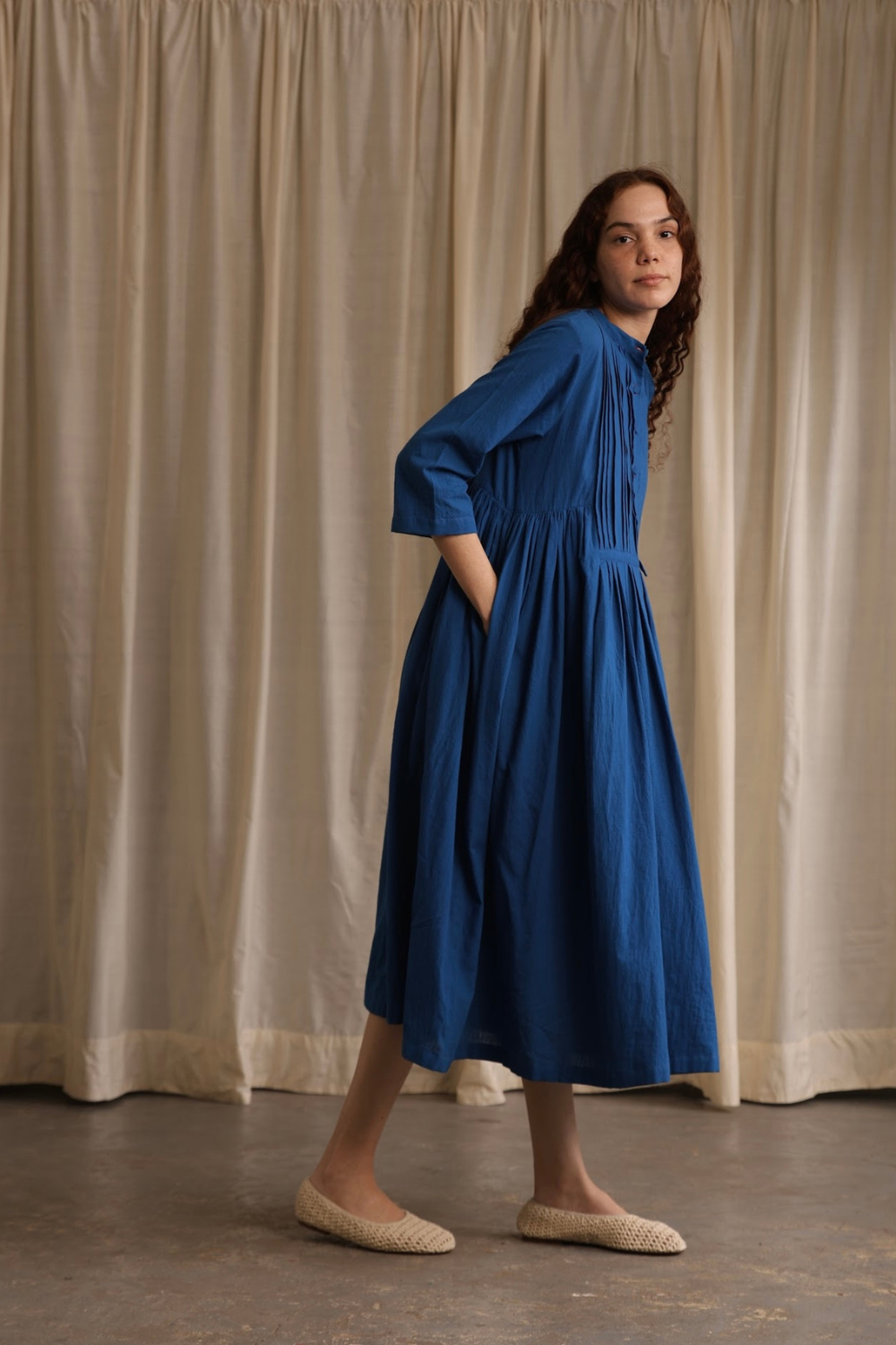 A Mason & Mill favorite, redefined in solid tarpaulin blue. With a lifted back, pleats at the bodice and back, this dress is a perfect balance of structure and effortless grace. Detailed with button and a mandarin collar.