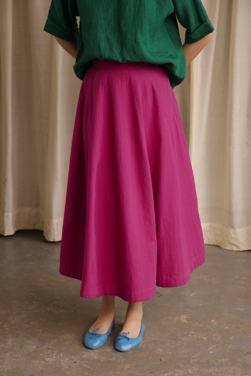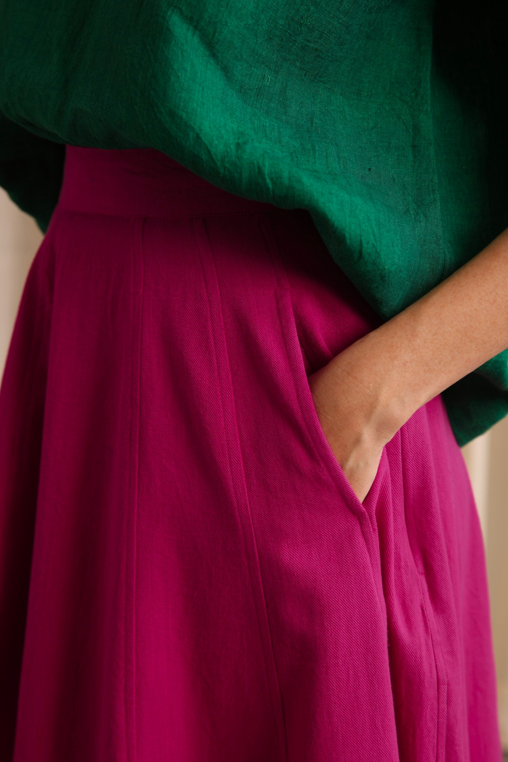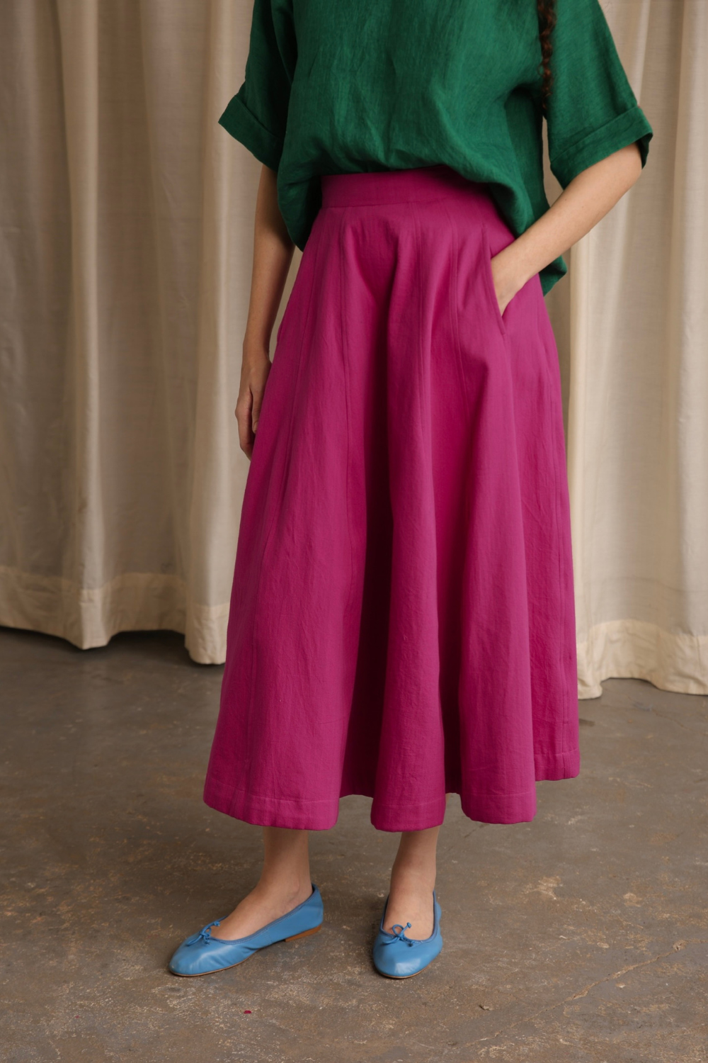 Handwoven cotton twill cut into panels to form this fluid heavy weight skirt. Double seam stitches and intentionally placed off side pockets make the skirt a good fit for every wardrobe. Comes with a fixed waist band and a concealed side zip.