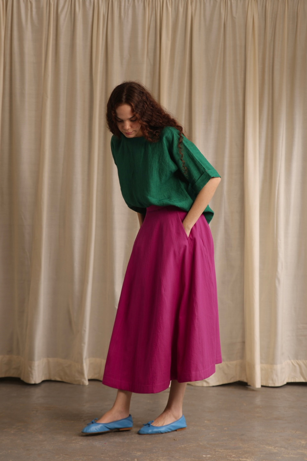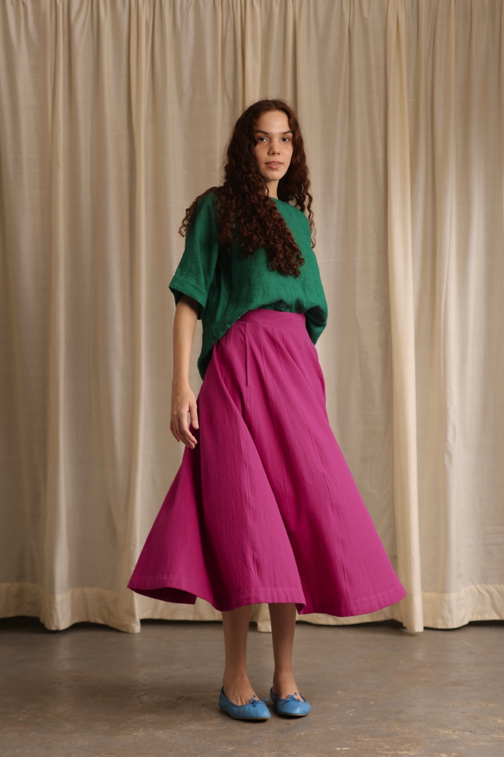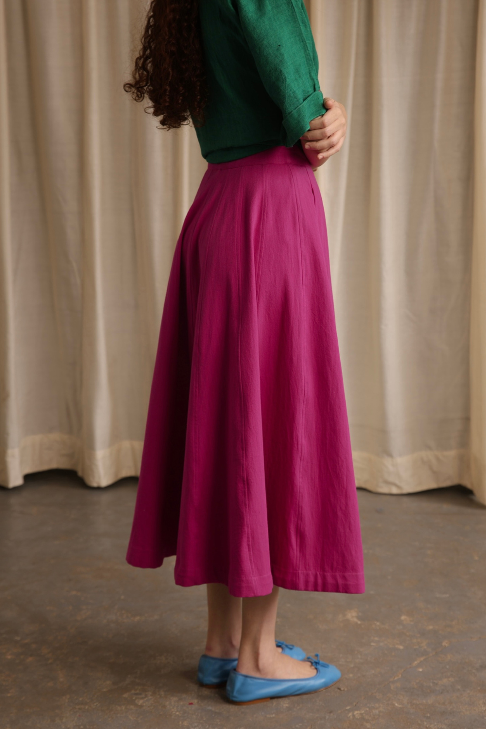 Handwoven cotton twill cut into panels to form this fluid heavy weight skirt. Double seam stitches and intentionally placed off side pockets make the skirt a good fit for every wardrobe. Comes with a fixed waist band and a concealed side zip.