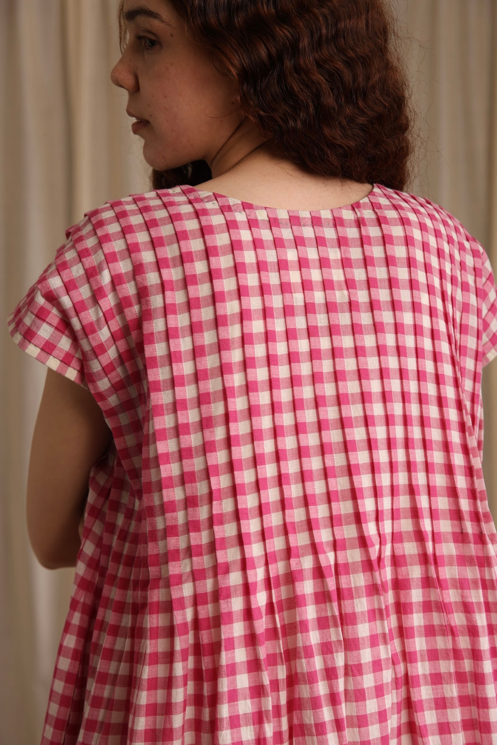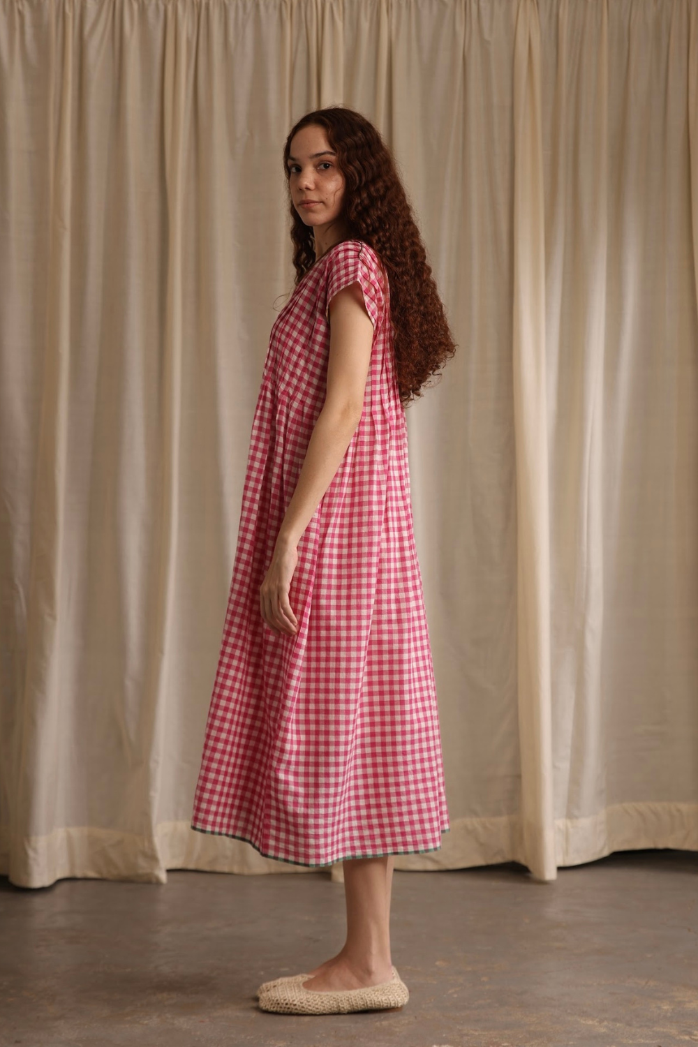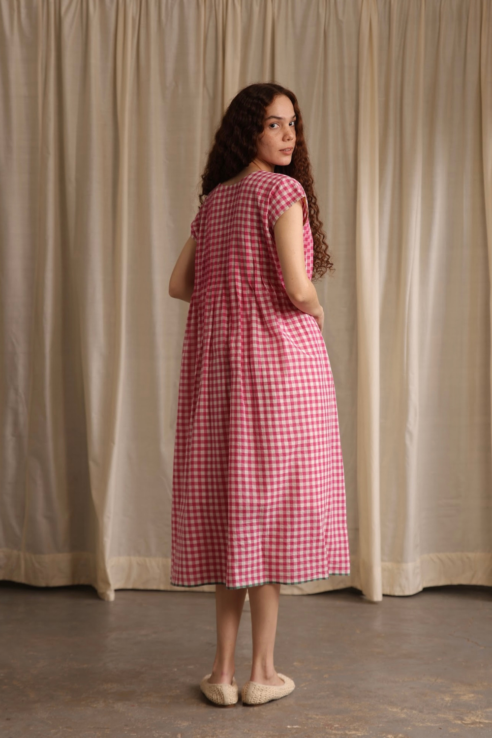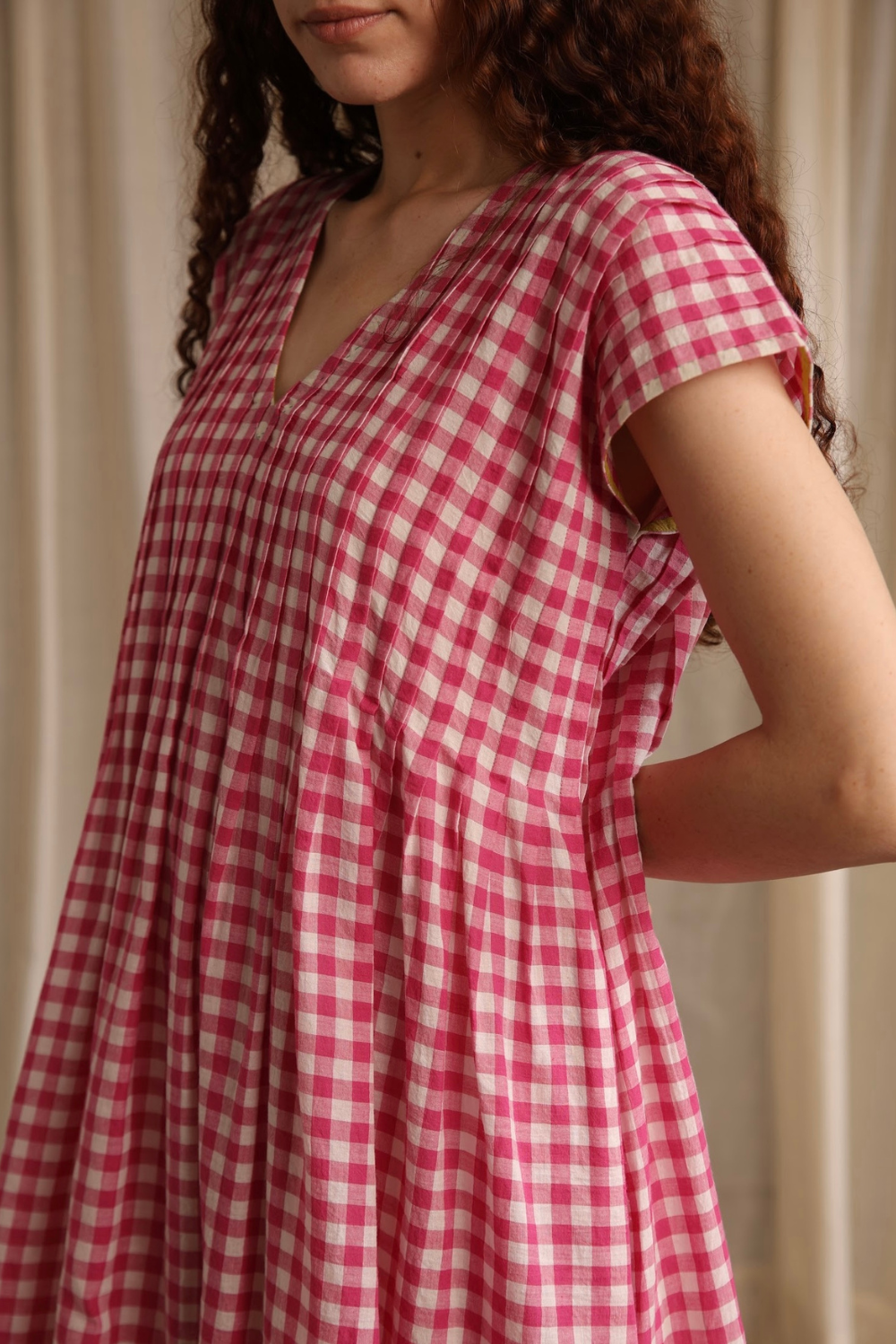 Easy, breezy, and perfect for warm days. Made from airy handwoven cotton in pink gingham checks with delicate bodice pleats, pockets and a contrasting green hemline. Darla will become your go-to summer dress.