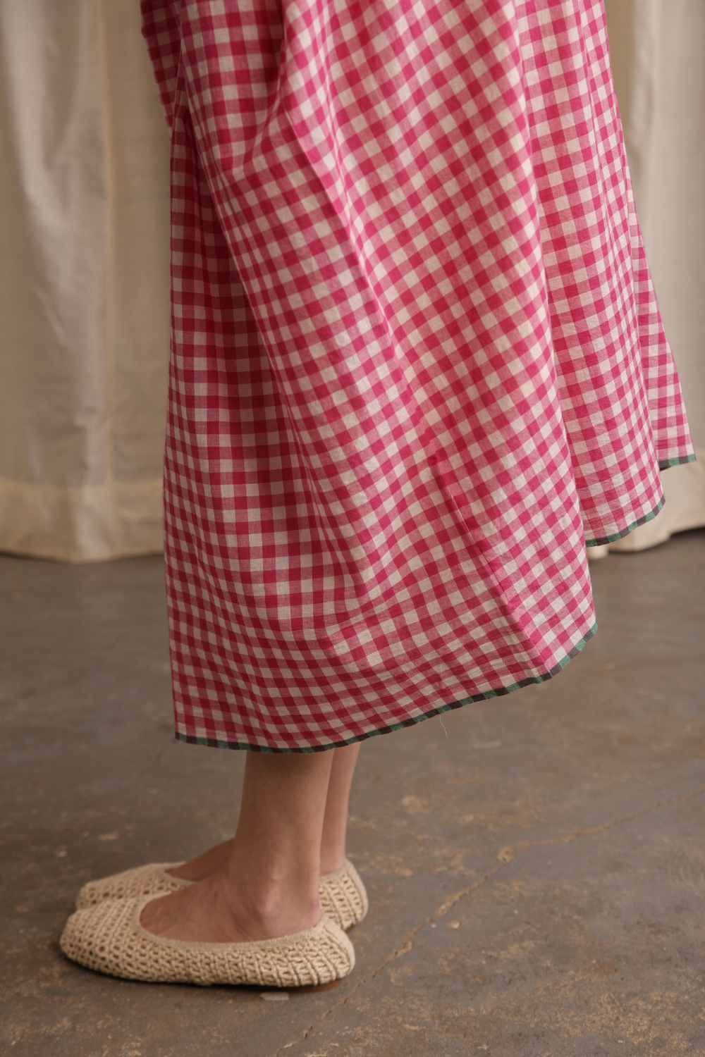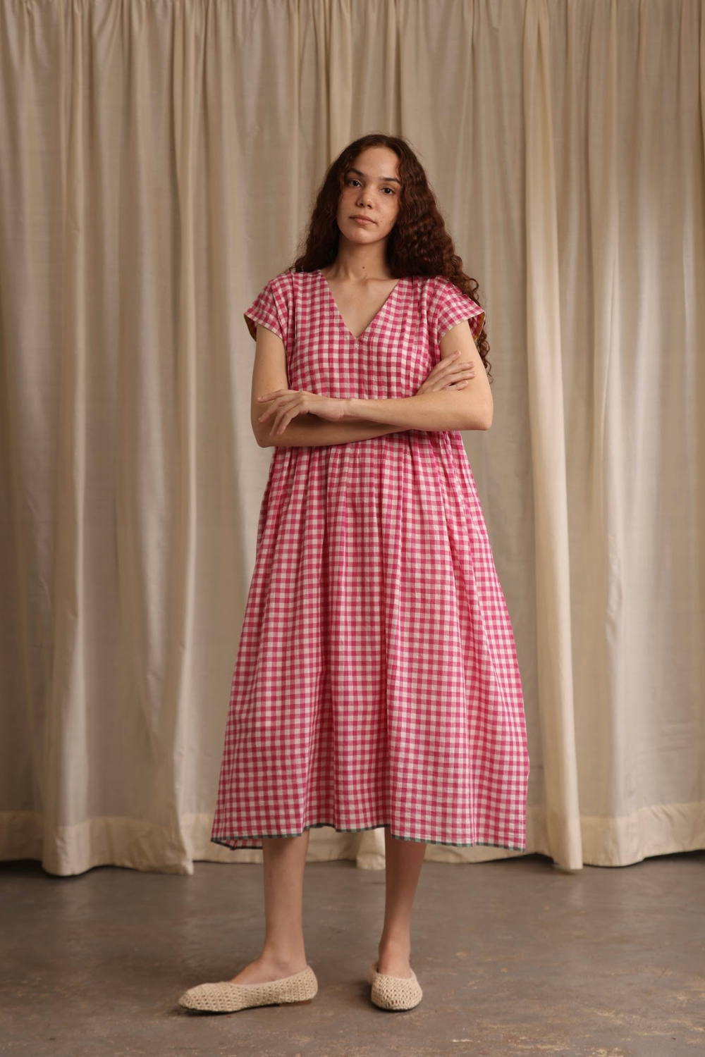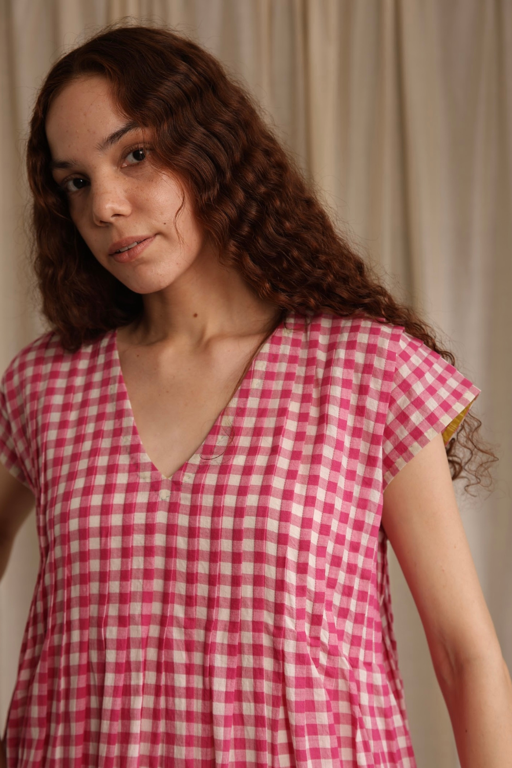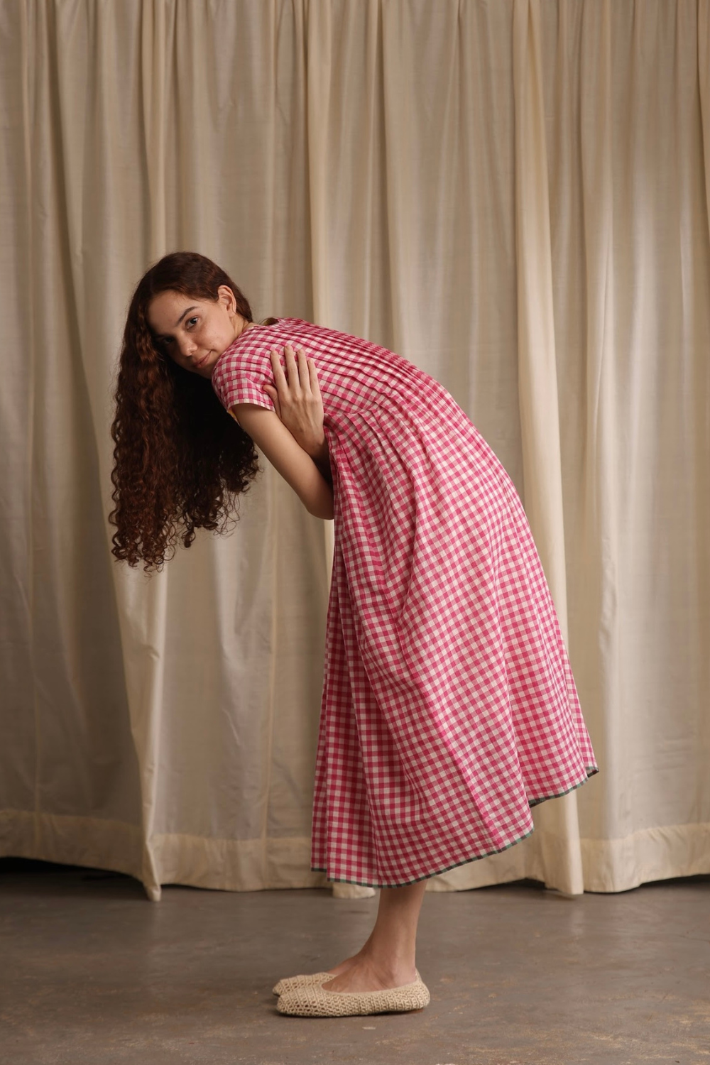 Easy, breezy, and perfect for warm days. Made from airy handwoven cotton in pink gingham checks with delicate bodice pleats, pockets and a contrasting green hemline. Darla will become your go-to summer dress.
