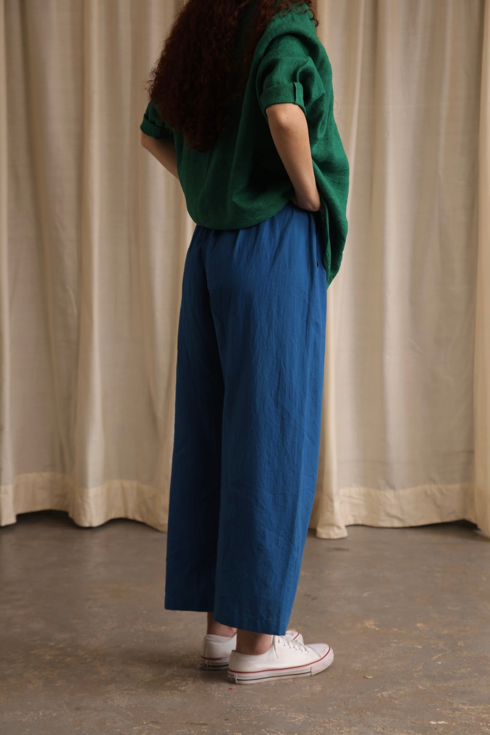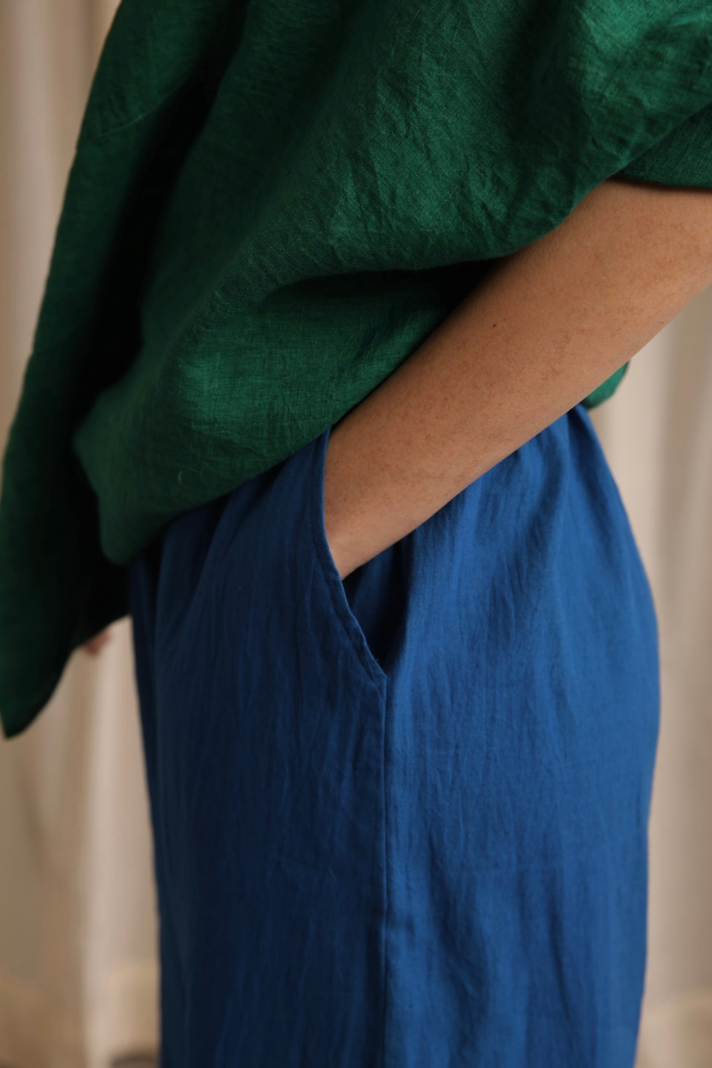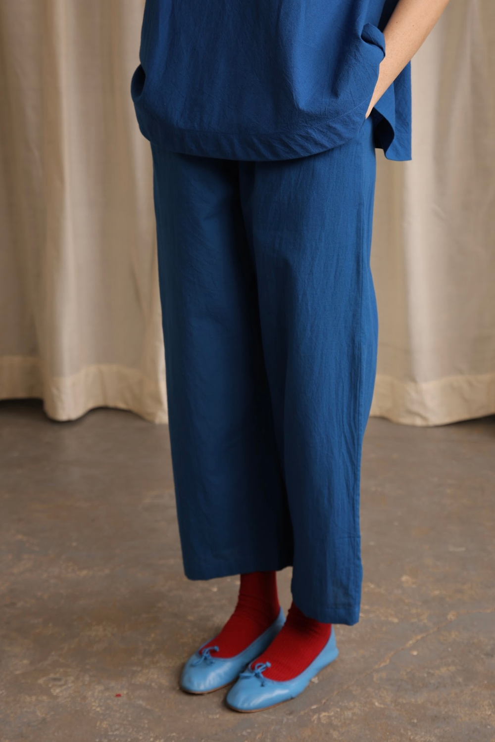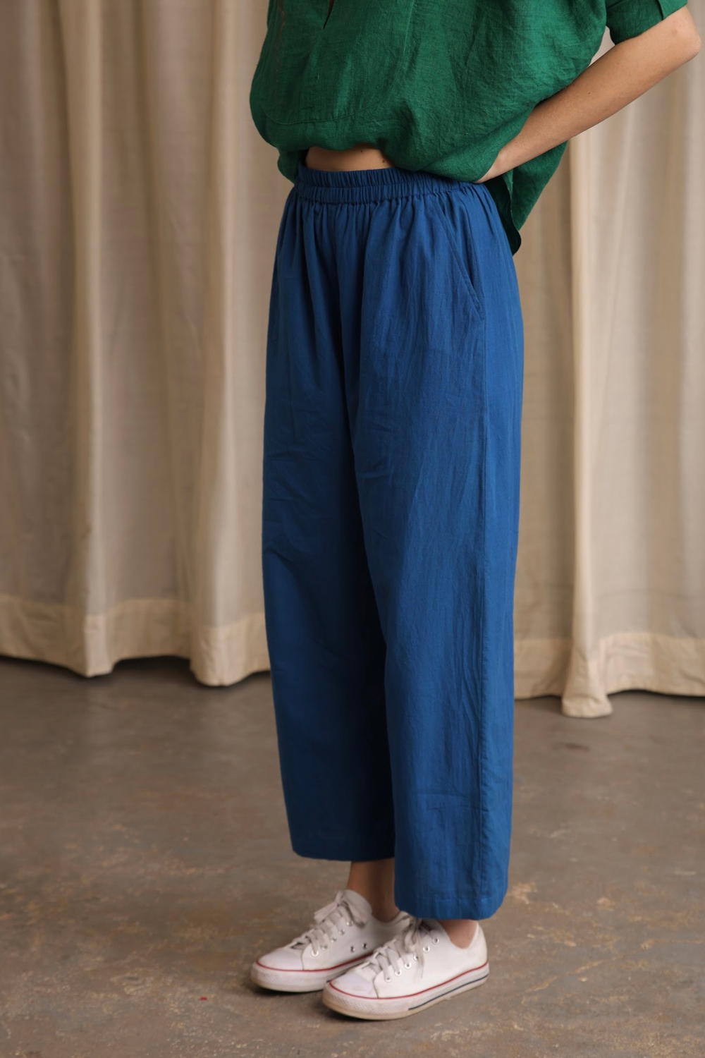 Basic straight fit relaxed pants cut in a vibrant handwoven cotton, with cross pockets and an elasticated waist.