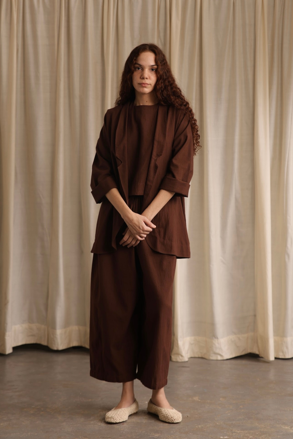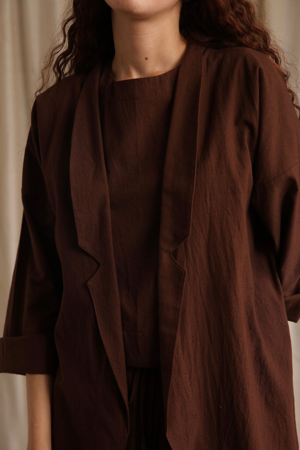 A light summer layer in handwoven cotton, cut to mimic a coat with long lapels. The look of styling a coat in summer without the fuss of it.