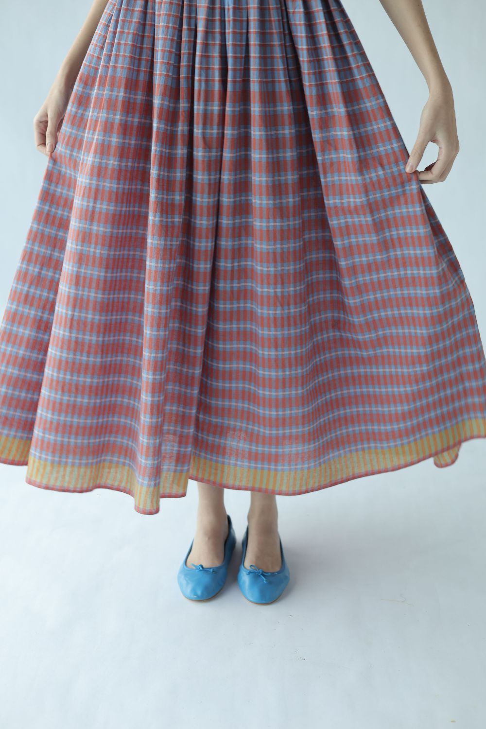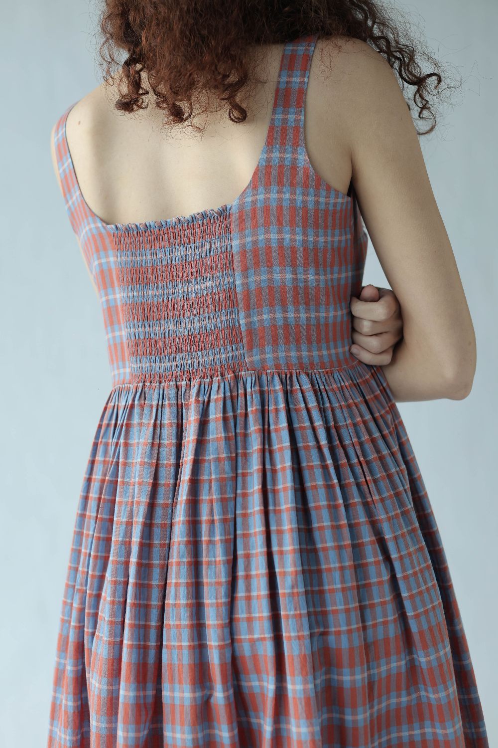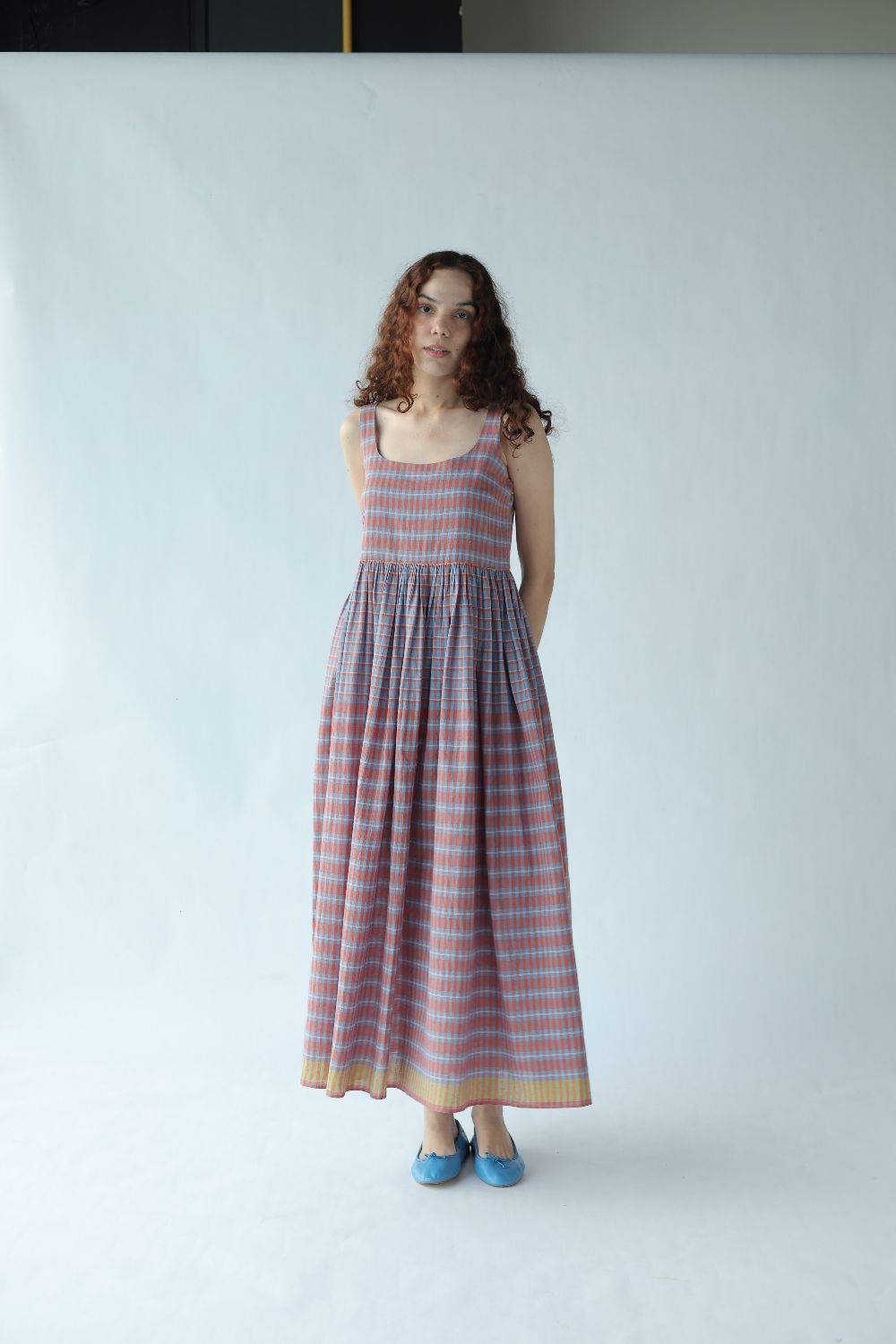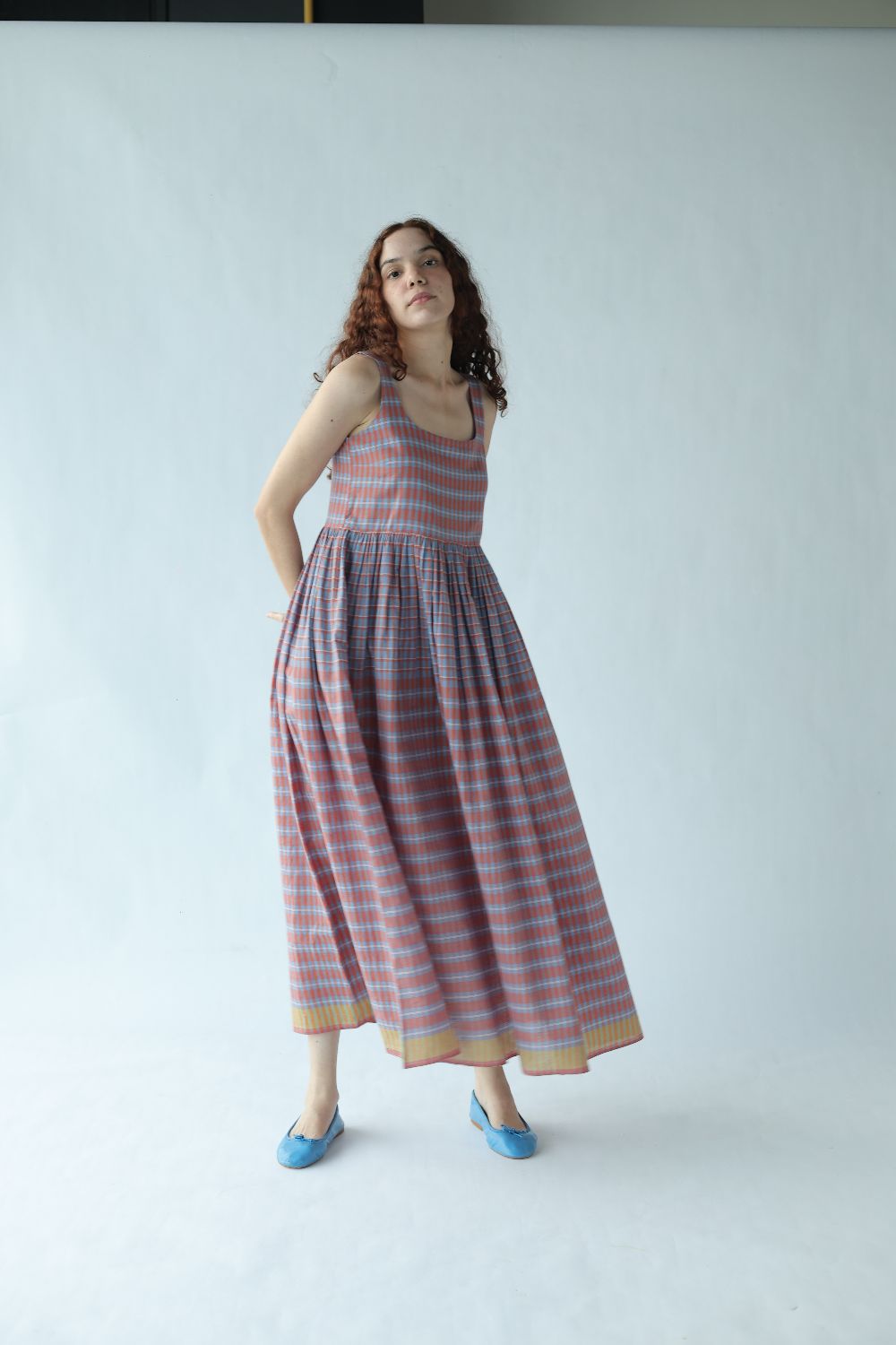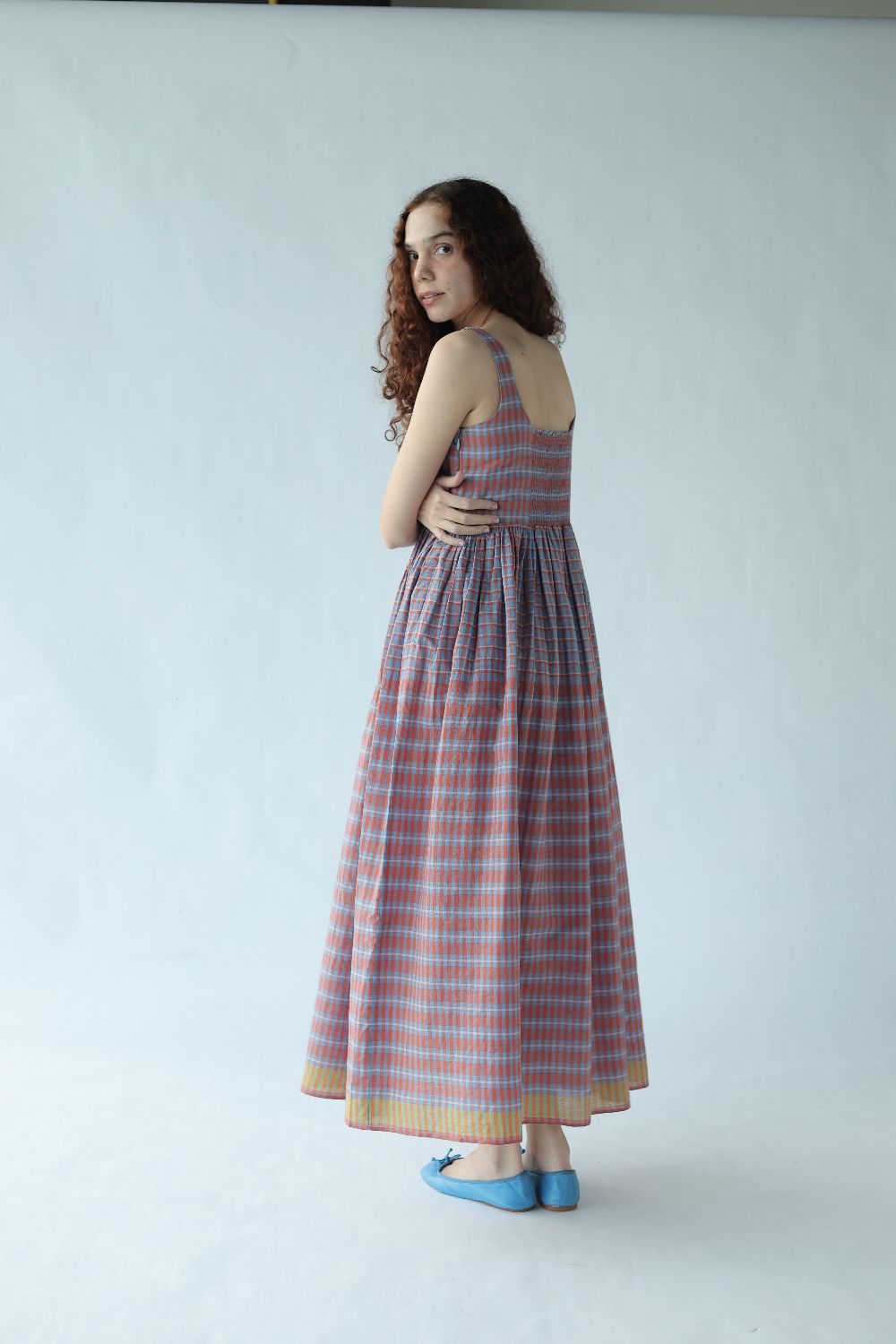 A change from the classic Mason & Mill dresses, 'Mia' is a sleeveless cotton midi that comes with a slightly fitted bodice elasticated at the back, and gathers that run down the waistline - this time in a subtle yet bold two toned checks with a vibrant contrasting yellow selvage.