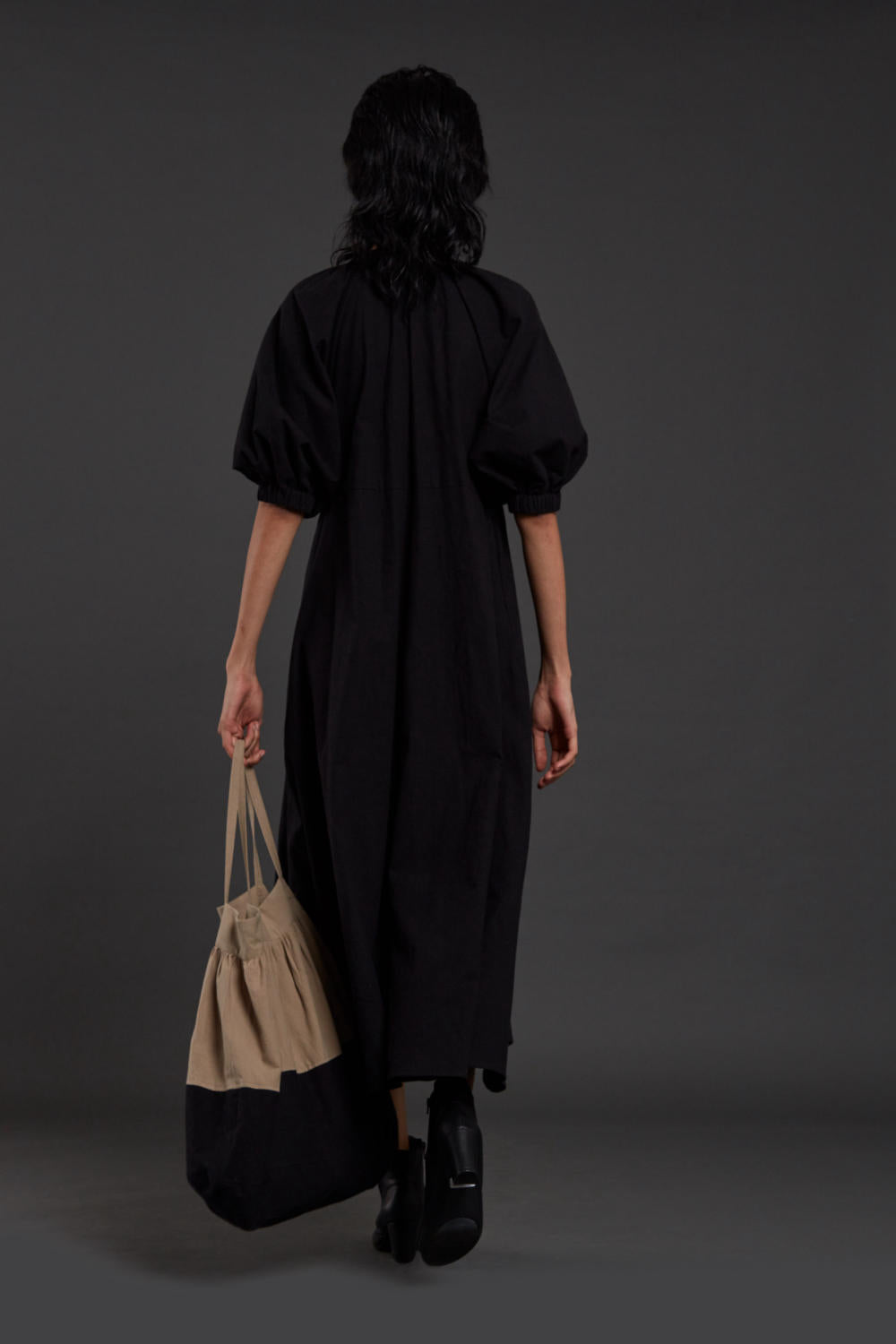 Product Category: DRESS A raglan sleeve, ankle-length dress with elastic detailing on the neck and sleeves