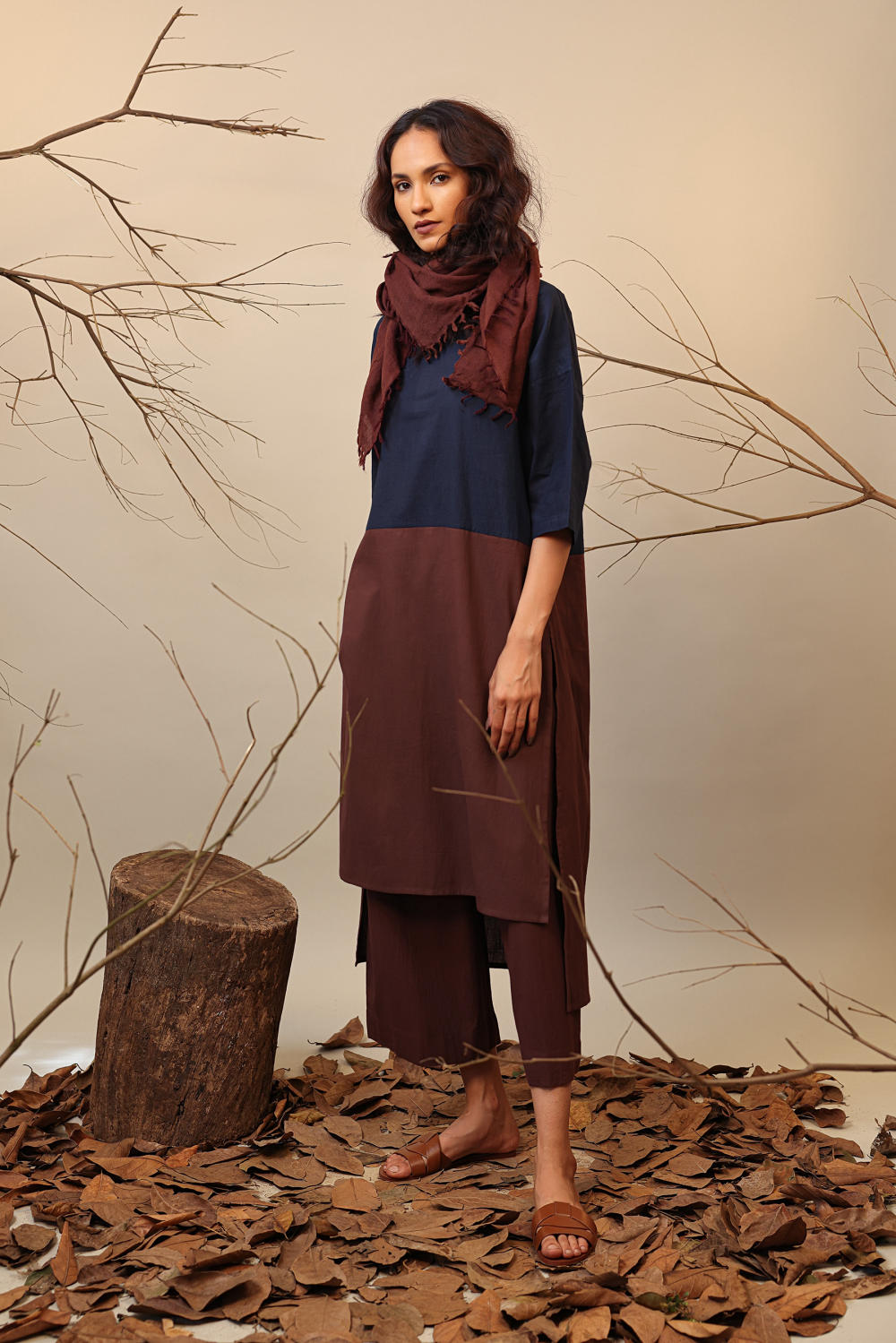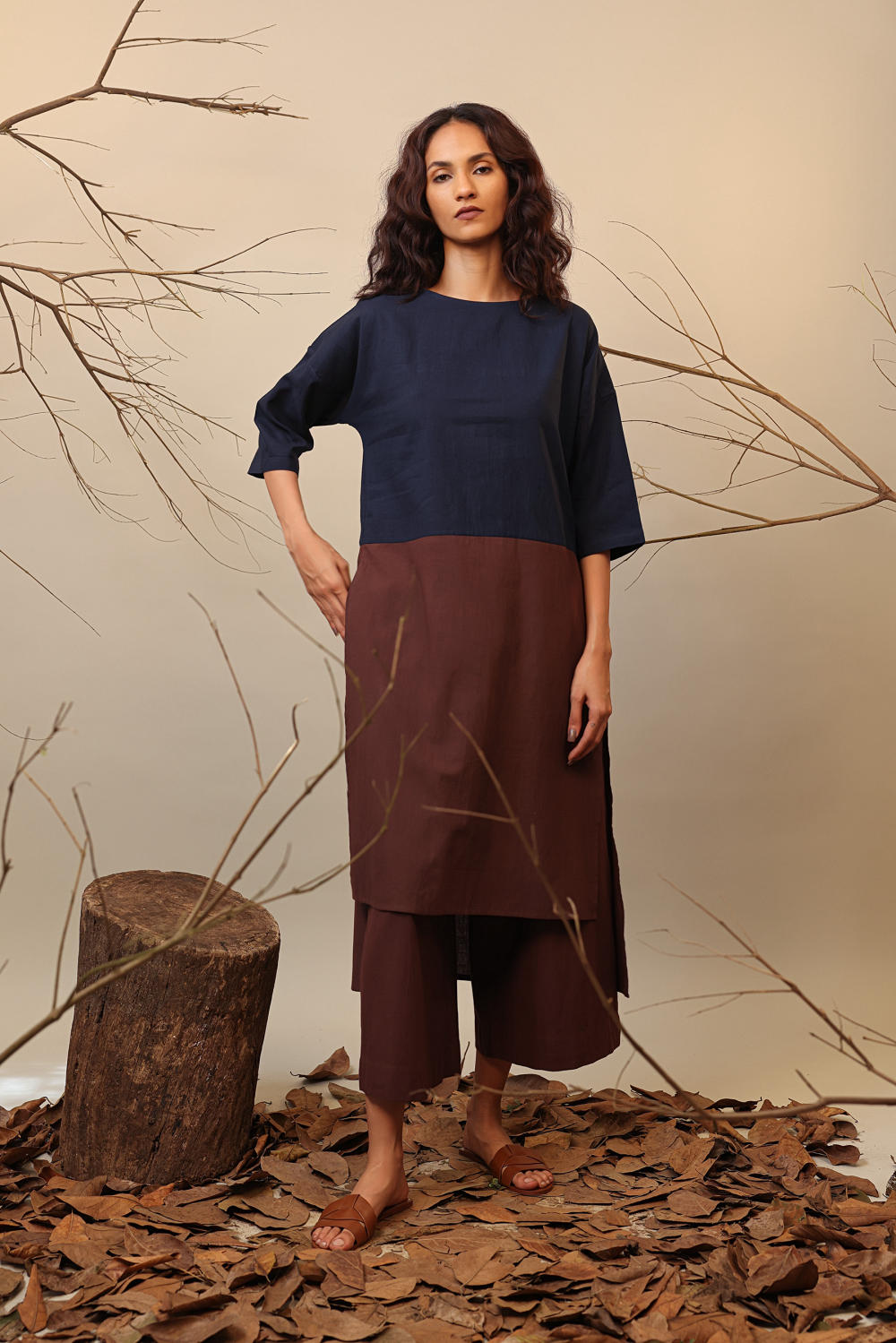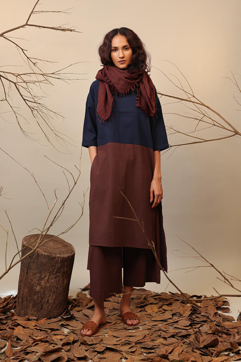 A short and long colour block tunic with back button opening. Team it up with the capre pants from this collection to complete the look. Wear a scarf of any colour from this collection and have fun styling in winters. Please note: Scarf and Pants are not included in this style listing.