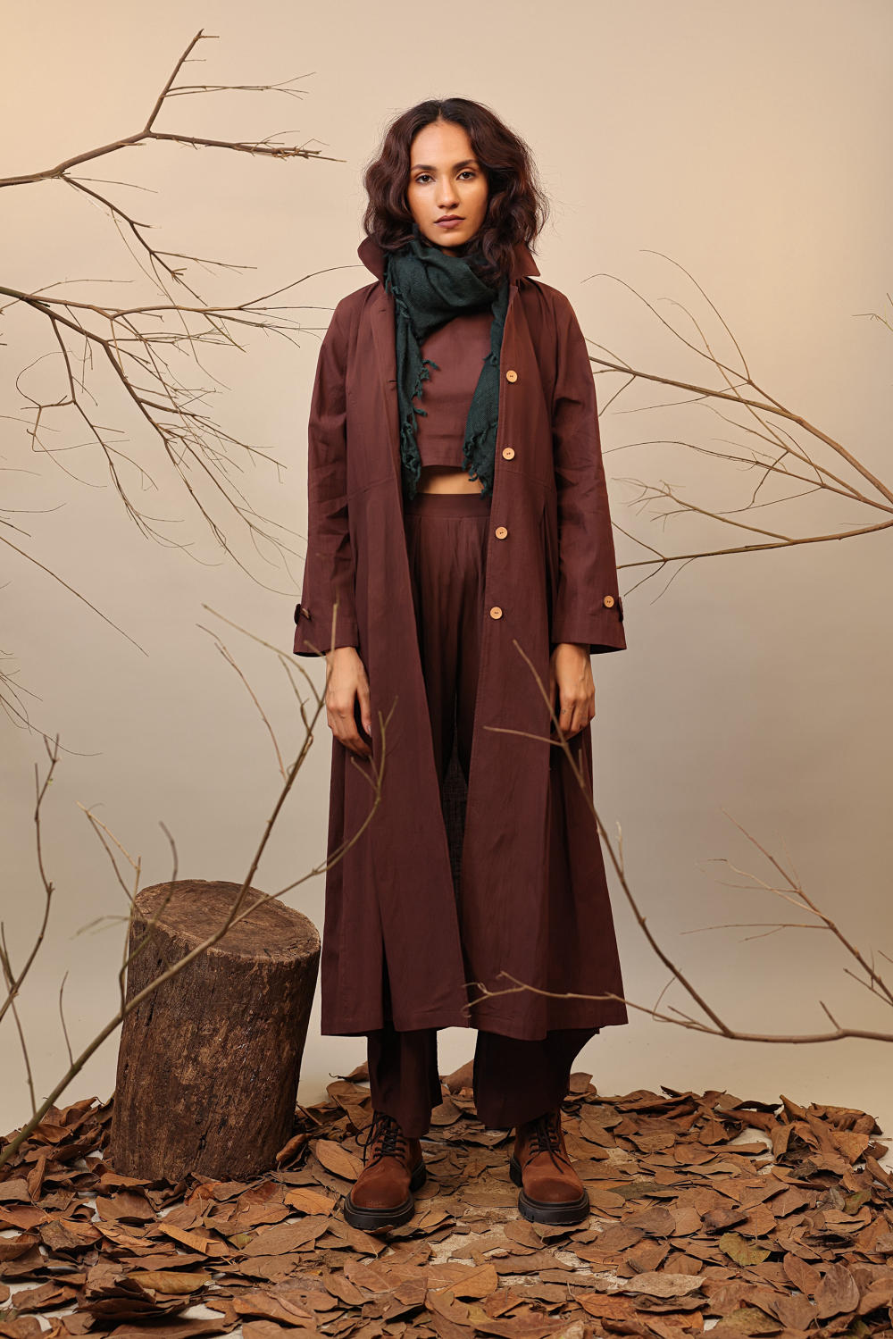 Full length jacket with peter pan collars and full sleeves with side pockets. Full button closer in the front. Layer it on any cord set from this collection or team it up with pieces in your wardrobe. A perfect travel jacket.