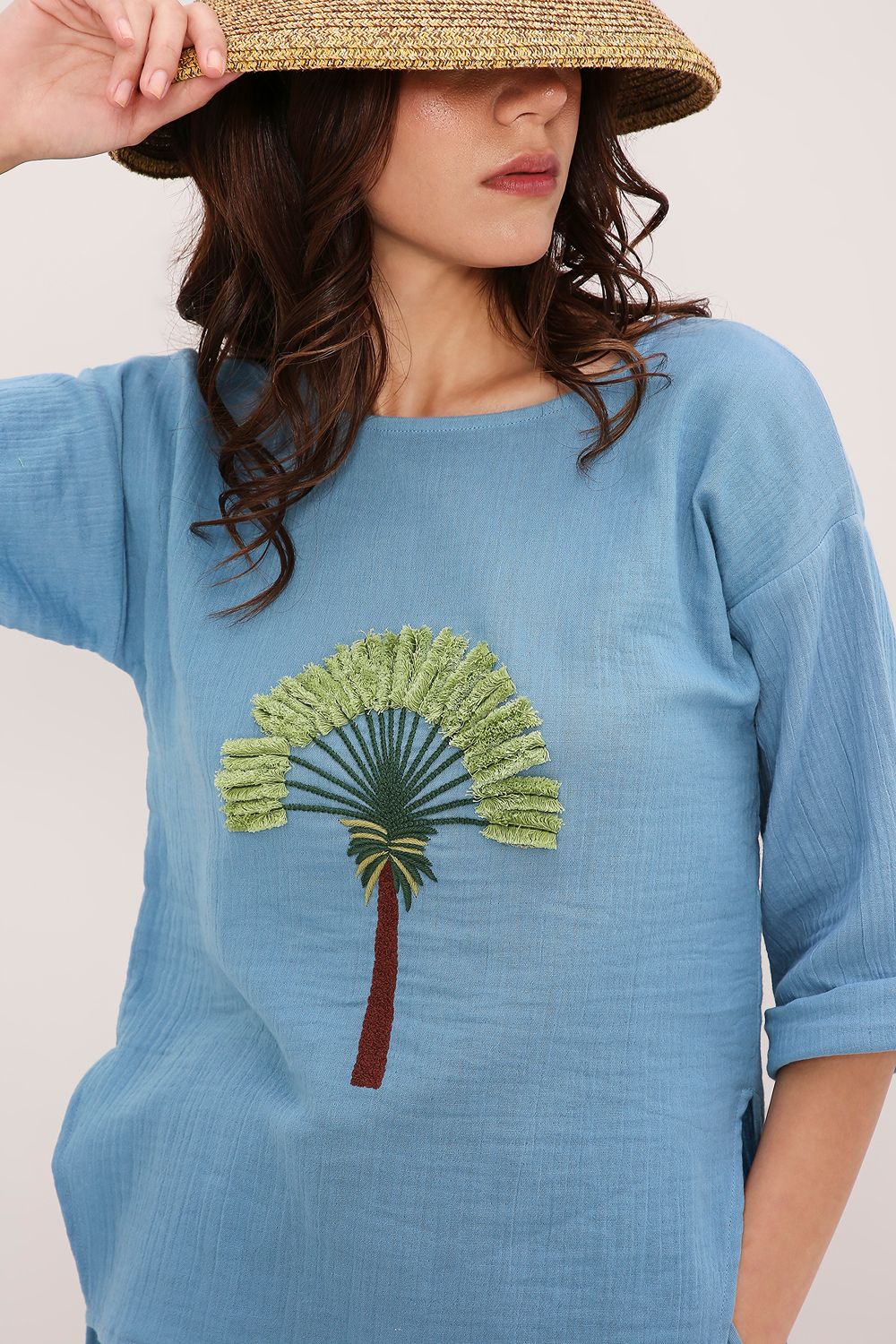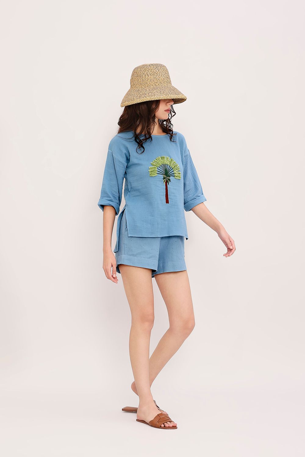 Hand embroidered soft crush cotton summer top. Wear it with our shorts or cotton pants from the collection to complete the look.