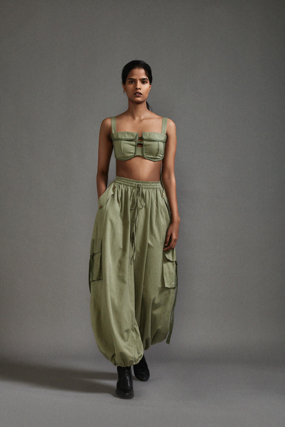 A well-fitted pocket corset with adjustable straps and elastic at the back.