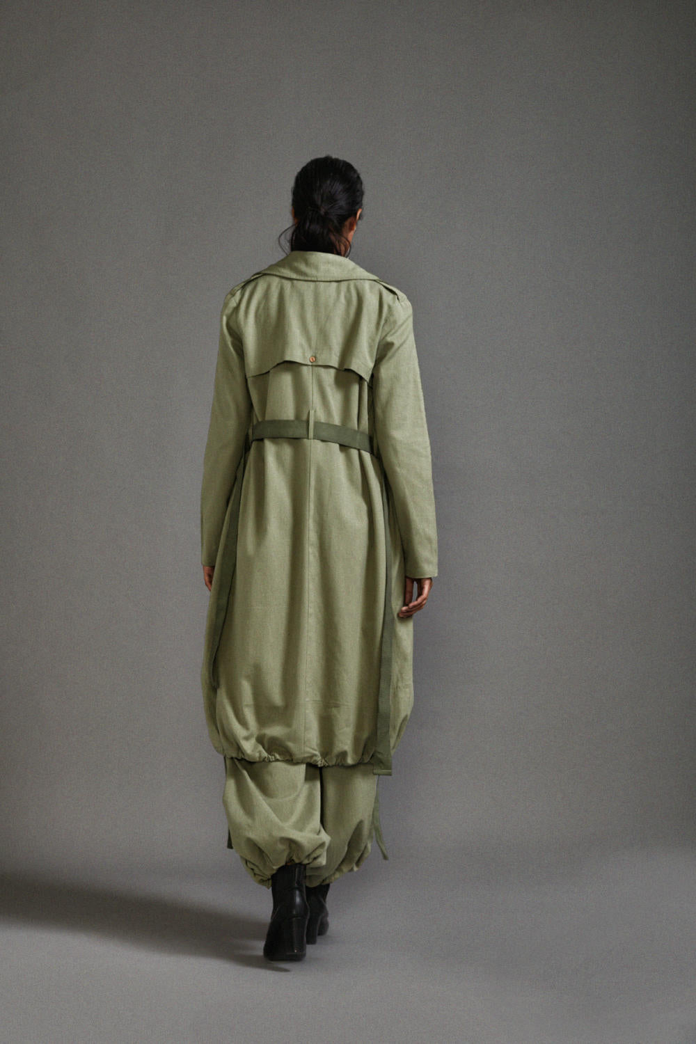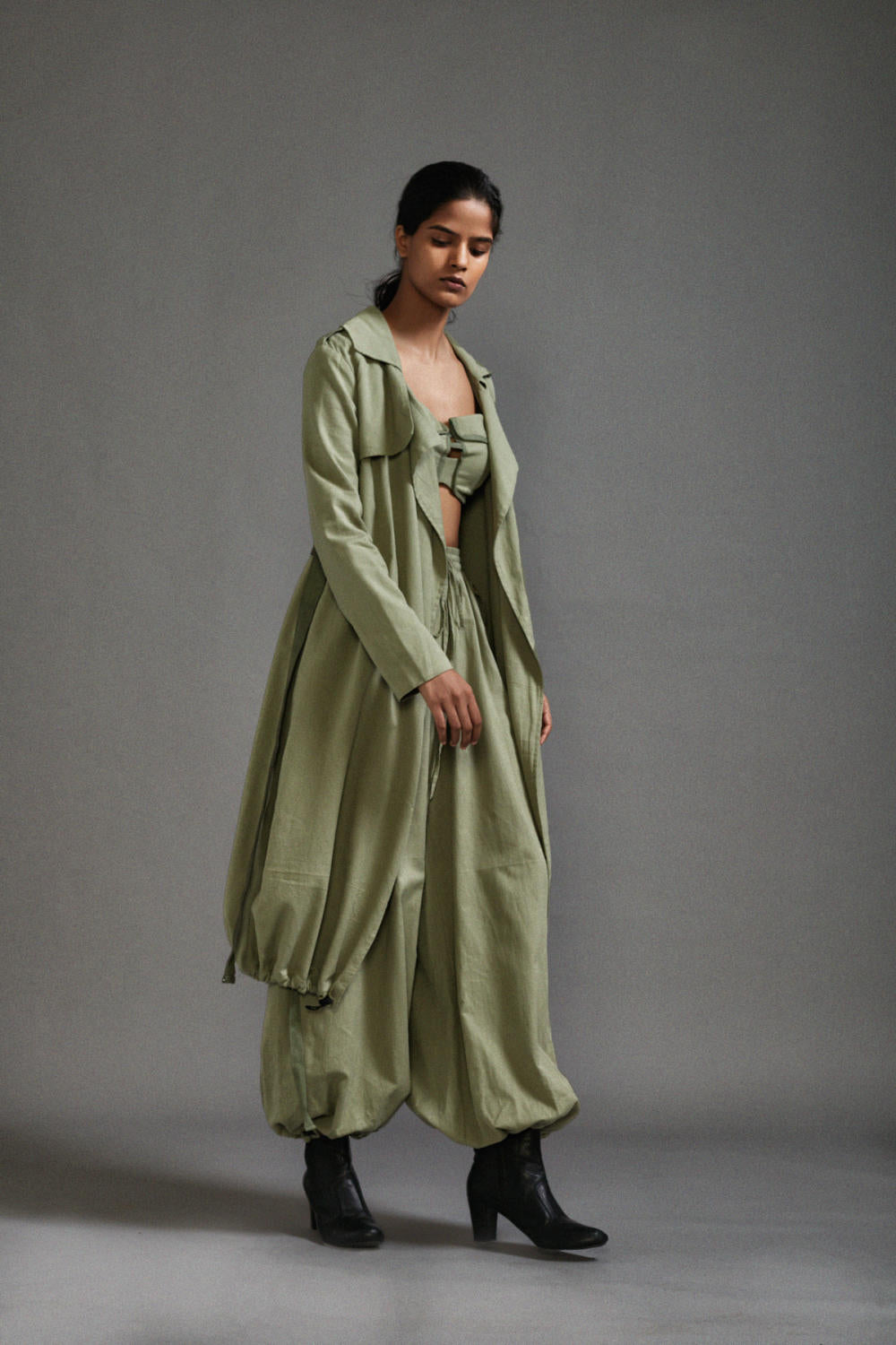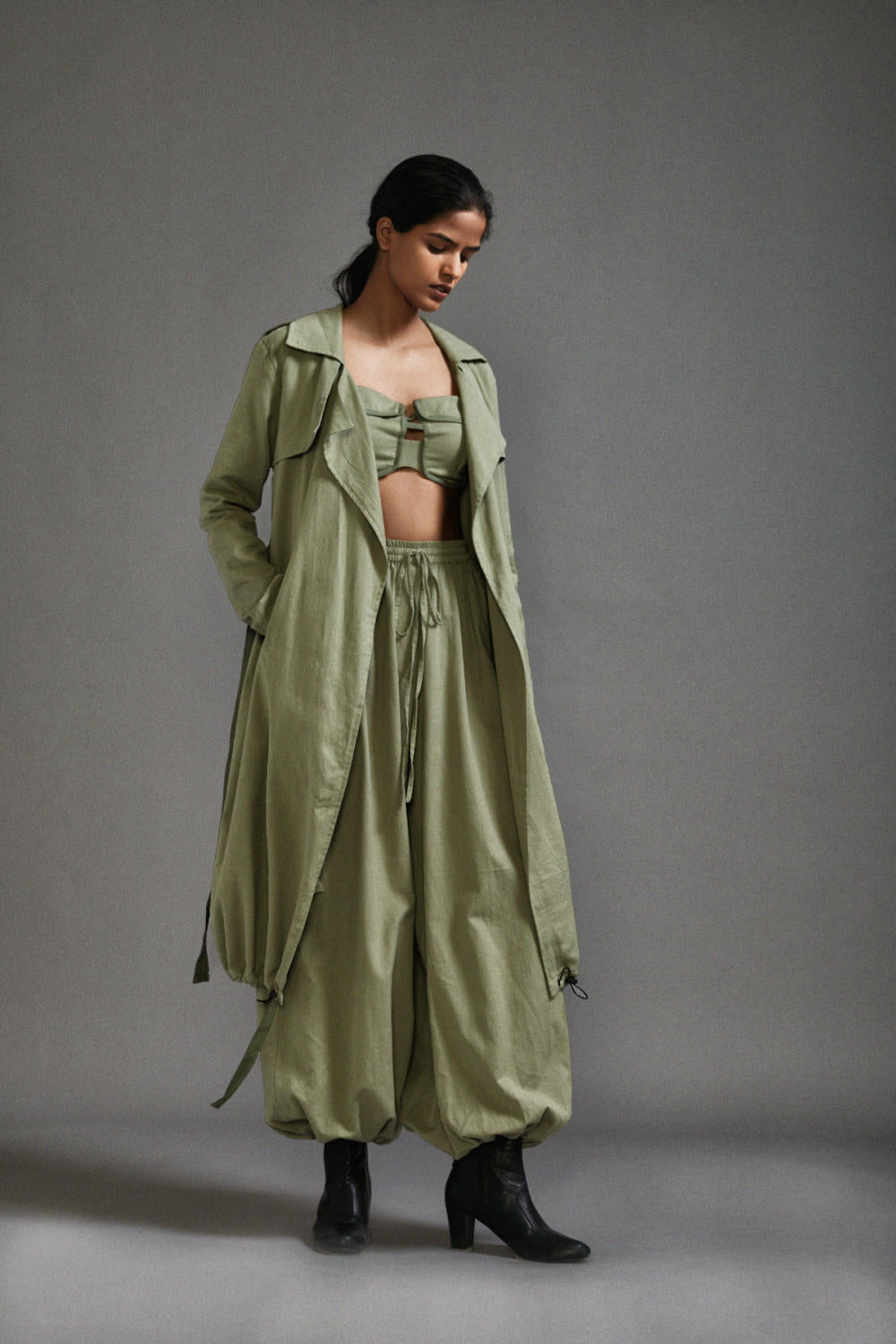 An Oversized-Trench jacket with elasticated hem, side pockets and canvas belt. Team it up with corset and bralette from our collection.
