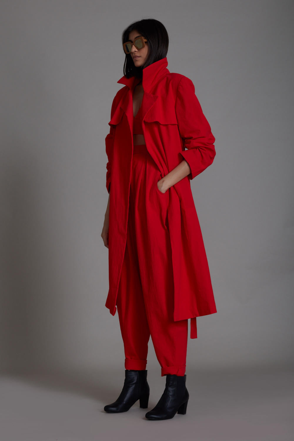 Jacket: A long travel trench jacket with full sleeves and side pockets.
