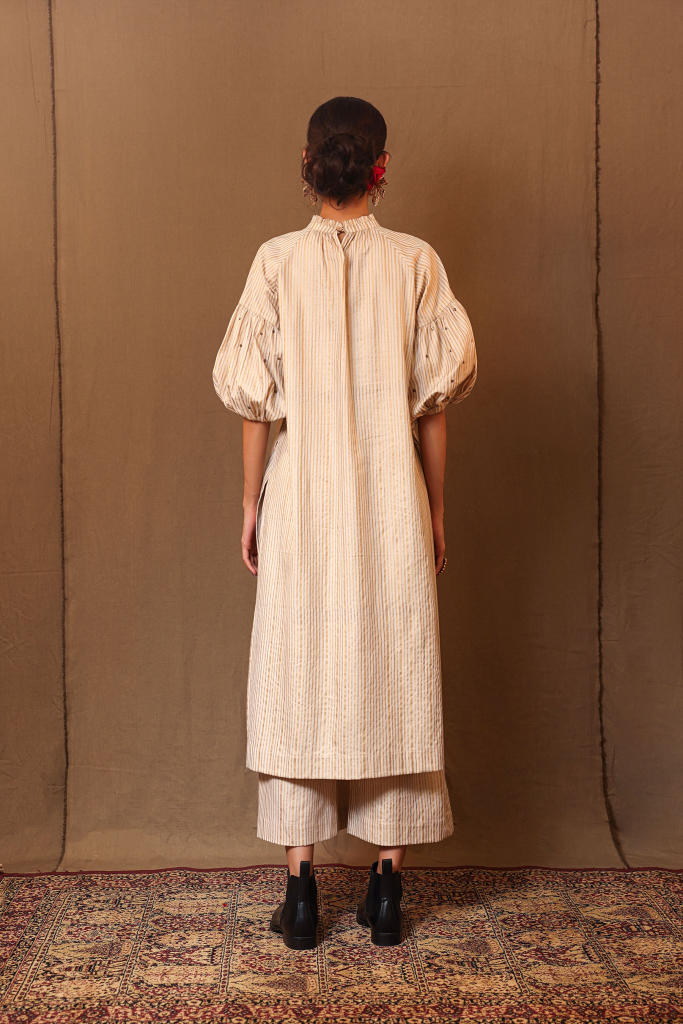 Aari work and sequence hand embroidered club motif on high neck raglan tunic with balloon sleeves. Metallic striped print all over the handspun cotton fabric lending it the festive look. Team it up with the matching stripe pants from the collection to complete the look.