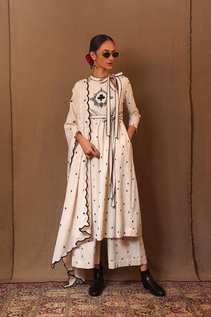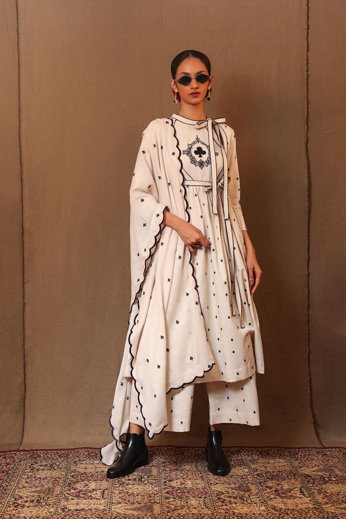 Angrakha style tunic hand embroidered on handspun cotton. Side zip opening bow tie at the neckline. Complete this look with the matching Re Pants from the collection