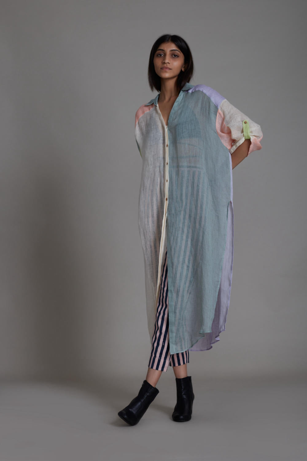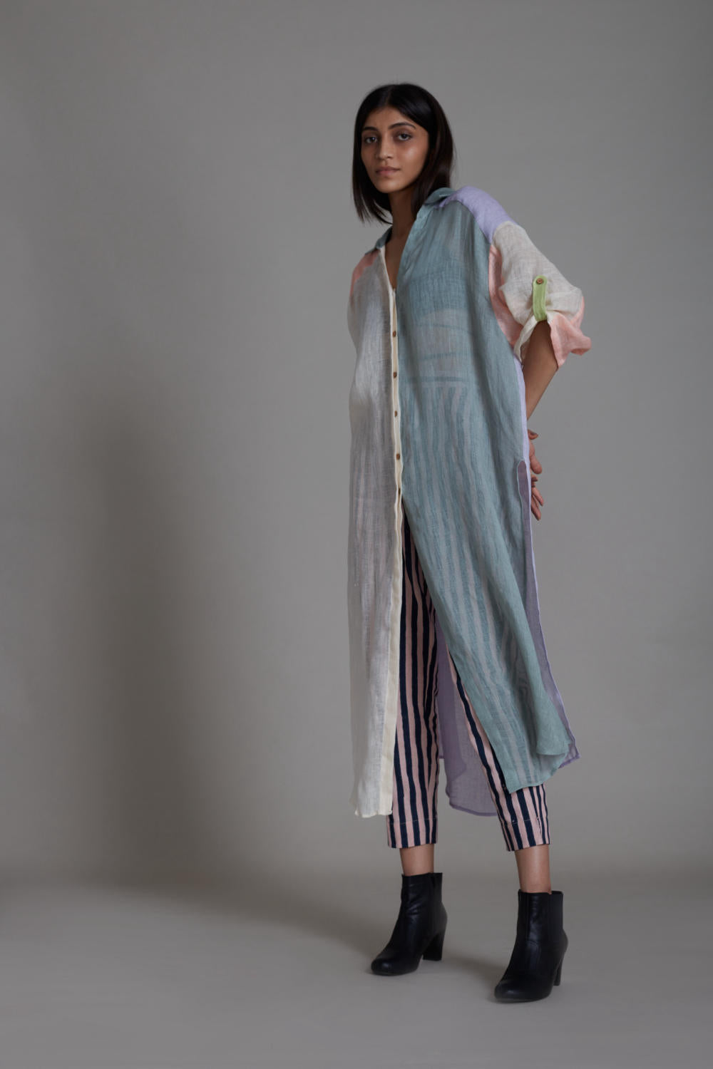 This Colour block pure linen shirt is a perfect definition of style and ease. The v-neck button detailing and the play of color are perfect for an edgy festive look. Wear it with your denim or get our stripe pants from the collection to complete the look. Handwoven cotton black bralette inner comes with the set.