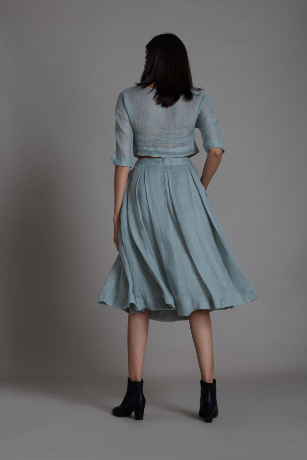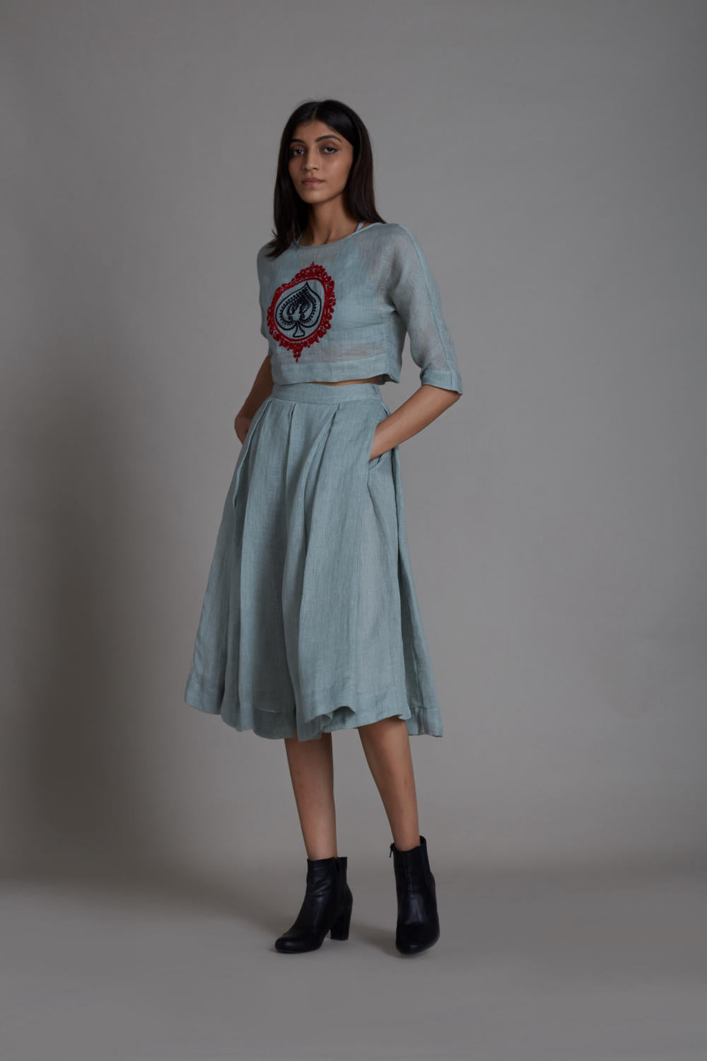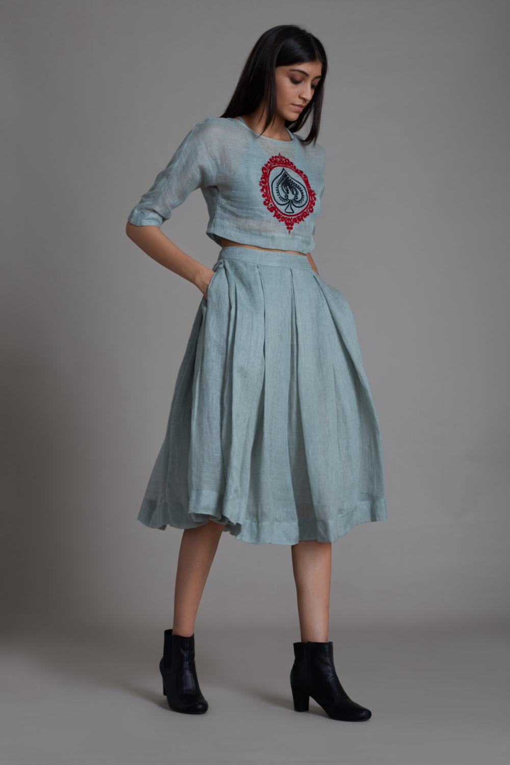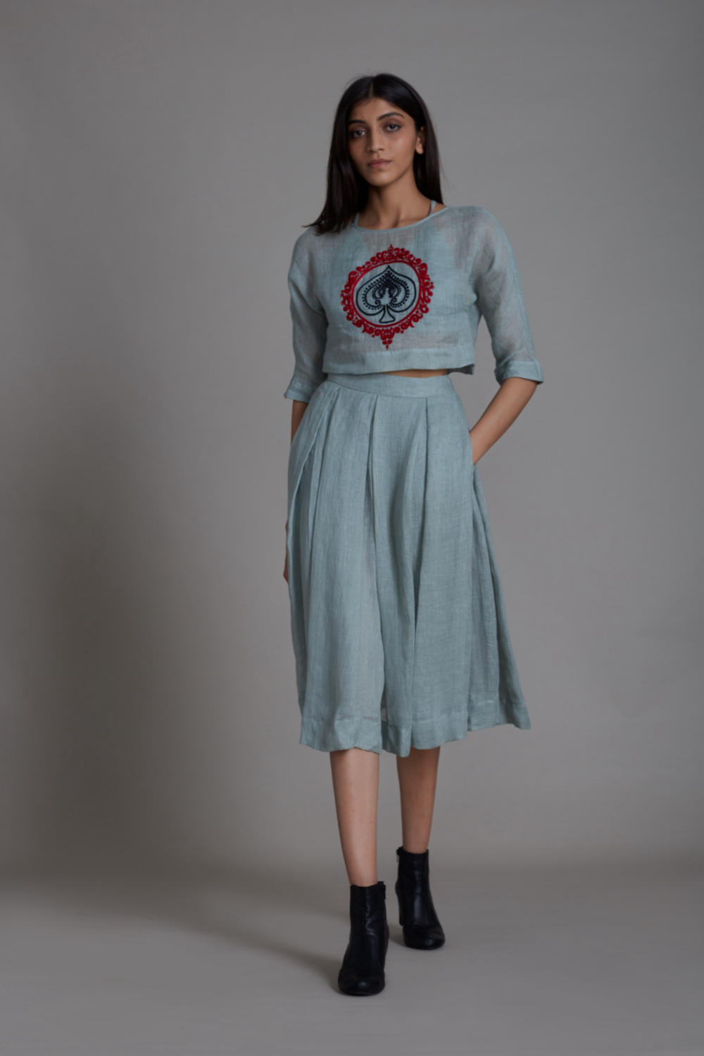 Style it solo or layer it, this pure linen top has intricate thread hand embroidery. You can pair it with skirts or with the range of pants from our collection. Comes with handwoven cotton bralette.