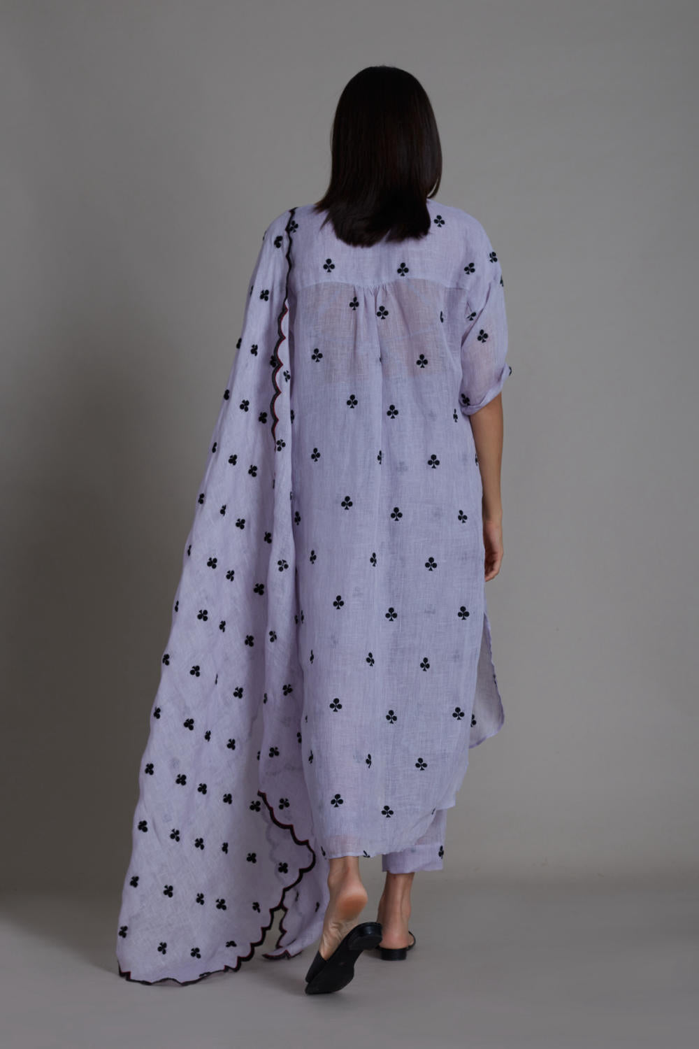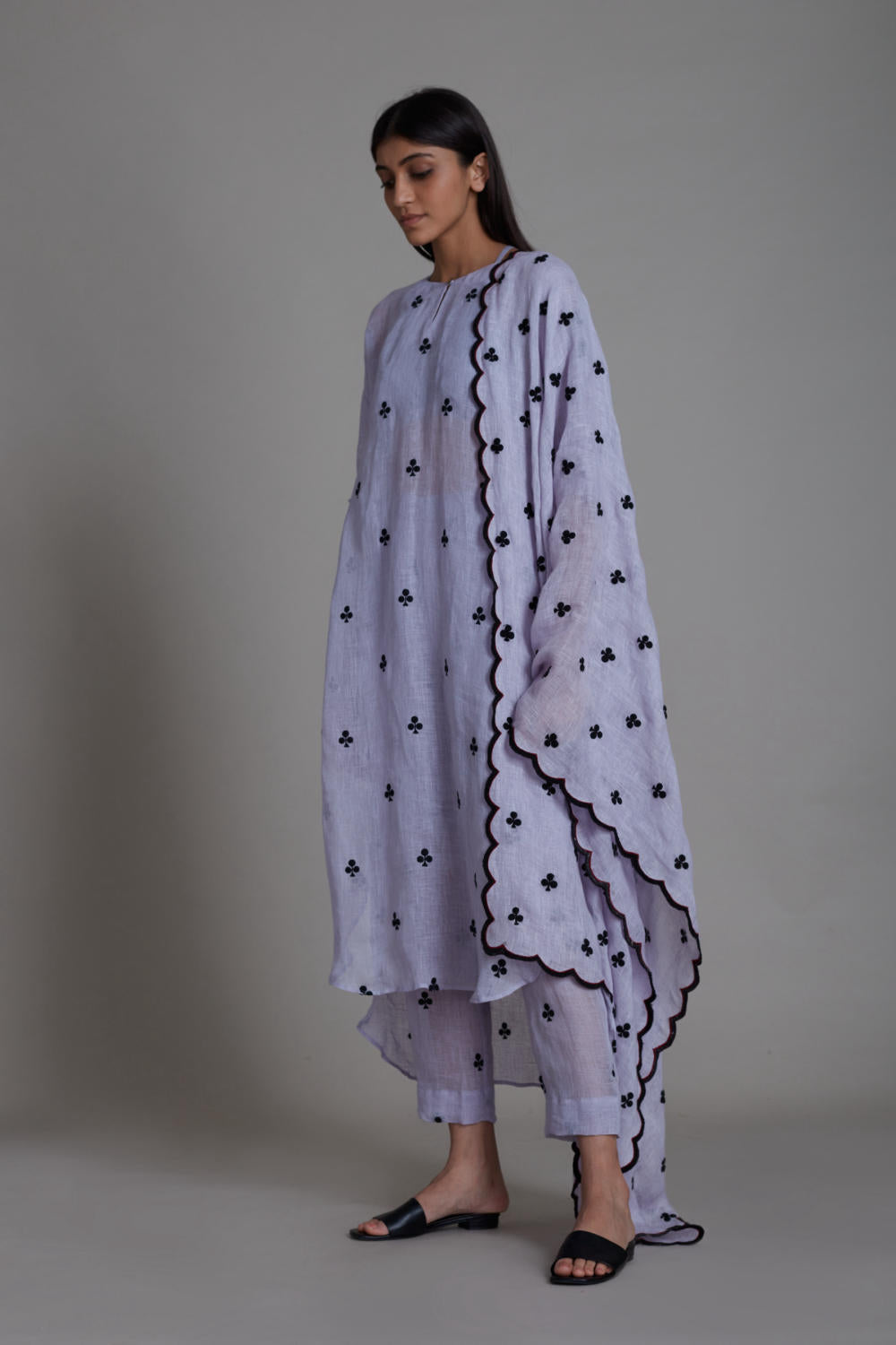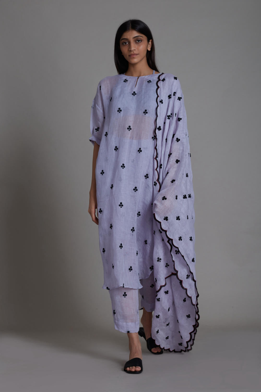 This beautiful set is all that you need for daytime festivities. The pure linen all-over embroidered apple cut set with detailing on the kurta and scallop embroidery on the stole brings elegance and class to the outfit. Pair this set with statement earrings and potli bag to complete the look.(SET OF 3, TUNIC, STOLE and PANTS, handwoven cotton bralette inner comes with the set)
