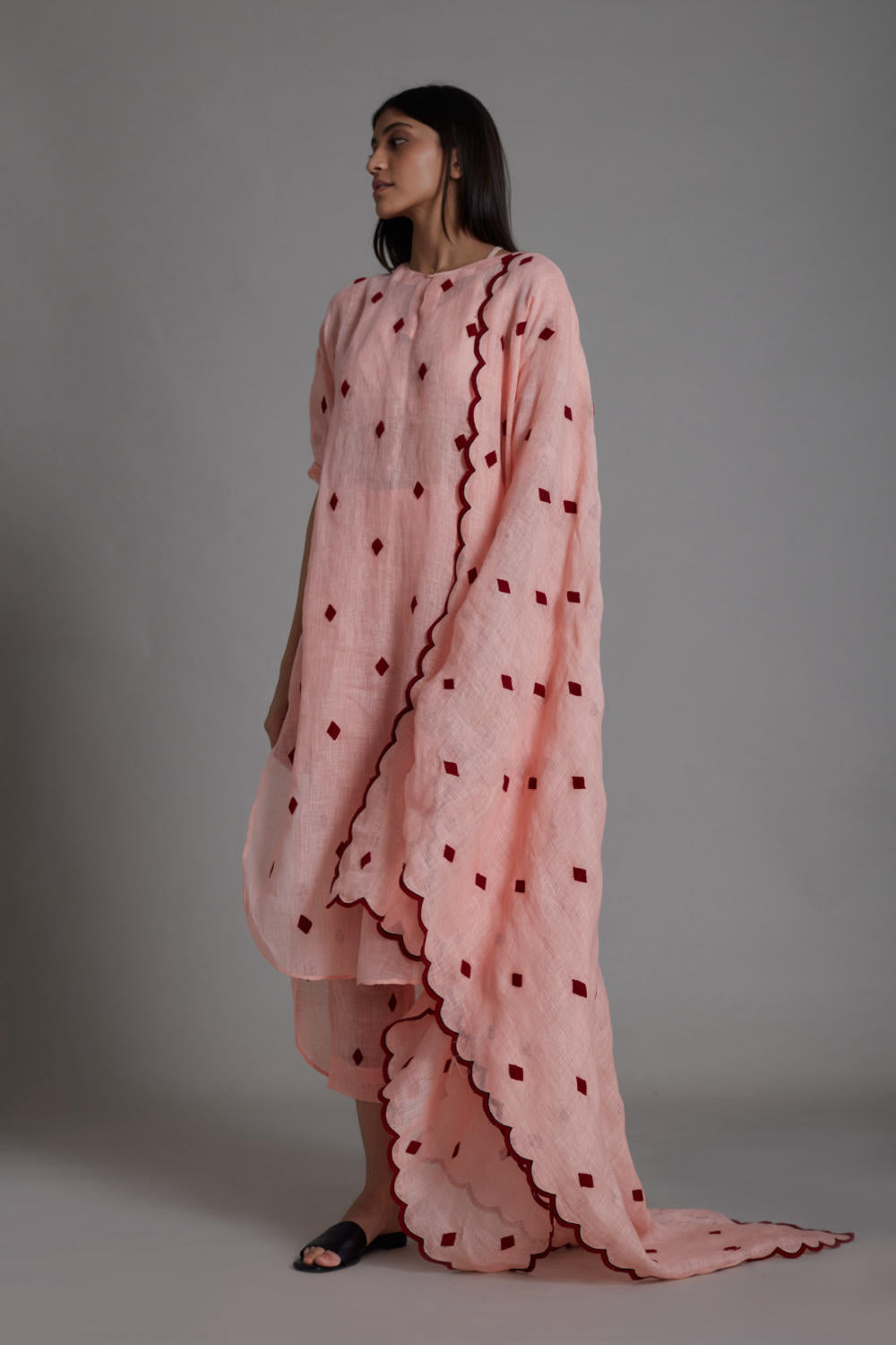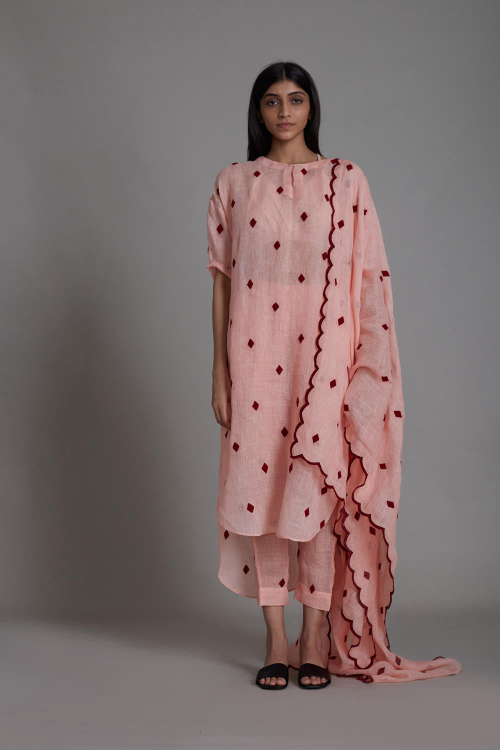 This beautiful set is all that you need for daytime festivities. The pure linen all-over embroidered apple cut set with detailing on the kurta and scallop embroidery on the stole brings elegance and class to the outfit. Pair this set with statement earrings and potli bag to complete the look.(SET OF 3, TUNIC, STOLE and PANTS, handwoven cotton bralette inner comes with the set)