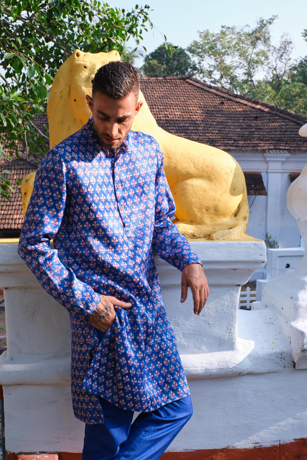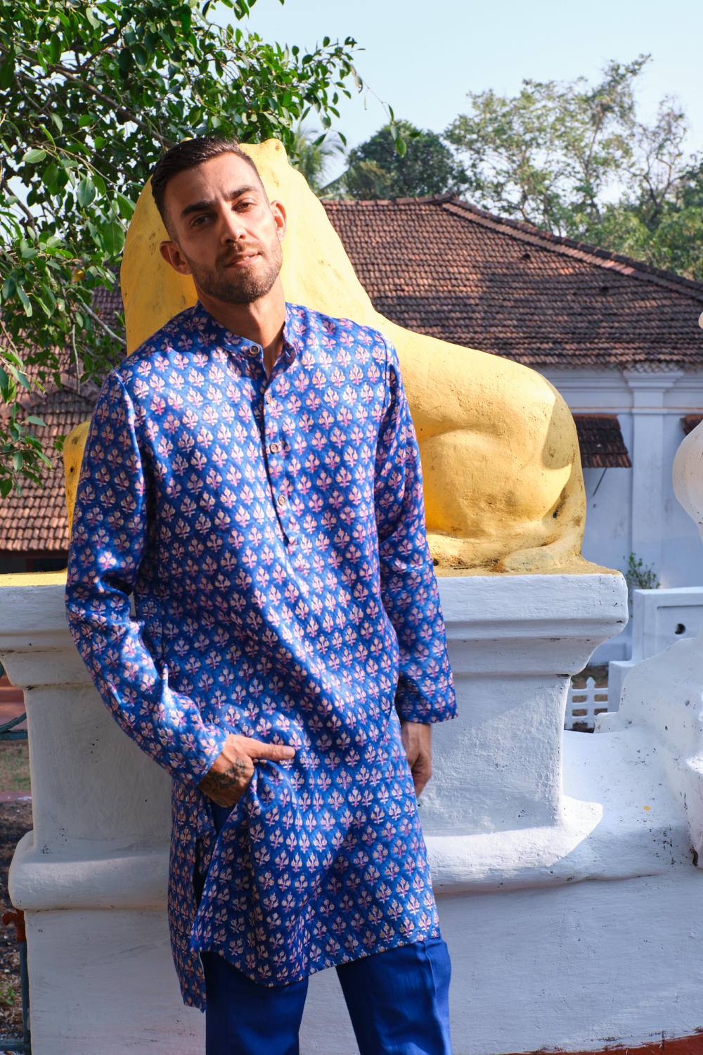 Handcrafted in Mashru silk, this kurta features tiny blooms, handblock printed in hues of indigo. The kurta features a slim collar and matching drawstring pyjamas. This set consists of the kurta and the pants. We believe customers have a right to know how their product was made. Each kurta is made out of 3.75 metres of Mashru silk and each pant is made in 2.75m of tussar staple fabric sourced from Gujarat has been used for this piece. Hand-block printed in Jaipur. Hand embroidered and manufactured at our workshop in Pune, India. This product is crafted in Jaipur, India using the traditional artisan technique of hand-block printing, and is hand embroidered by our skilled artisans in Pune. Subtle variations in patterns are natural to this process. We believe this makes each creation unique and charming. Some call it je ne sais quoi. We call it JODI.