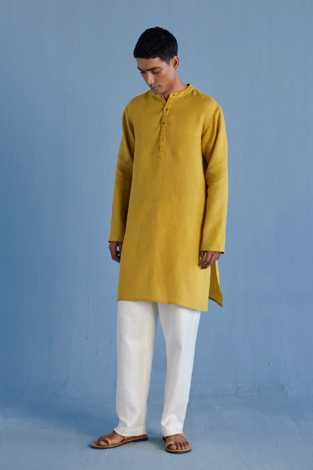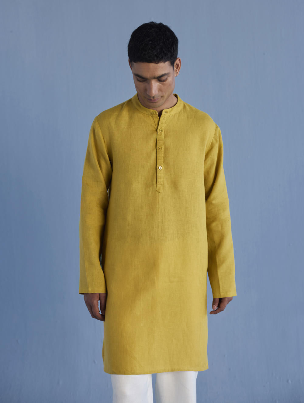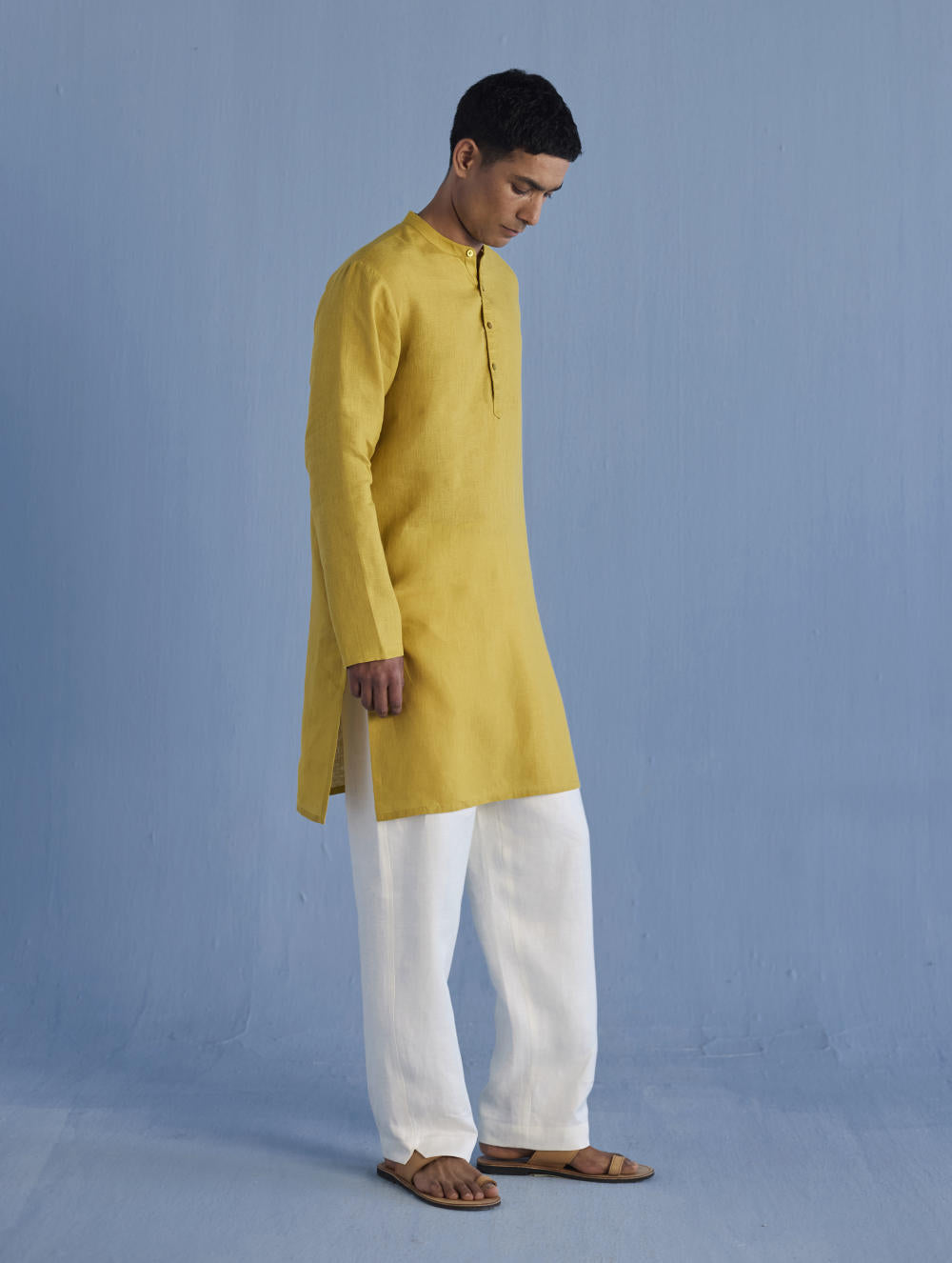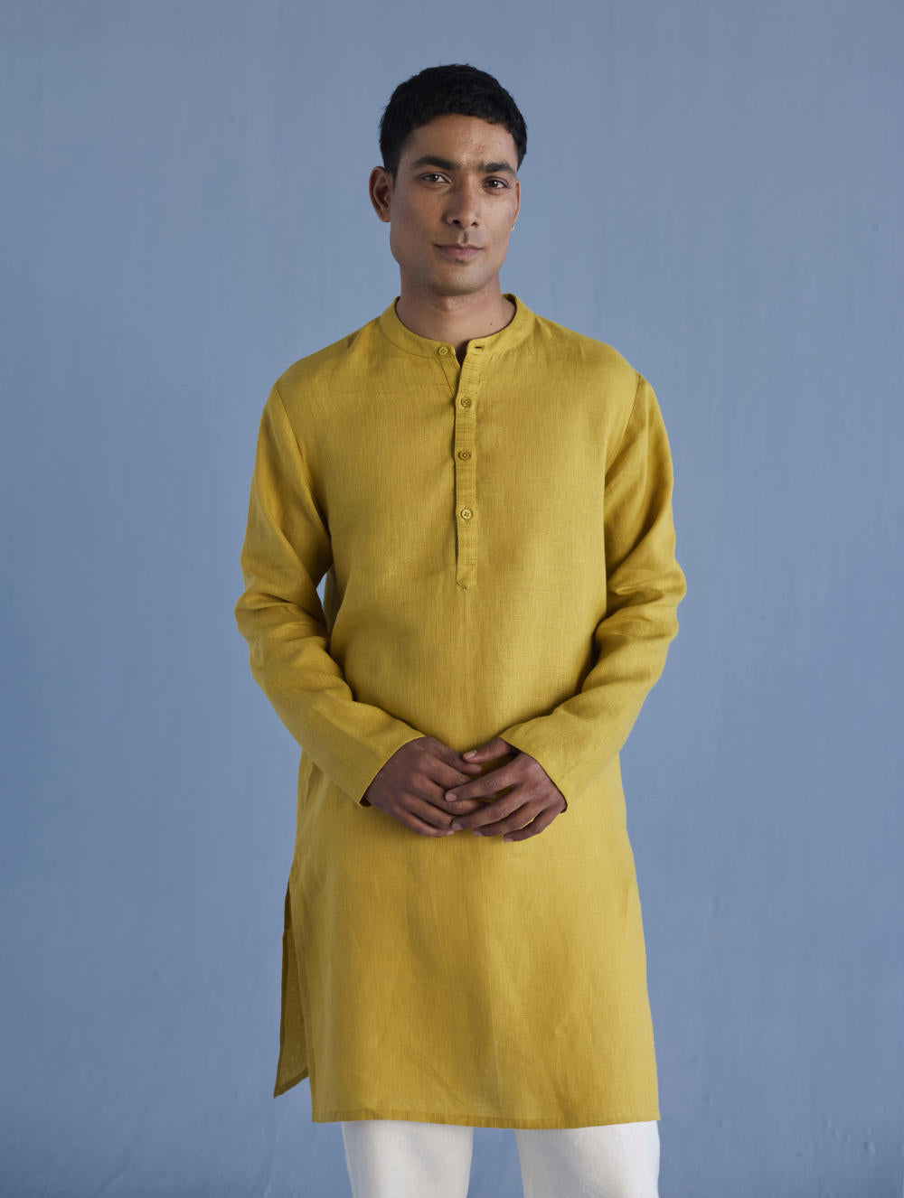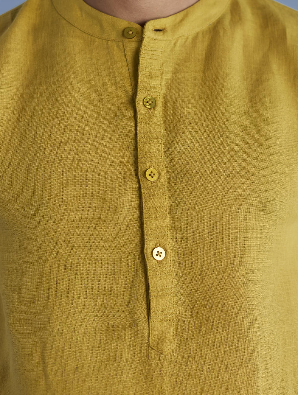 A classic mandarin collared shirt in soft pure yarn-dyed linen with fine hand pintucked details on the placket finished with tonal hand dyed buttons. Easy-to-wear and pair with denims or classic linen pants. Tailored thoughtfully for easy wearability and breathability.