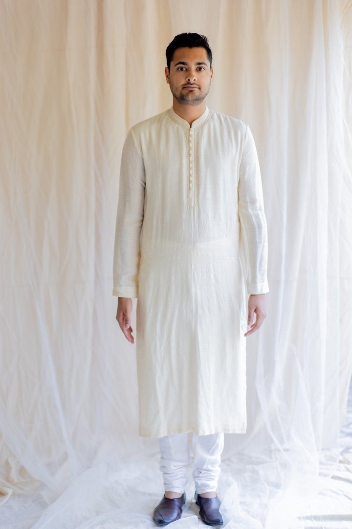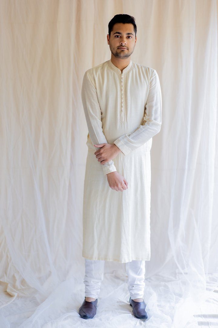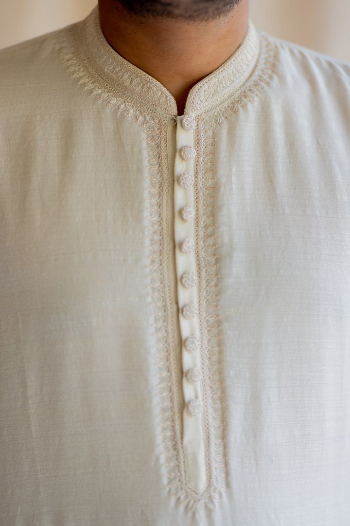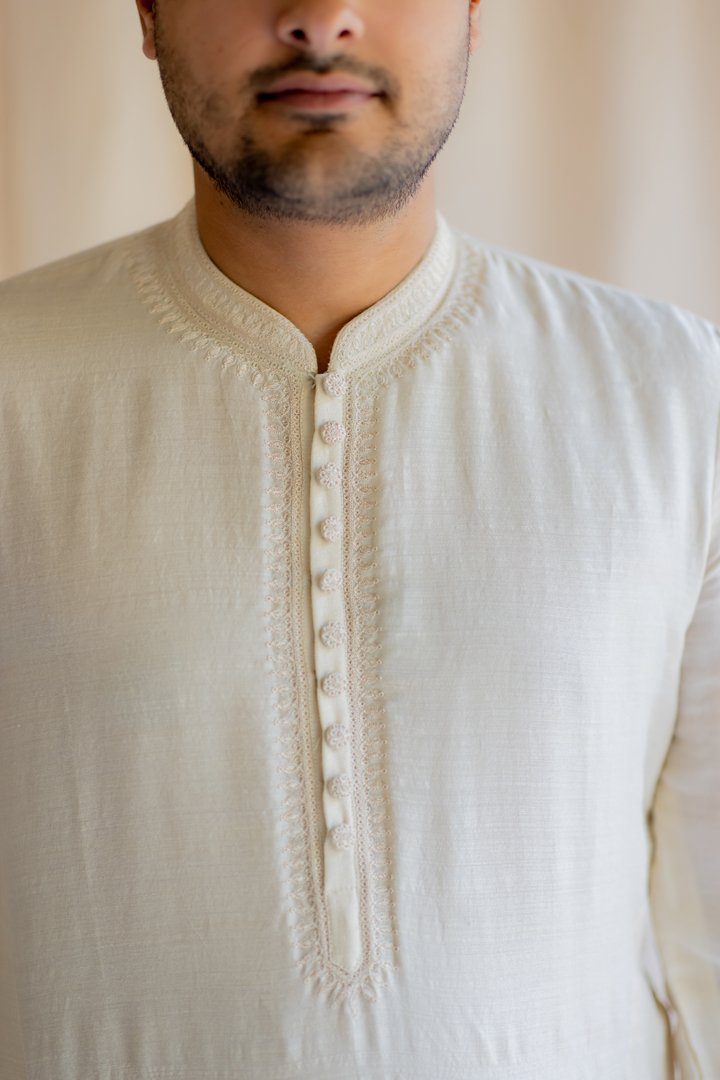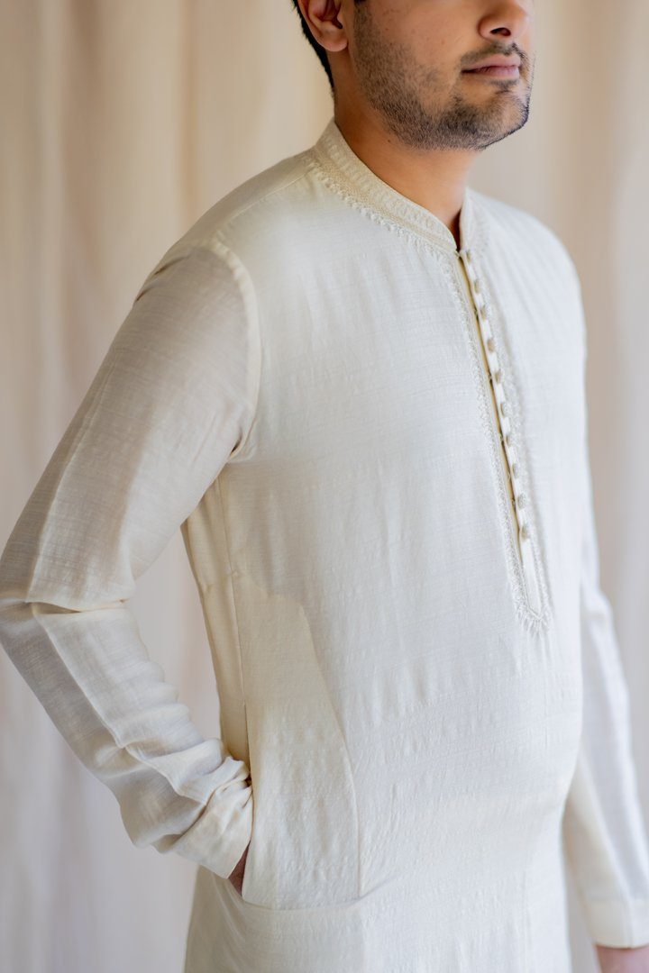 Long-sleeved kurta with embroidered collar patti, fastened in the middle with buttons.