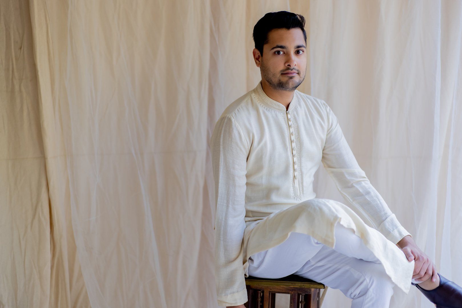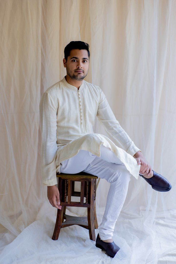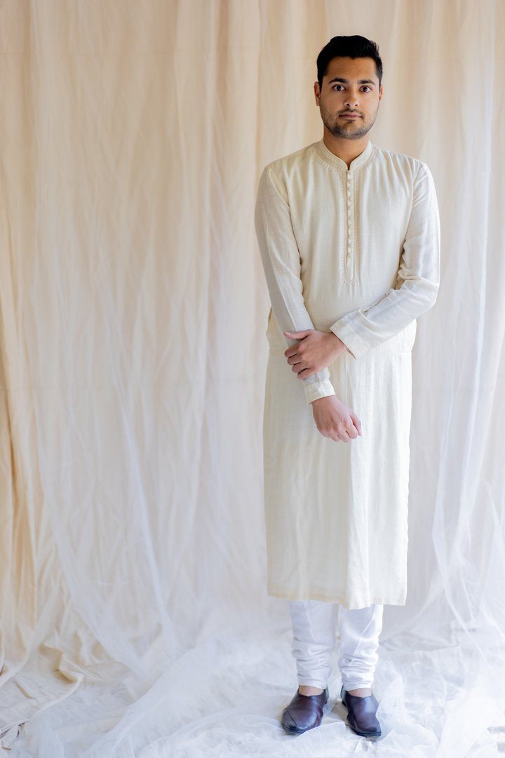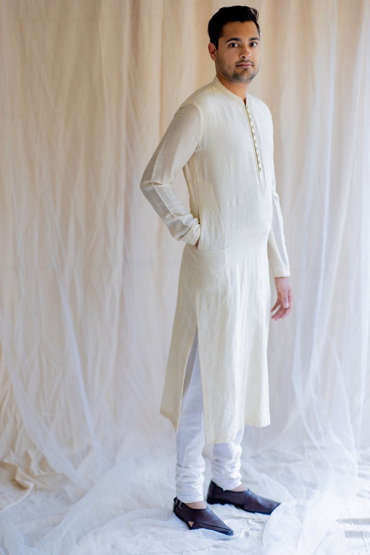 Long-sleeved kurta with embroidered collar patti, fastened in the middle with buttons.