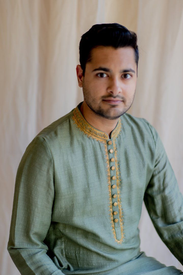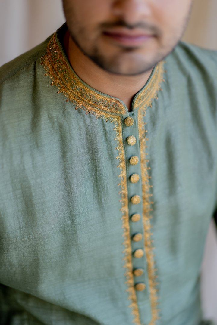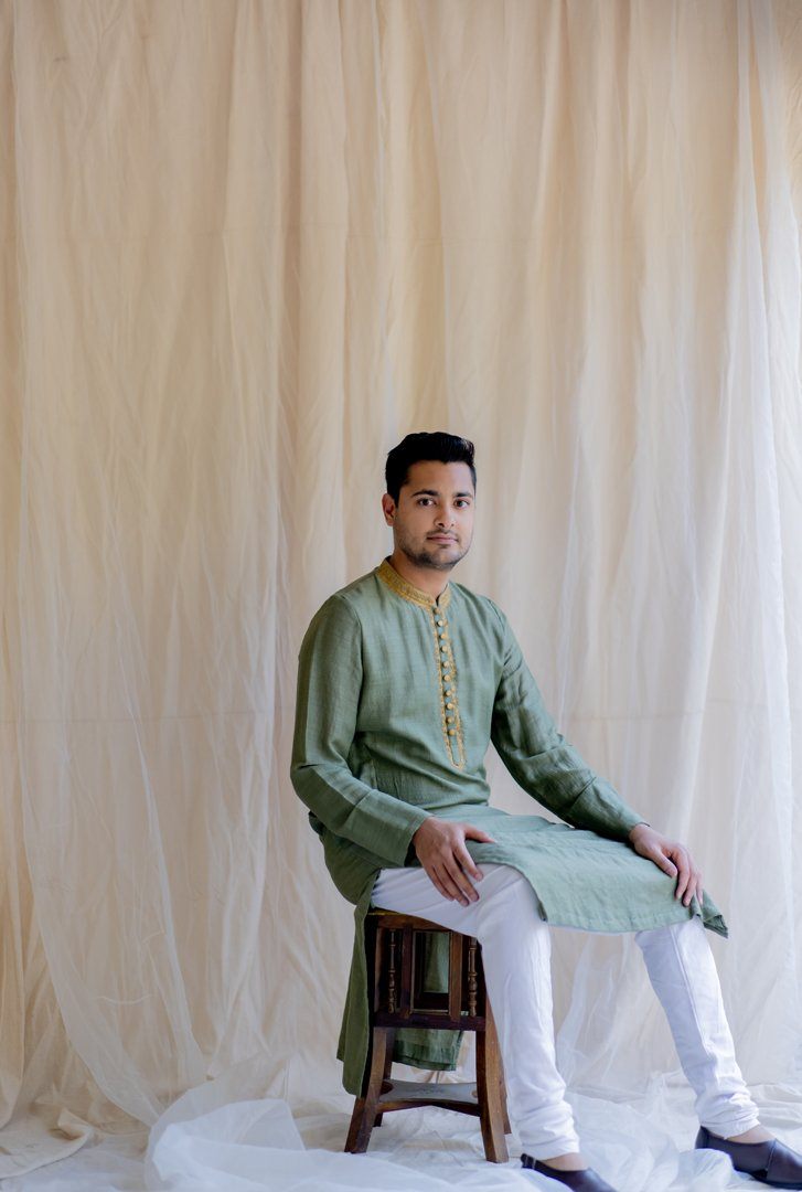 Long-sleeved, knee length coat with band collar, for men fastened in the middle with buttonsLong-sleeved kurta with embroidered collar patti, fastened in the middle with buttons.