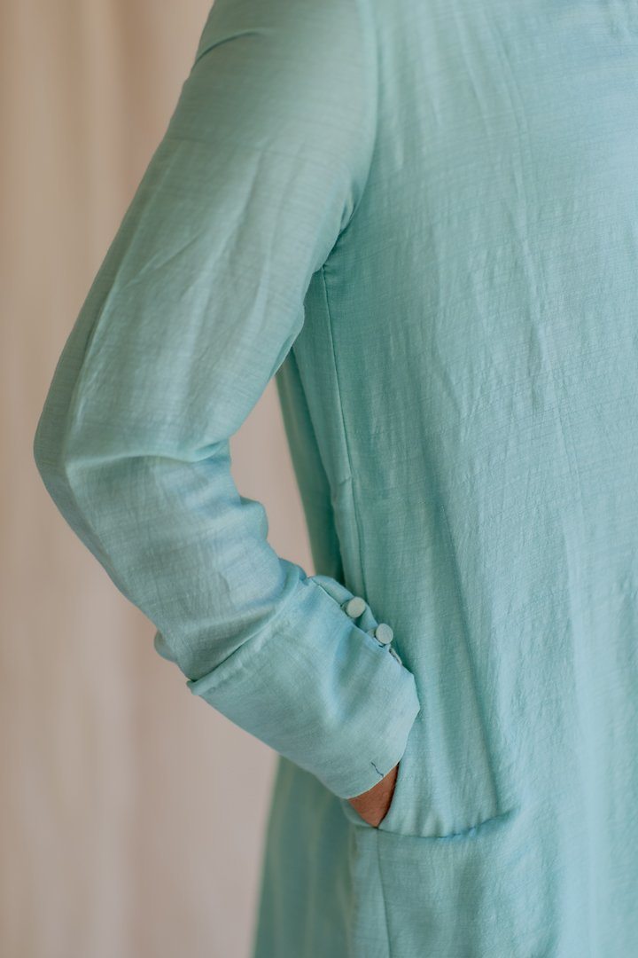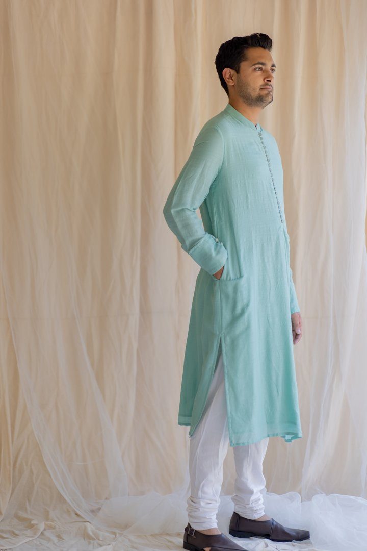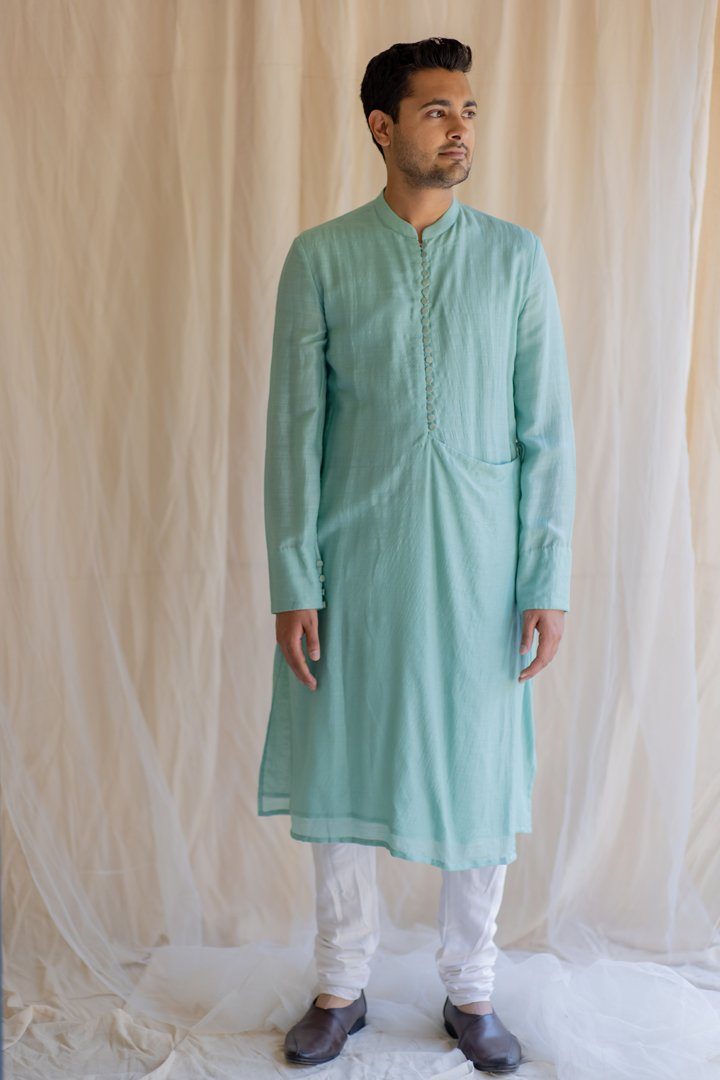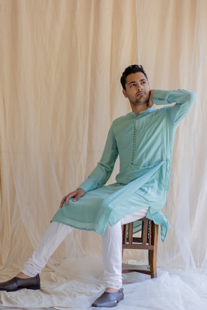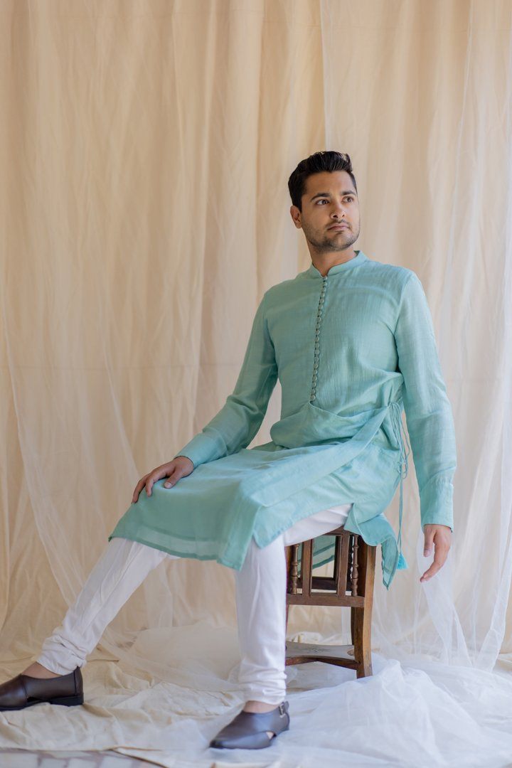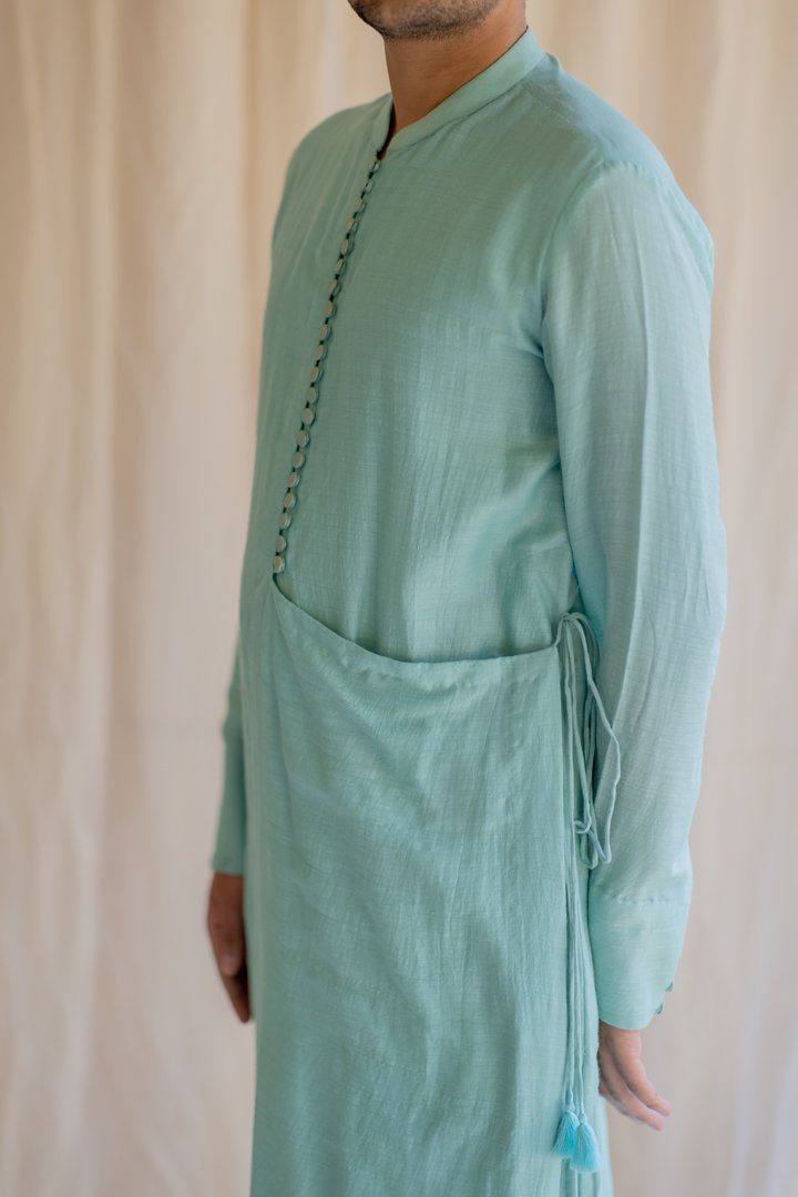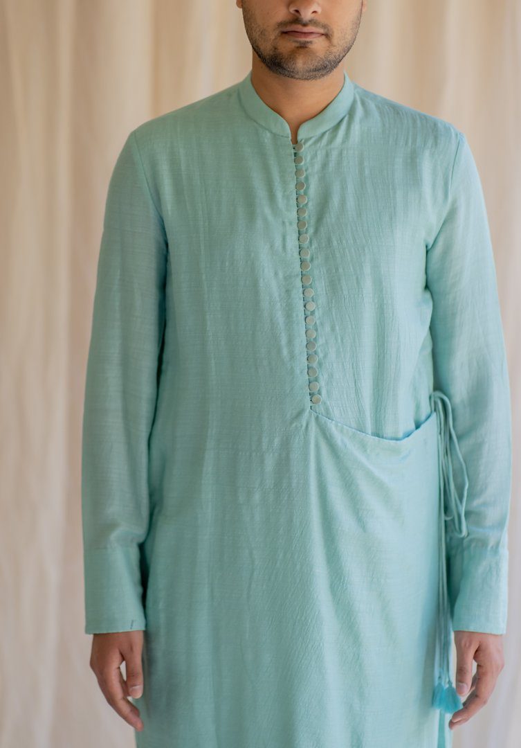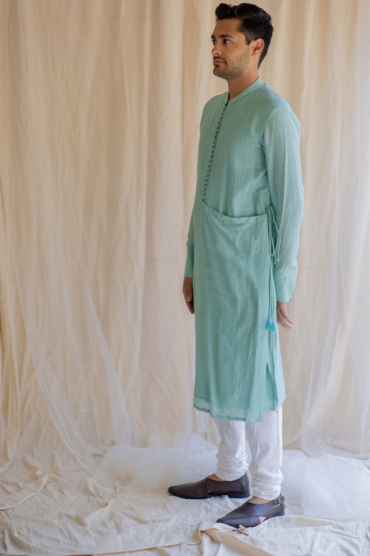Knee-length coat for men. Upper half is similar to a western style coat and lower part resembles an angrakha. Buttoned down Angrakha with tie up at the waist.