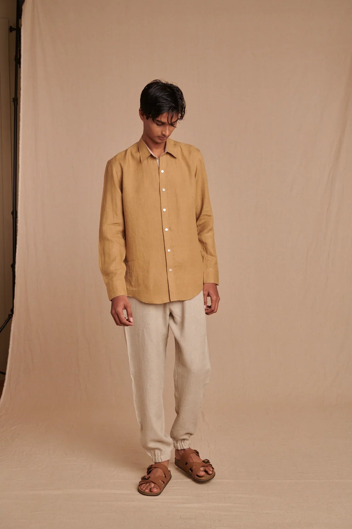 Structured yet easy, this shirt is tailored from 100% linen in a classic oxford style. The concealed striped facing adds a quiet layer of depth, while mother-of-pearl buttons elevate the everyday. Designed for clarity and comfort — it moves from weekday formality to weekend lightness with ease.