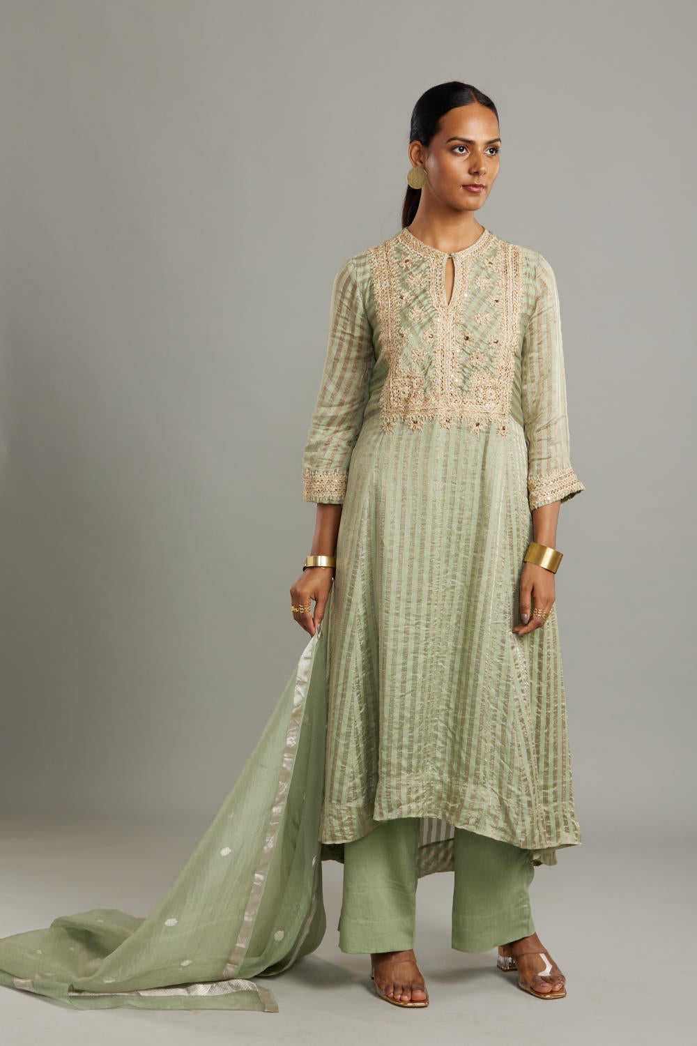 Banarsi stripe kathiawadi embroidered square yoke kurta with Solid pants and butti dupatta
