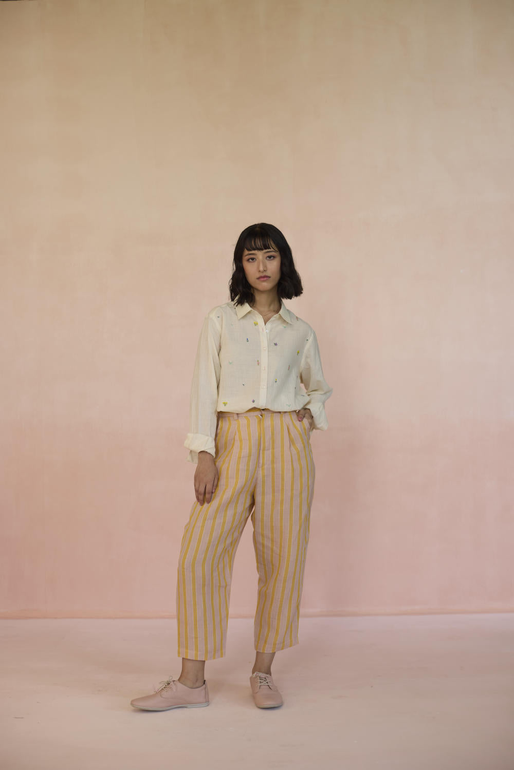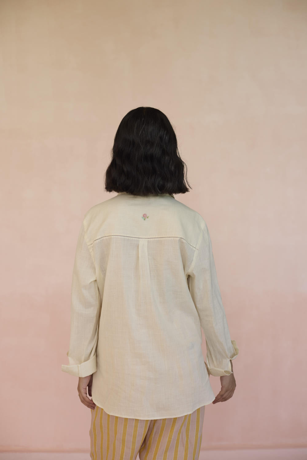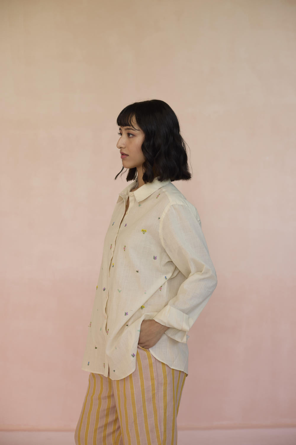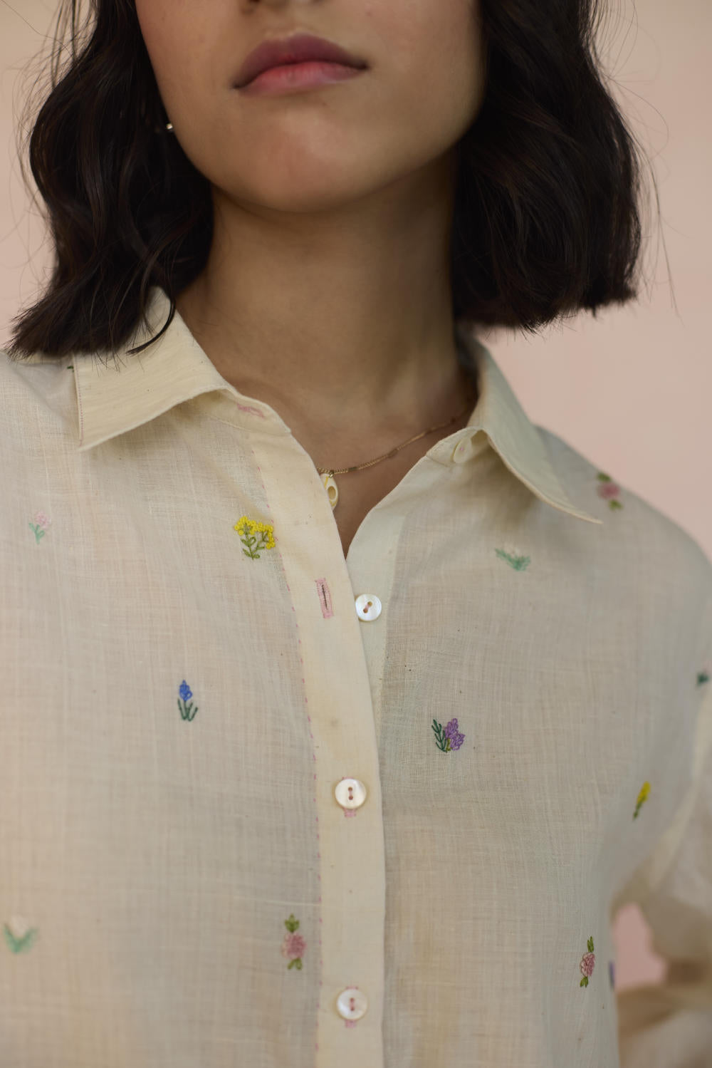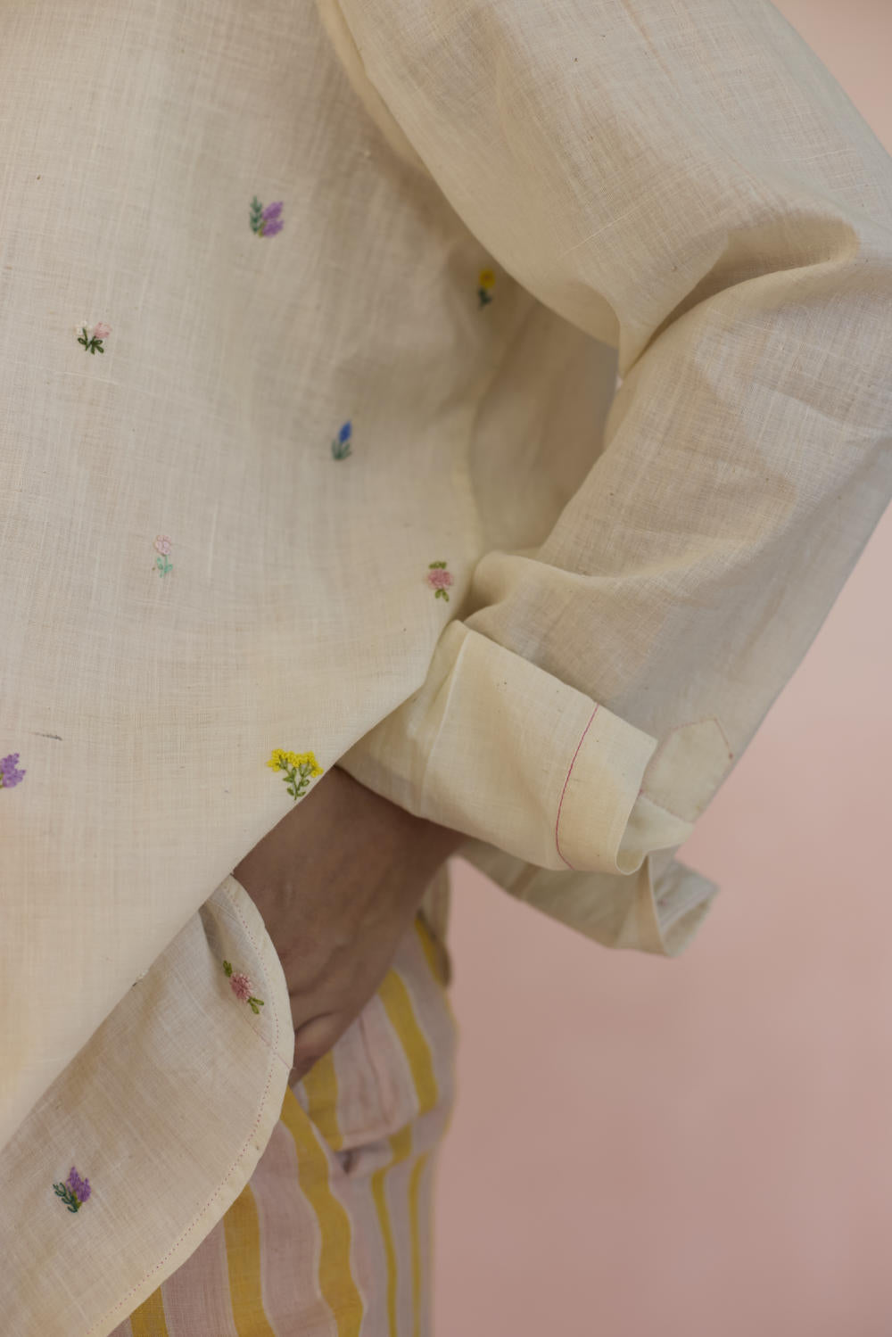 Our handwoven Ditsy cotton shirt is a perfect blend of traditional craftsmanship and elegance. The shirt features delicate hand-embroidery lending it a timeless appeal. Its natural texture and breathable quality, makes it an ideal choice for day time wear or an evening out. The shirt is made with 100% handspun, handwoven cotton that lends grace and form to the fabric. Hand-sewn shell buttons and hand-swen seams adds a touch of individuality. The soft, yet durable cotton drapes effortlessly, offering comfort without compromising on style. A perfect everyday wear making you stand out.