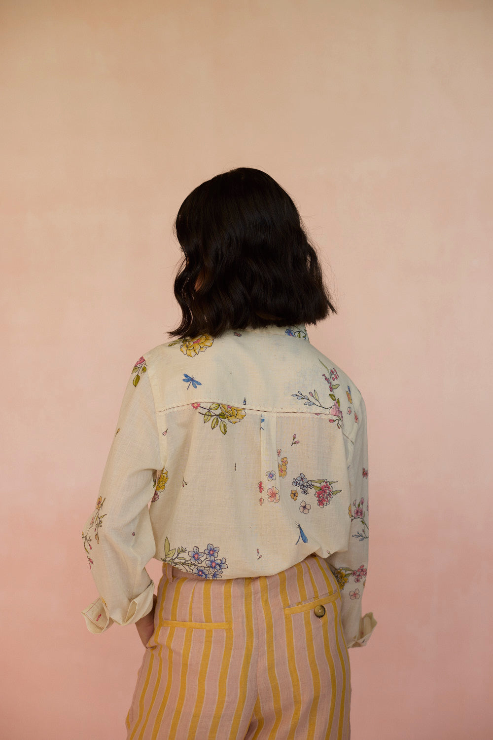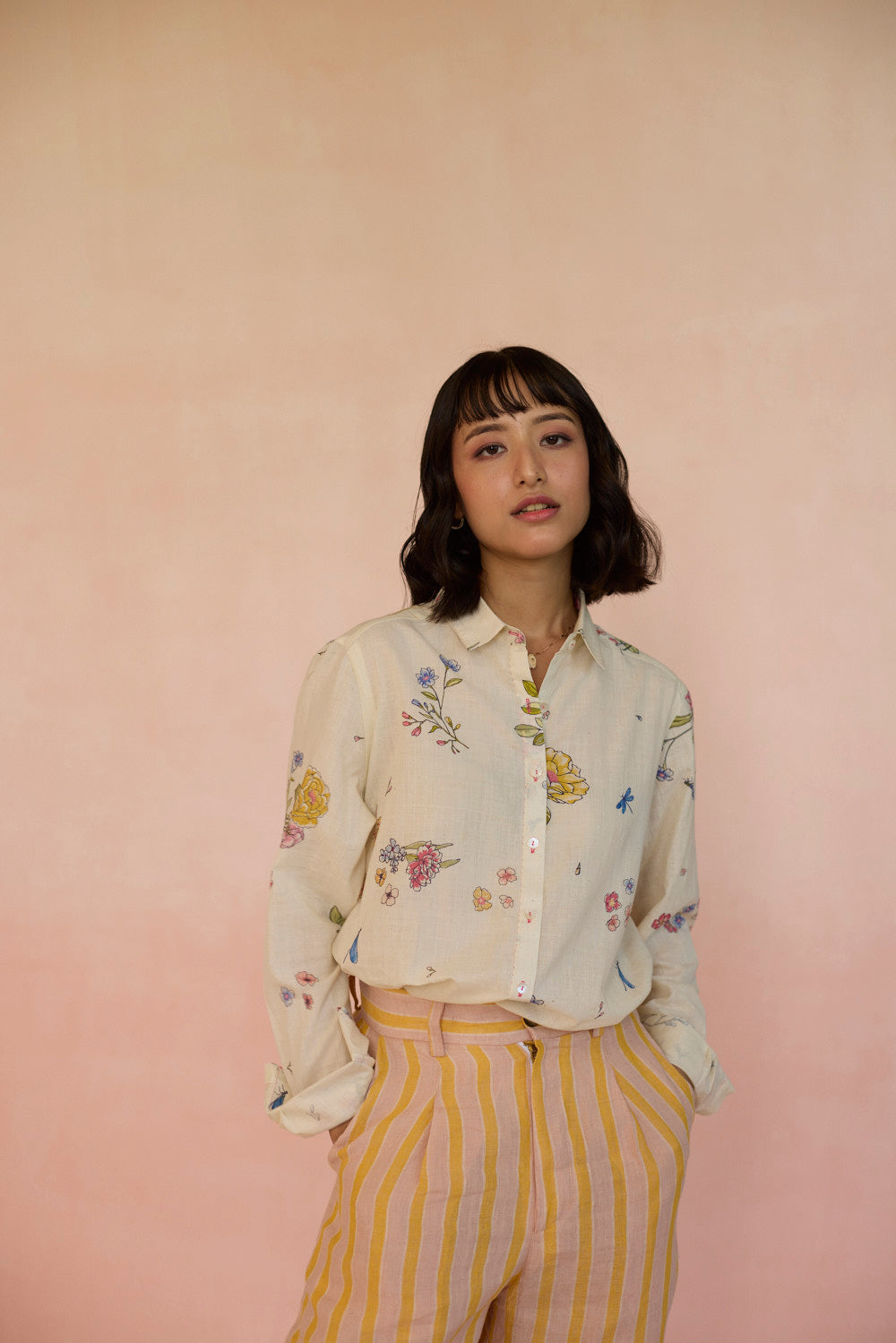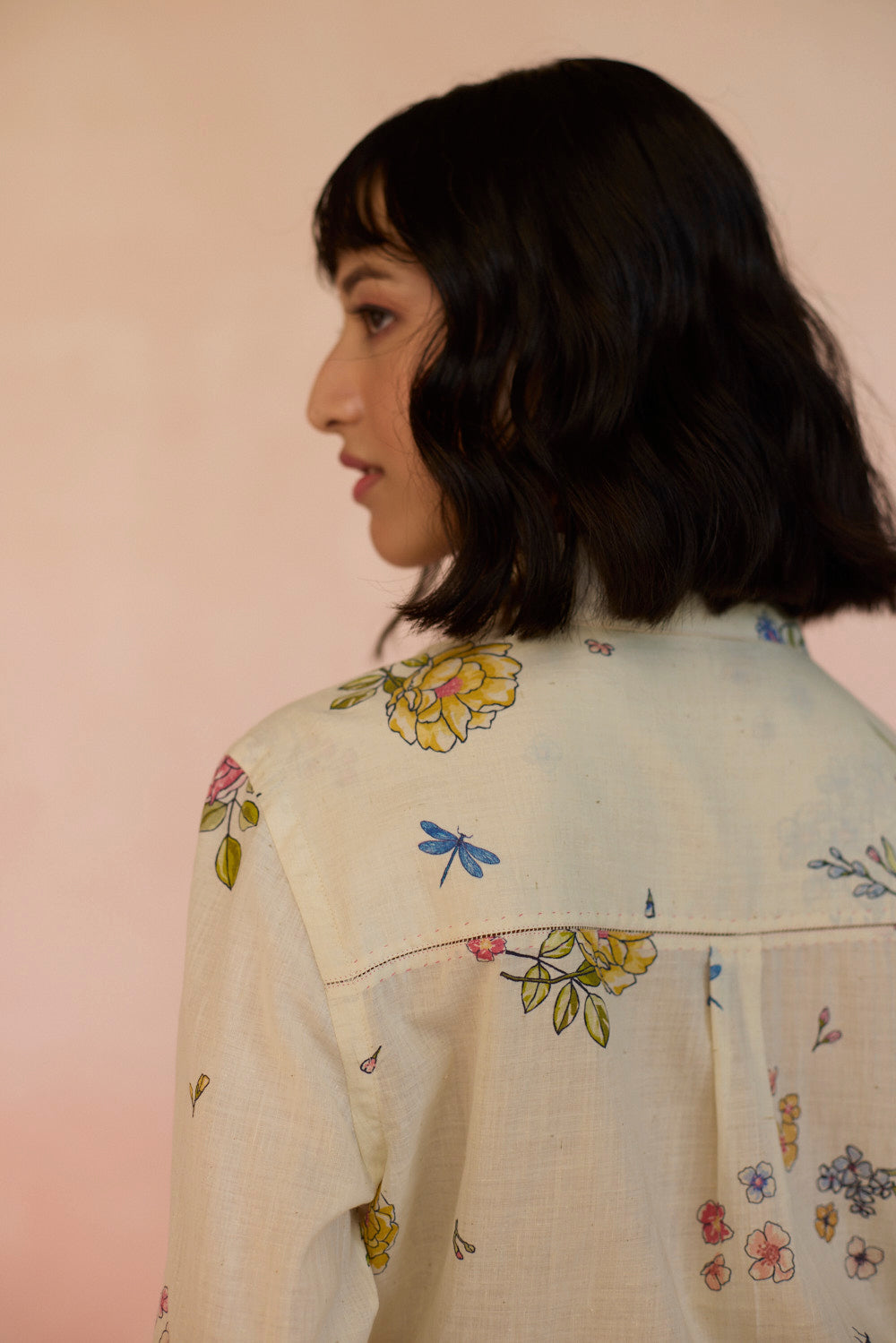 The Garden shirt has an exquisite range of flowers. With a bouquet of flowers from the garden carefully applied in pattern that showcases the flowers in full summer bloom. The shirt is made with 100% handspun, handwoven cotton that lends grace and form to the fabric. Hand-sewn shell buttons and hand-swen seams adds a touch of individuality. The soft, yet durable cotton drapes effortlessly, offering comfort without compromising on style. An easy, everyday wear for office and after-office.