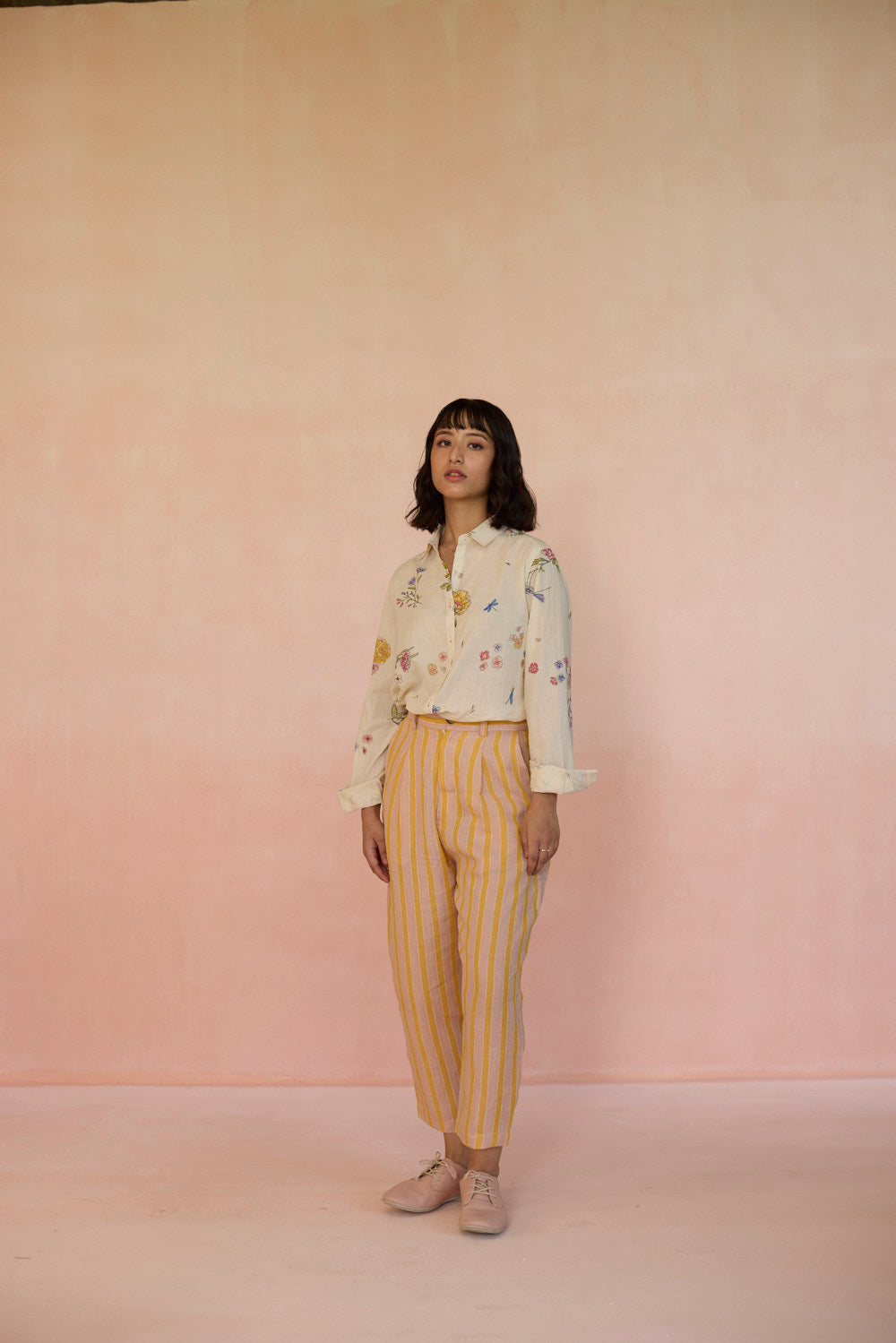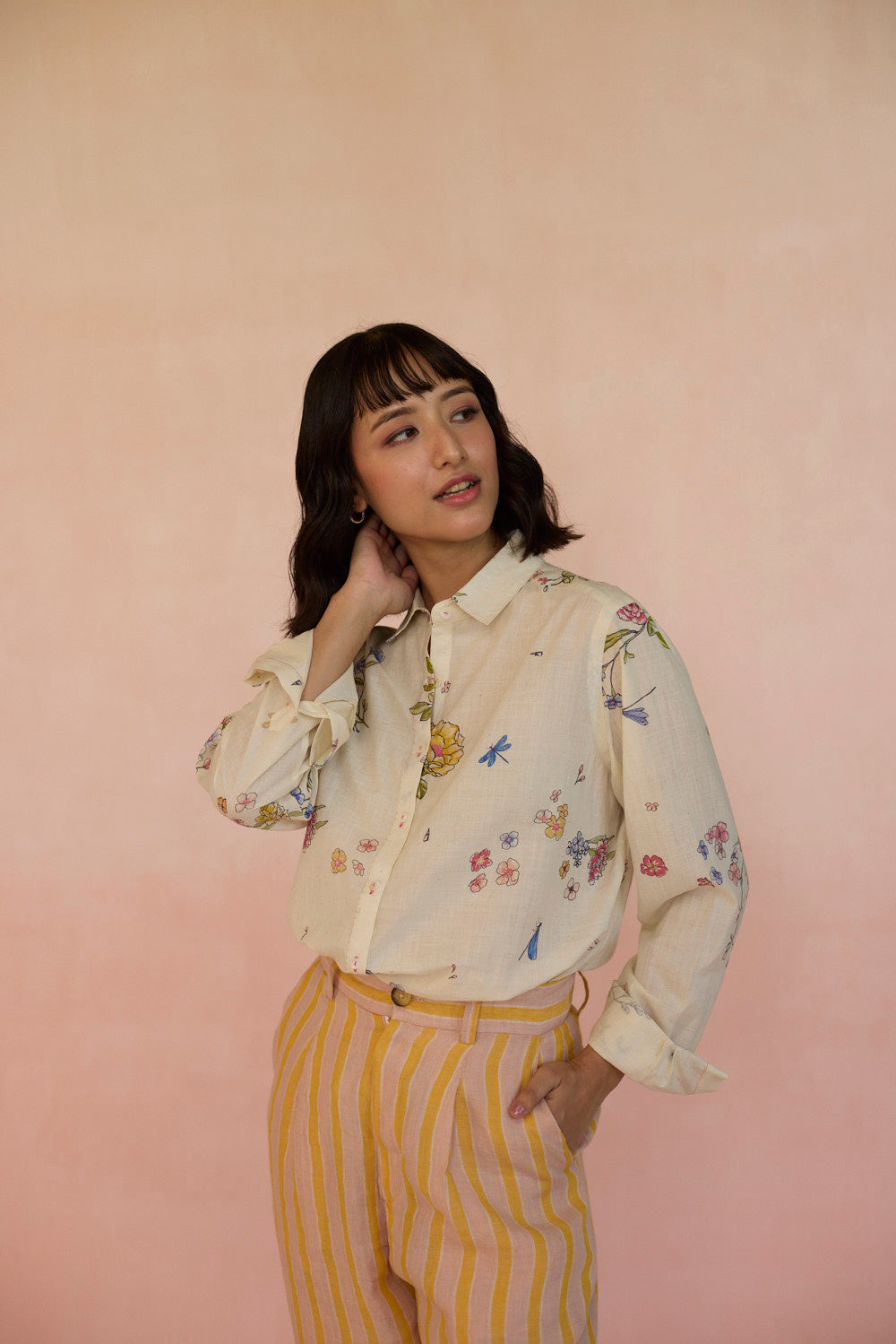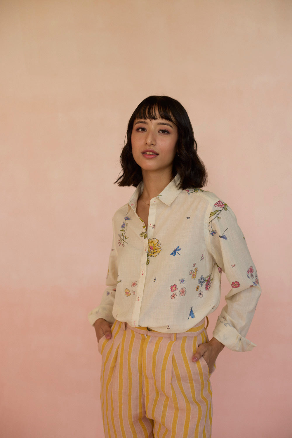The Garden shirt has an exquisite range of flowers. With a bouquet of flowers from the garden carefully applied in pattern that showcases the flowers in full summer bloom. The shirt is made with 100% handspun, handwoven cotton that lends grace and form to the fabric. Hand-sewn shell buttons and hand-swen seams adds a touch of individuality. The soft, yet durable cotton drapes effortlessly, offering comfort without compromising on style. An easy, everyday wear for office and after-office.