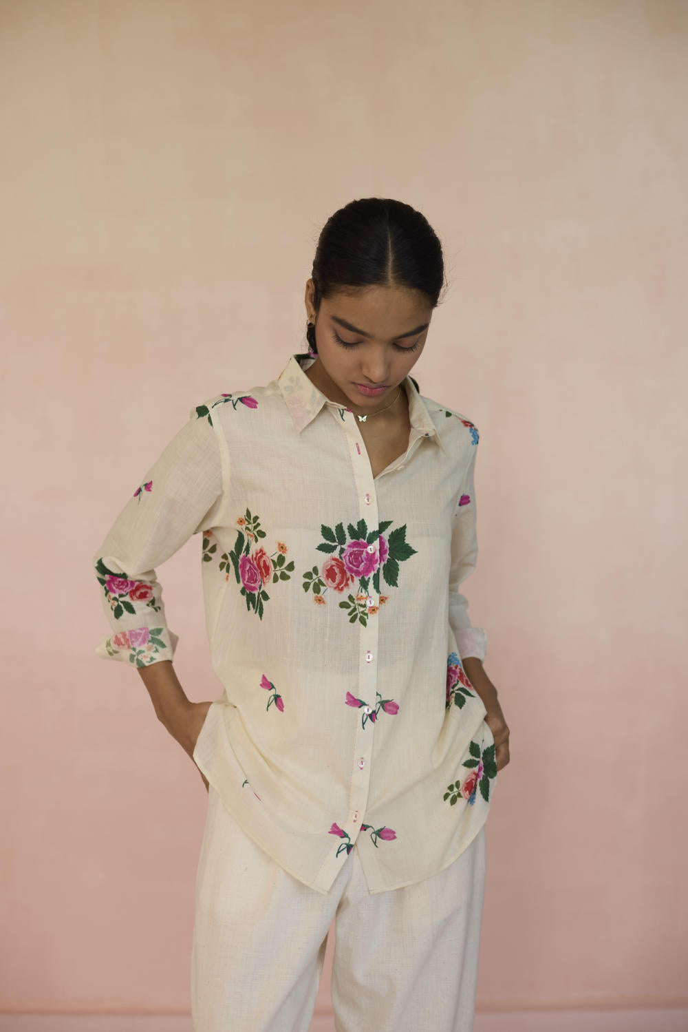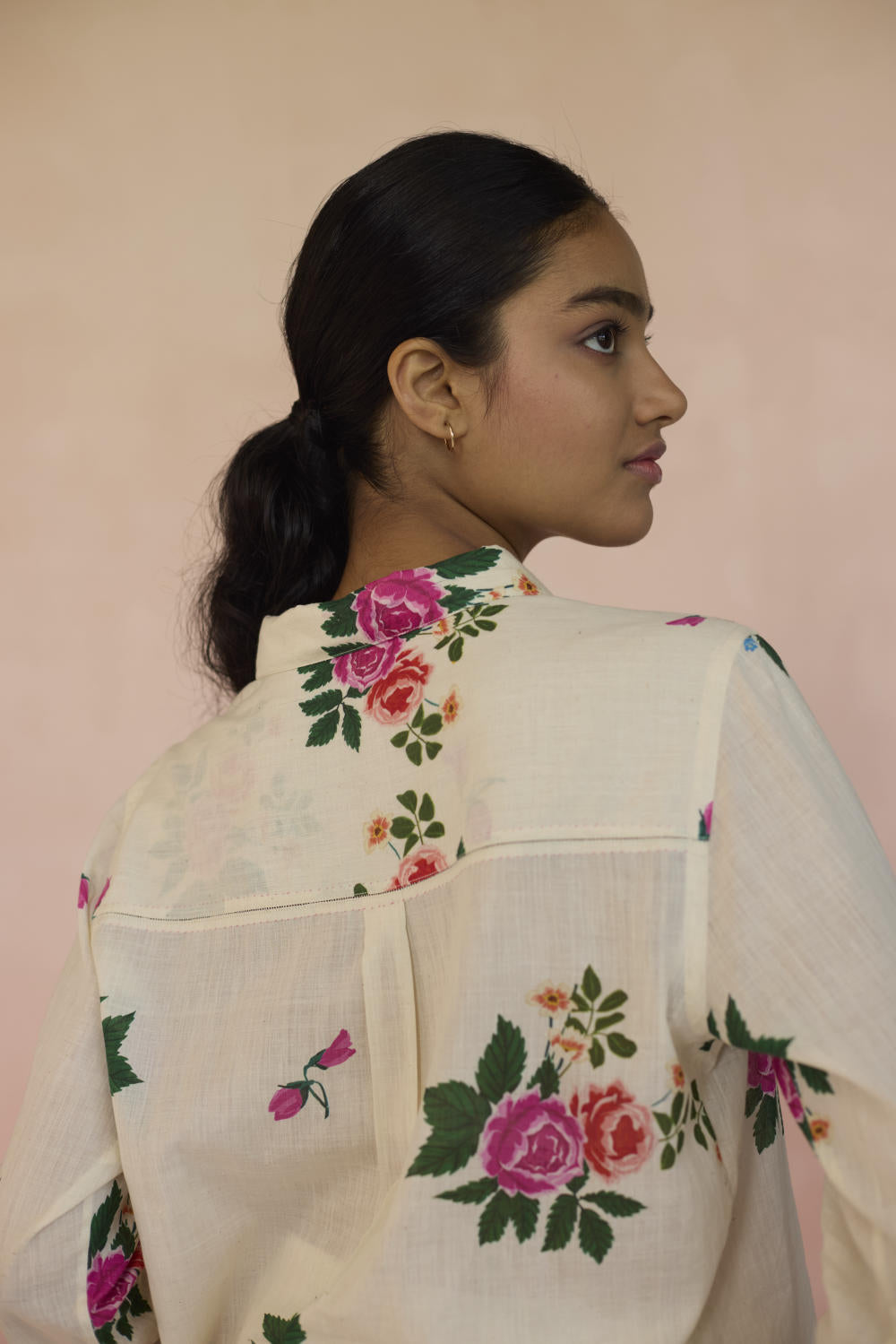 Our Rose Chintz shirt with its vibrant bloom, weaves together elegance and nostalgia. The roses symbolise romance, grace, and beauty in full bloom. This floral motif captures the essence of heritage, offering a refined yet sophisticated feel. The shirt is made with 100% handspun, handwoven cotton that lends grace and form to the fabric. Hand-sewn shell buttons and hand-swen seams adds a touch of individuality. The soft, yet durable cotton drapes effortlessly, offering comfort without compromising on style. This is a wardrobe staple.