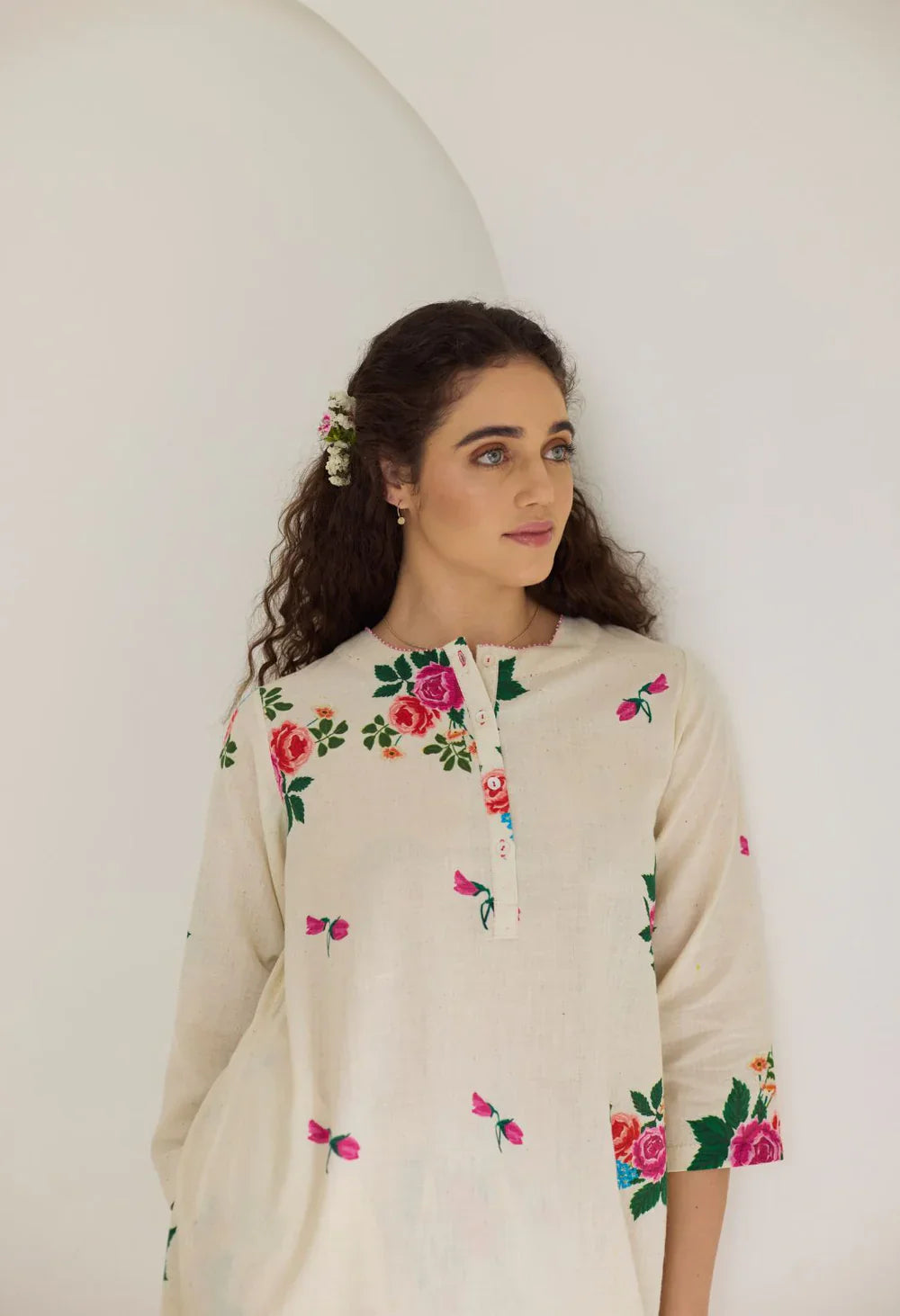 Material & embellishment details: Handspun, Handwoven Cotton. Hand-finished glass beads on neck and hand-finished edges.