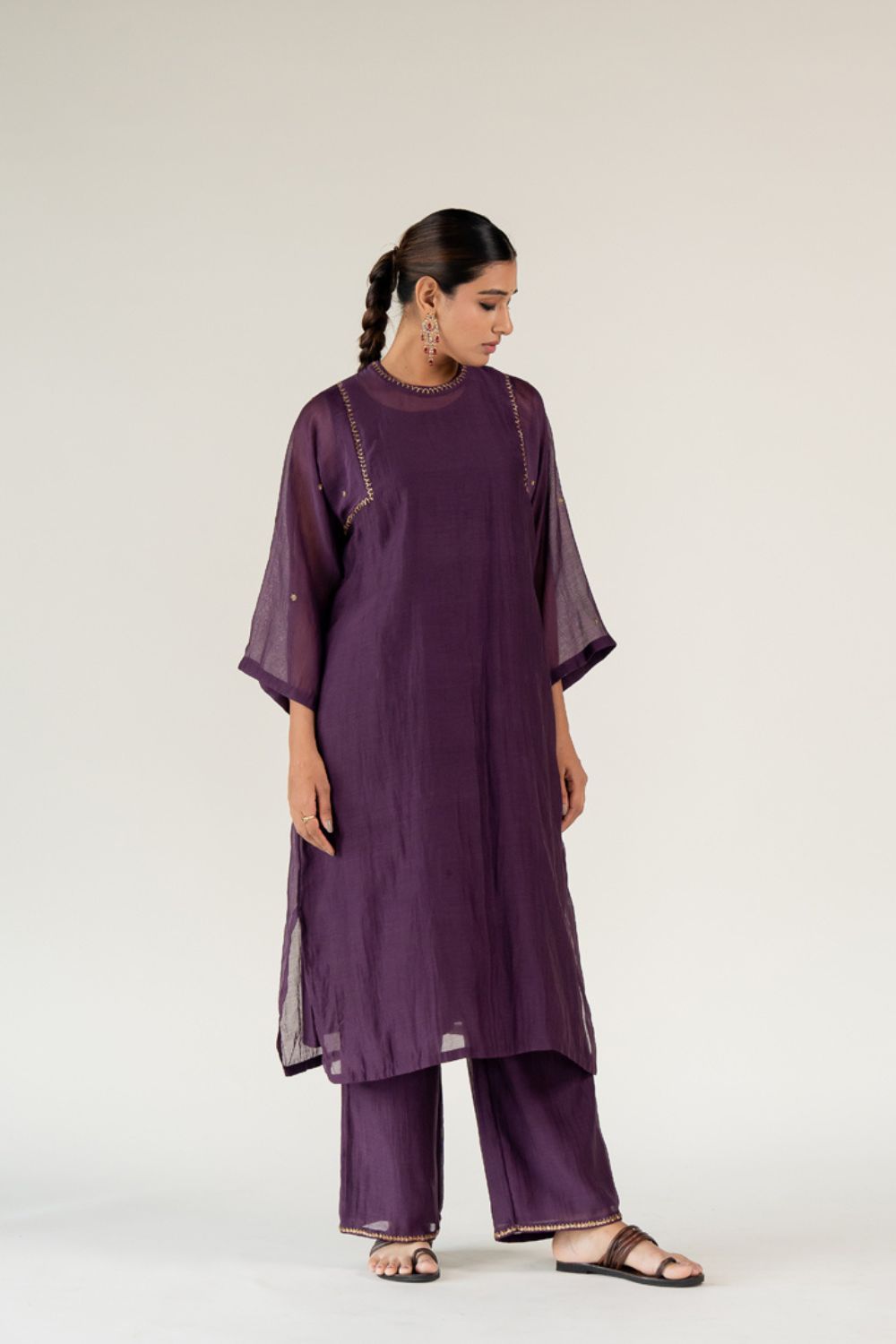 The elegant embroidery and stylish pants create a