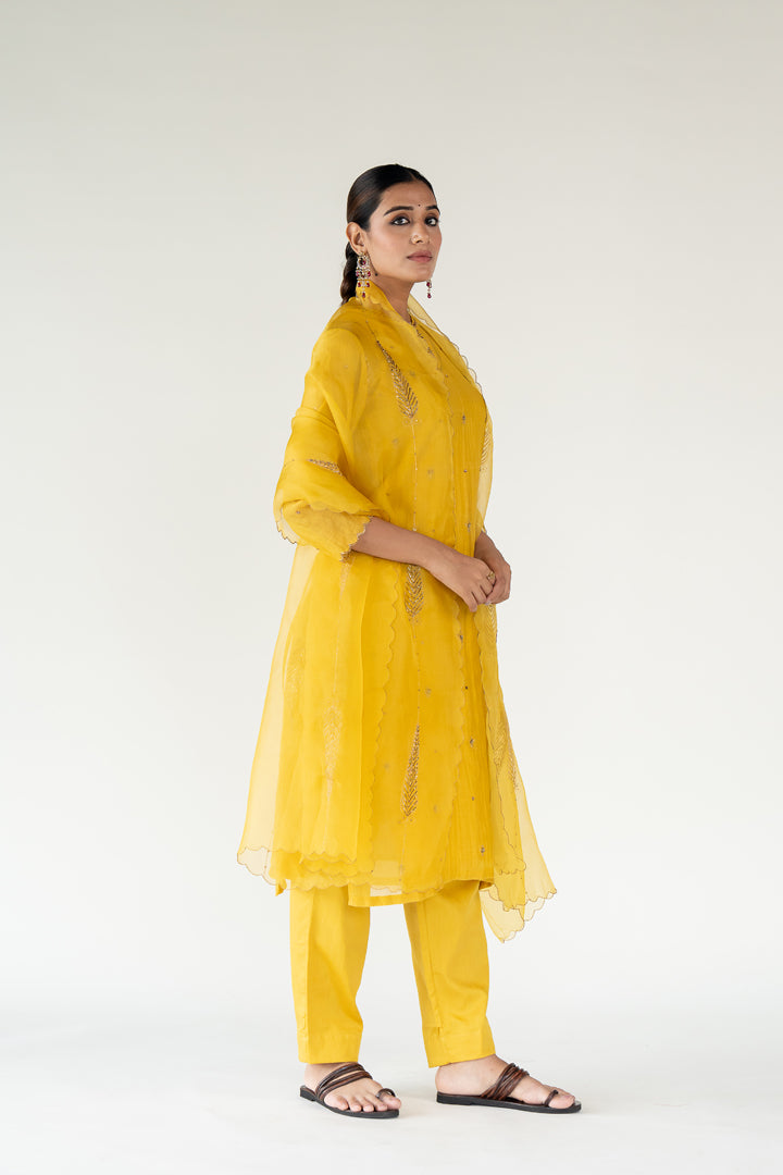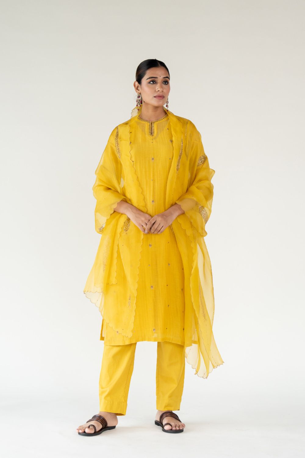 Straight-fit kurta adorned with delicate chaand buttas and peeta neckline detailing, complemented by straight pants. Paired with a Shama odhani highlighted by a Nakshi peeta cypress motif along its length.