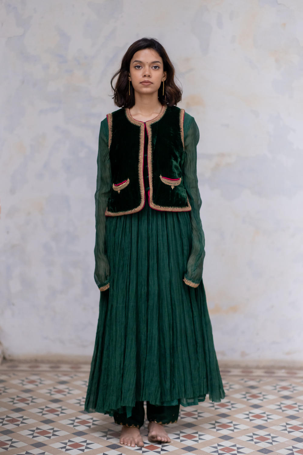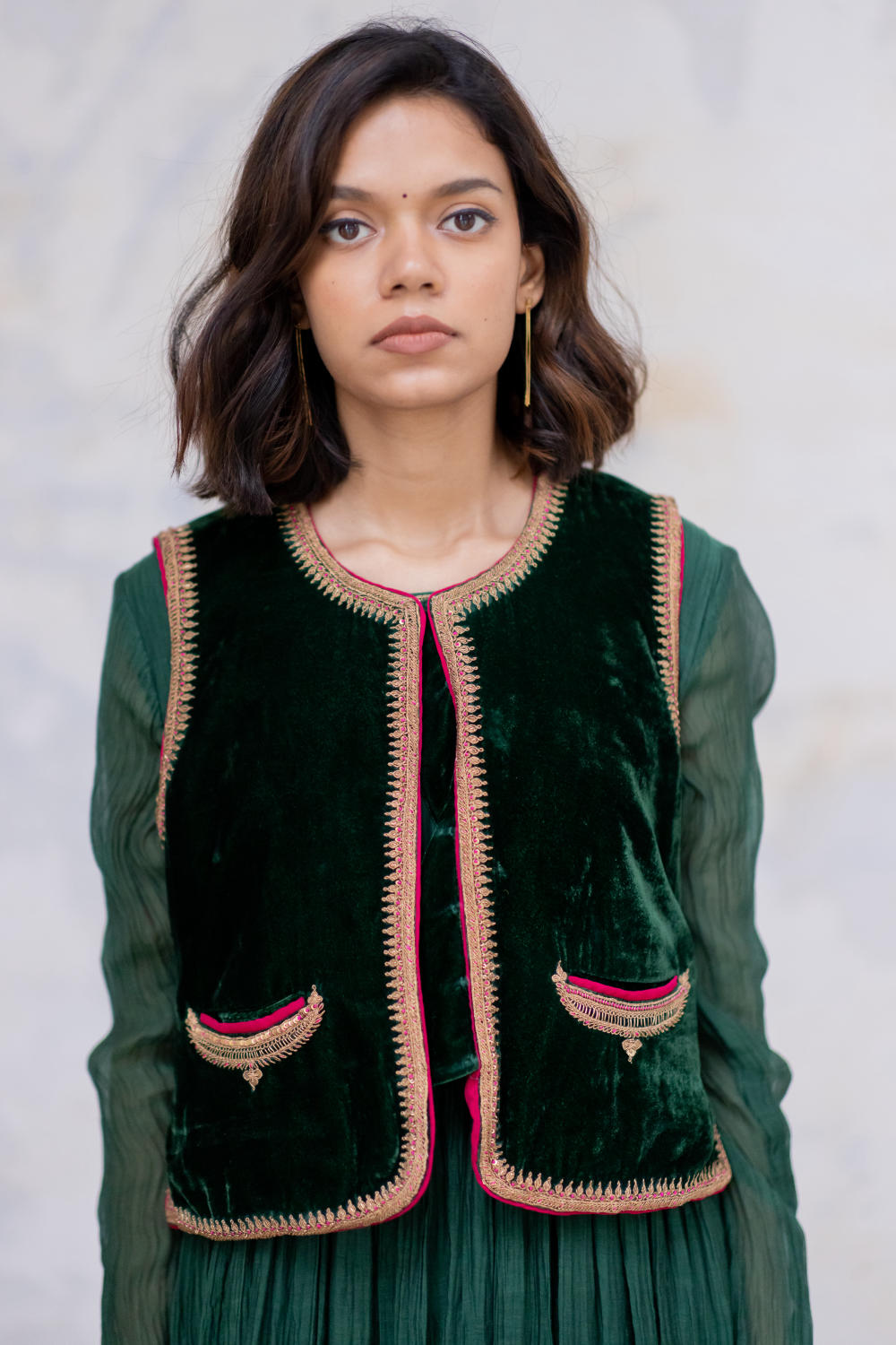 Velvet Sadri with traditional embroidered crescent pockets and Kangri edges in Marodi Embroidery. It has a contrasting magenta magji and a quilted lining for warmth