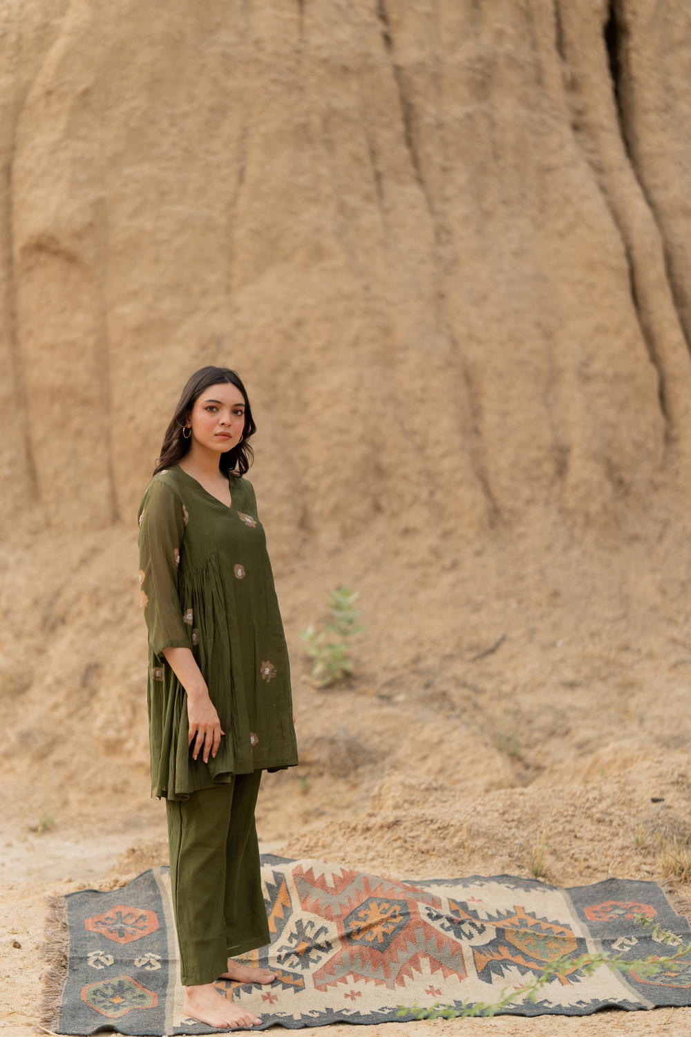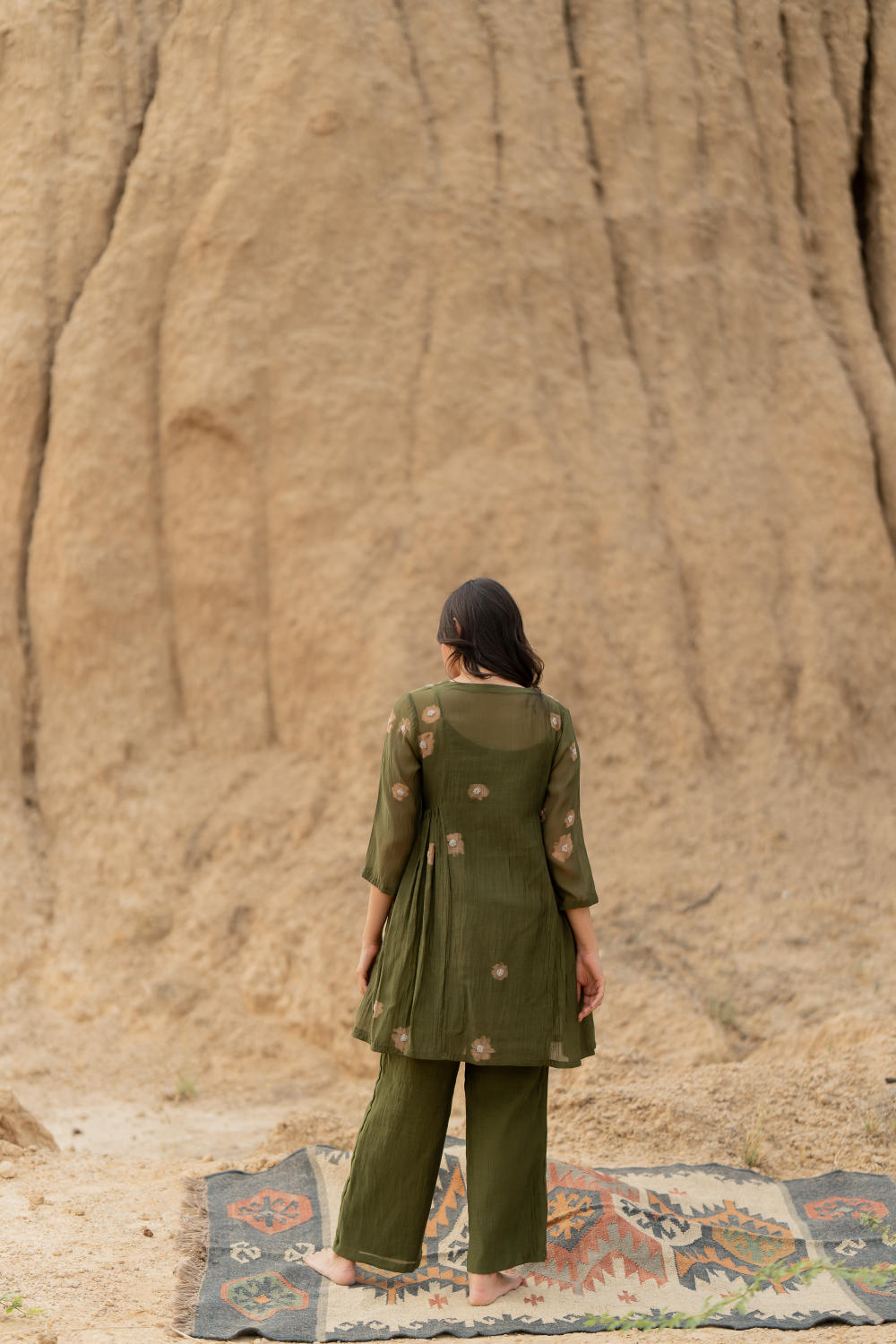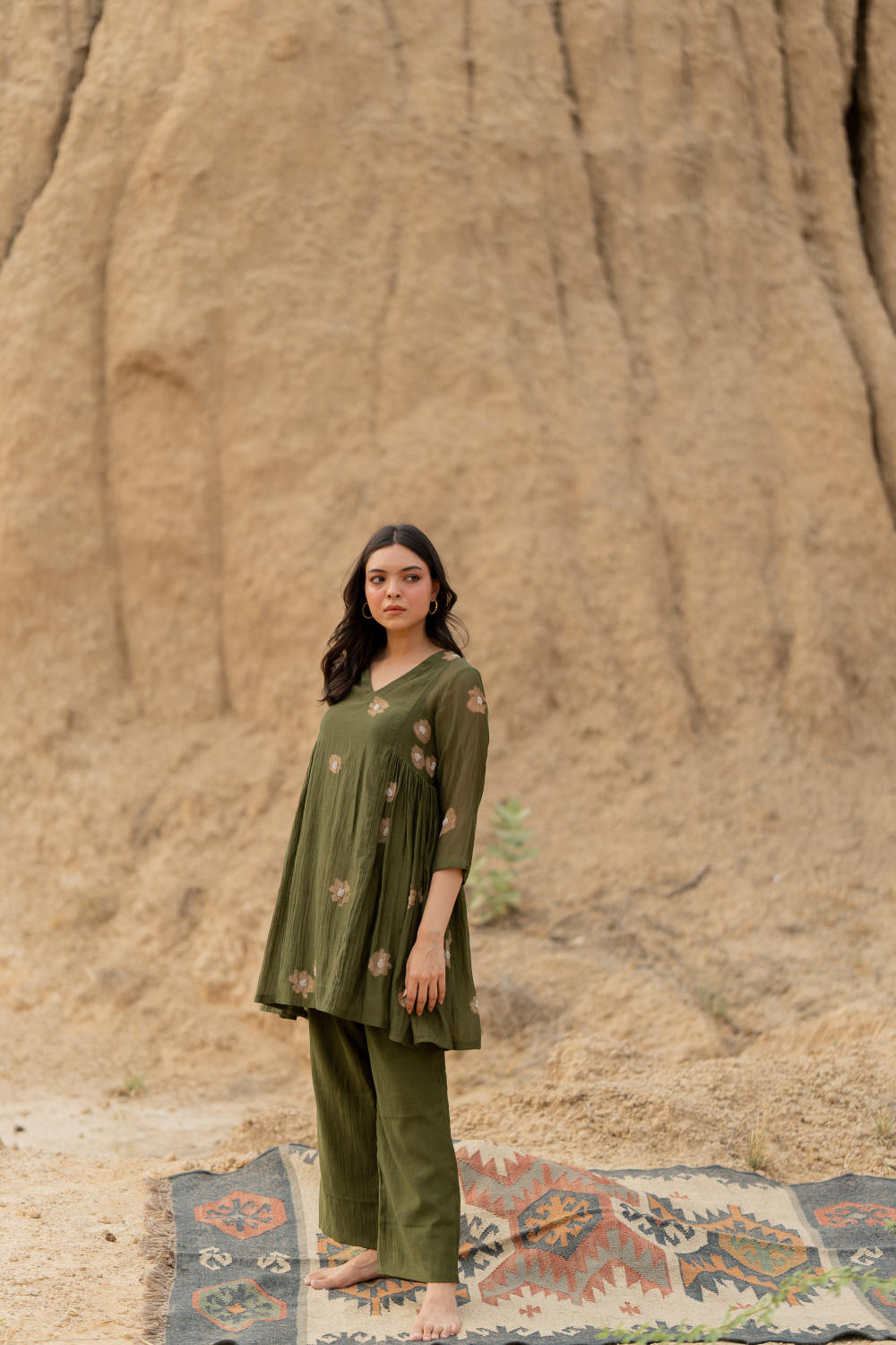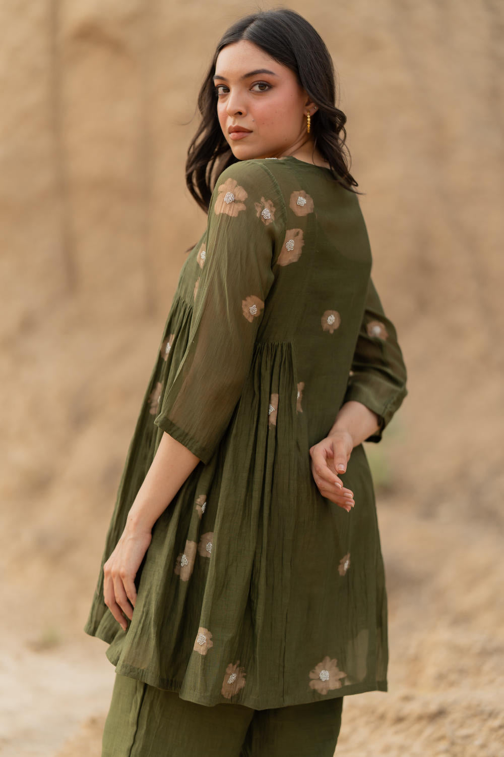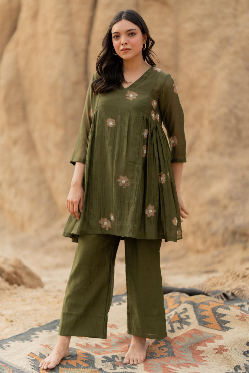 Kurta set crafted in breezy chanderi features side gathers with summery florals all over. Style it with matching pajamas and ballet flats for the daytime.