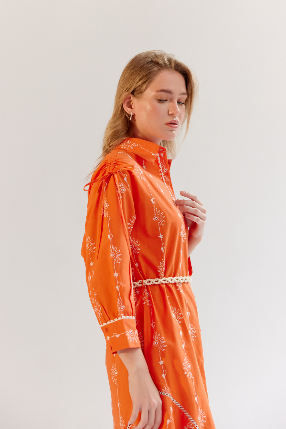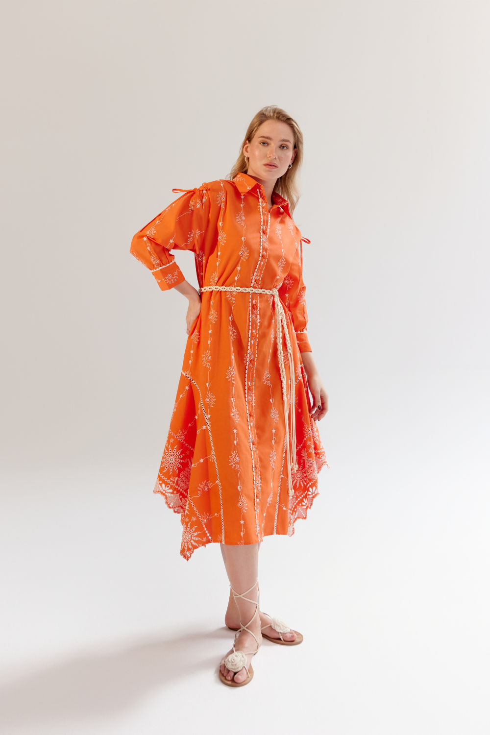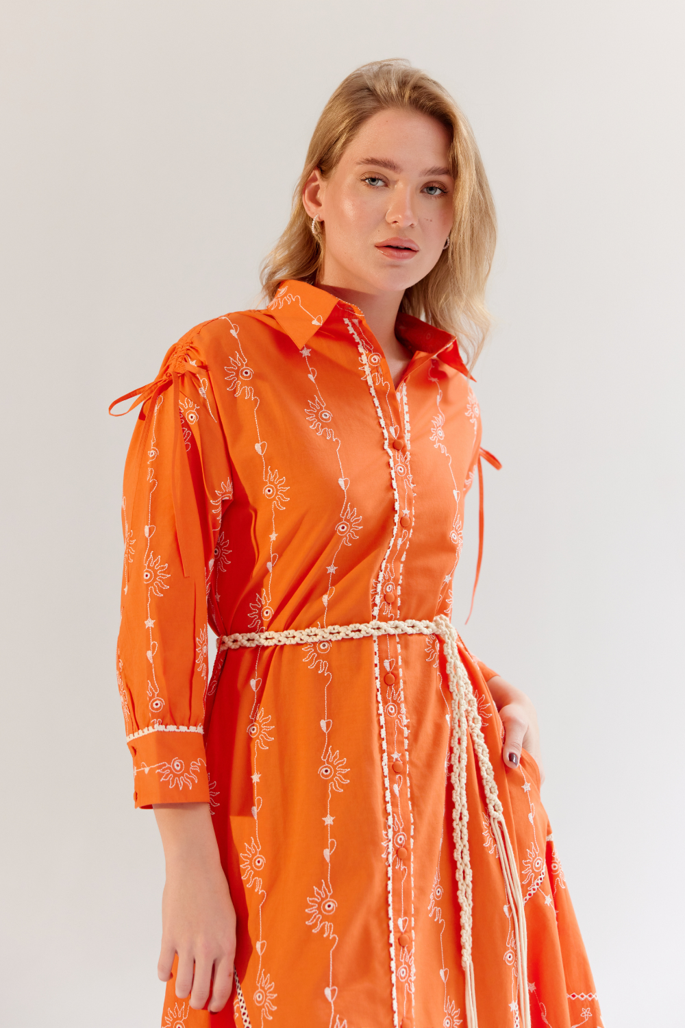 Introducing the Alba Maxi, available in two striking variations—Boardgame, featuring a vibrant placement print, and Tangerine, adorned with delicate schiffli embroidery—both crafted from luxurious giza poplin. Lace inserts at the bottom add an element of sophistication, while a beautifully crafted crochet belt cinches the waist for a flattering silhouette.