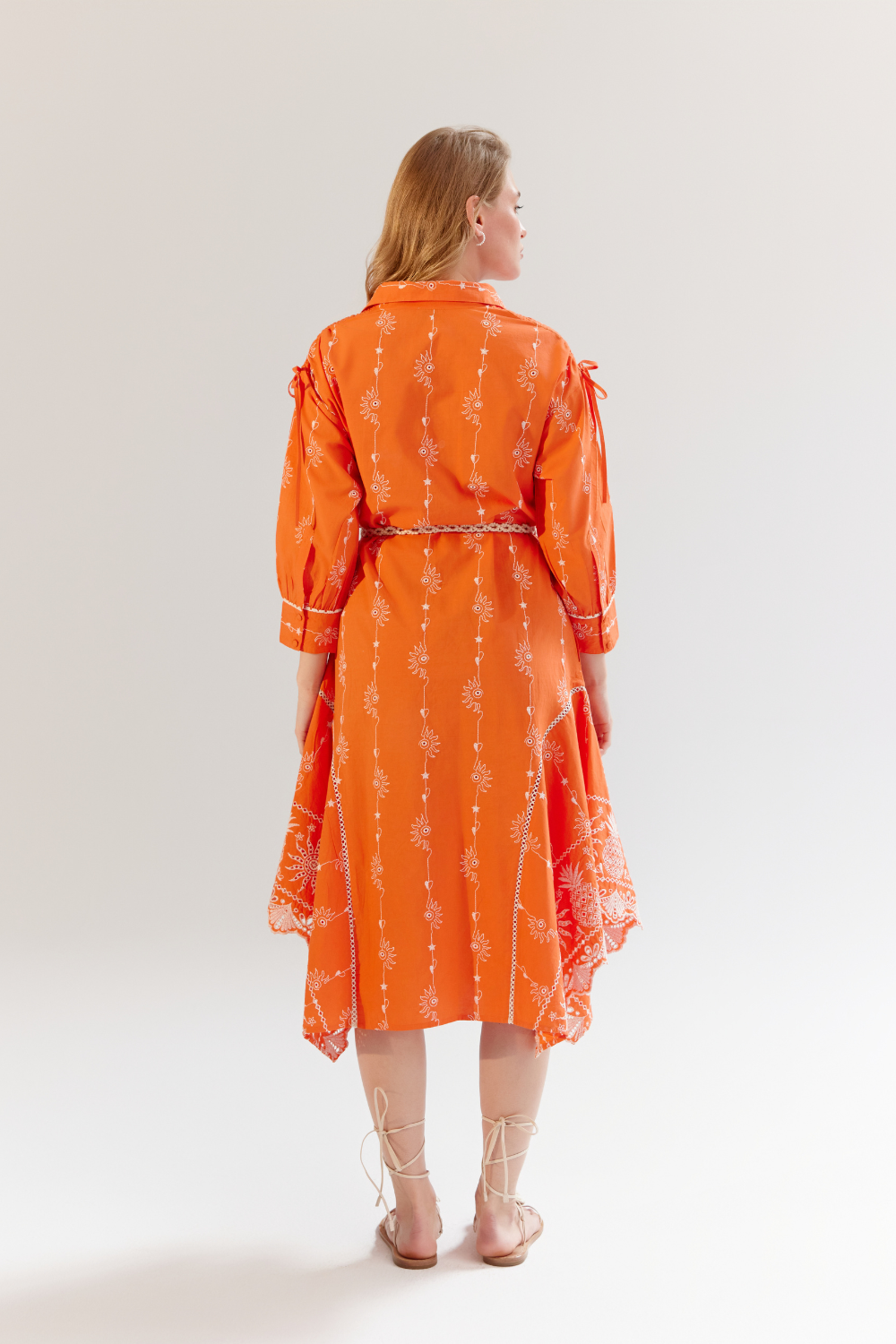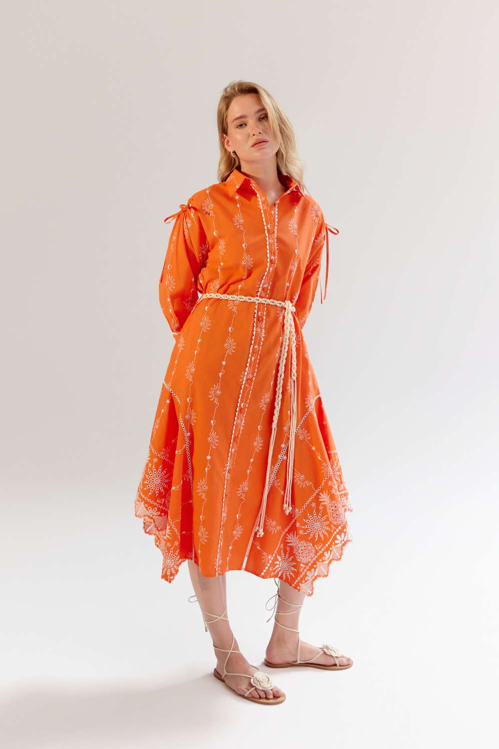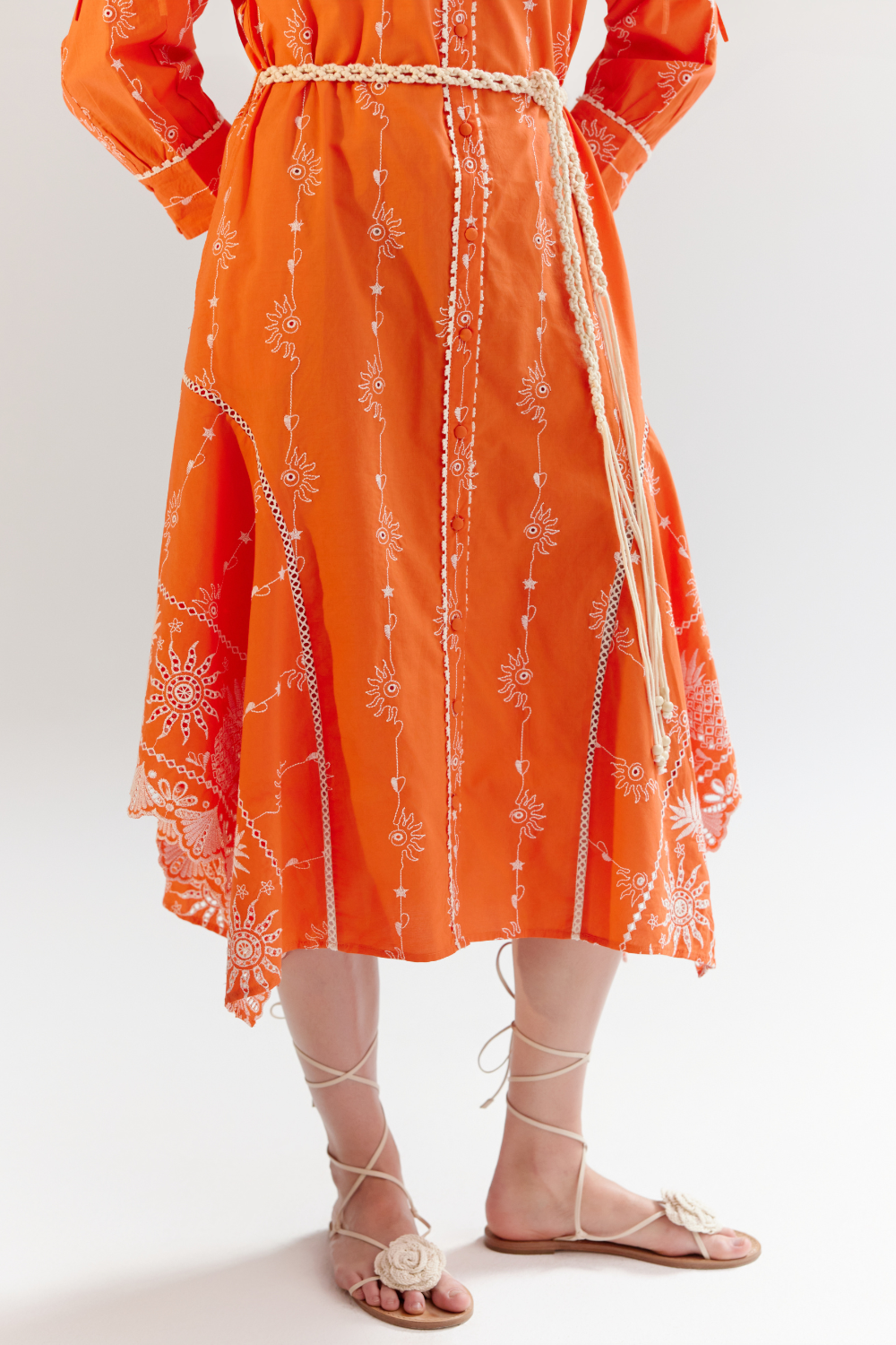 Introducing the Alba Maxi, available in two striking variations—Boardgame, featuring a vibrant placement print, and Tangerine, adorned with delicate schiffli embroidery—both crafted from luxurious giza poplin. Lace inserts at the bottom add an element of sophistication, while a beautifully crafted crochet belt cinches the waist for a flattering silhouette.