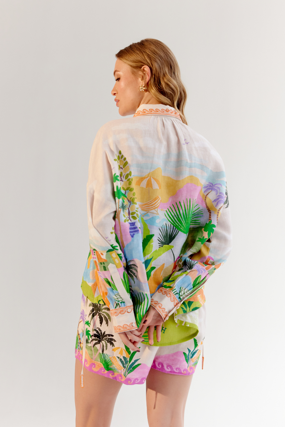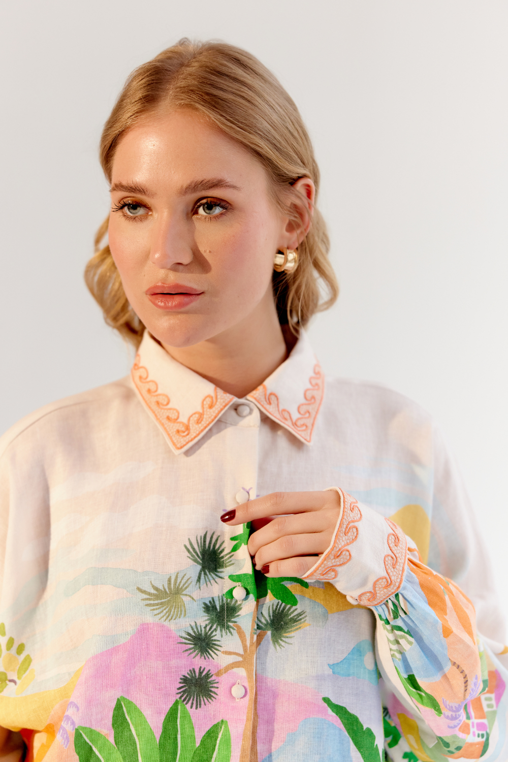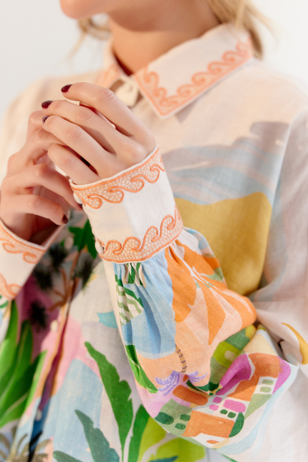 Introducing the Fleur Shirt that is crafted from lightweight linen viscose, it features the vibrant By the Sea placement print that captures the essence of coastal charm. Thoughtful embroidery detailing on the collar and cuffs adds a touch of elegance, while the drawstring at the front bottom hem creates a flattering ruching effect for a unique silhouette.