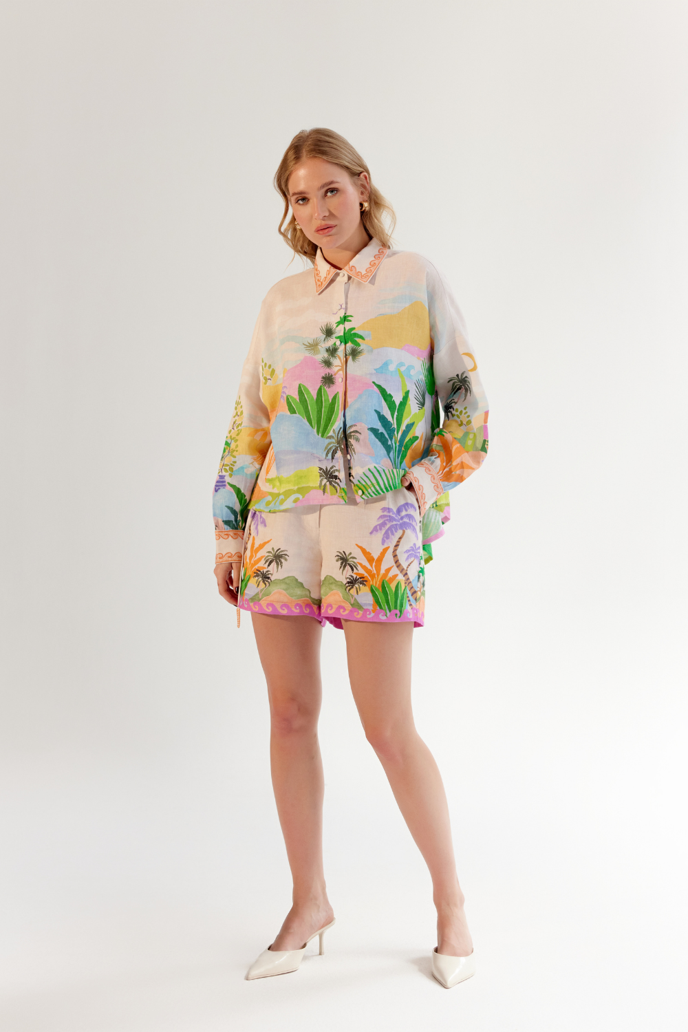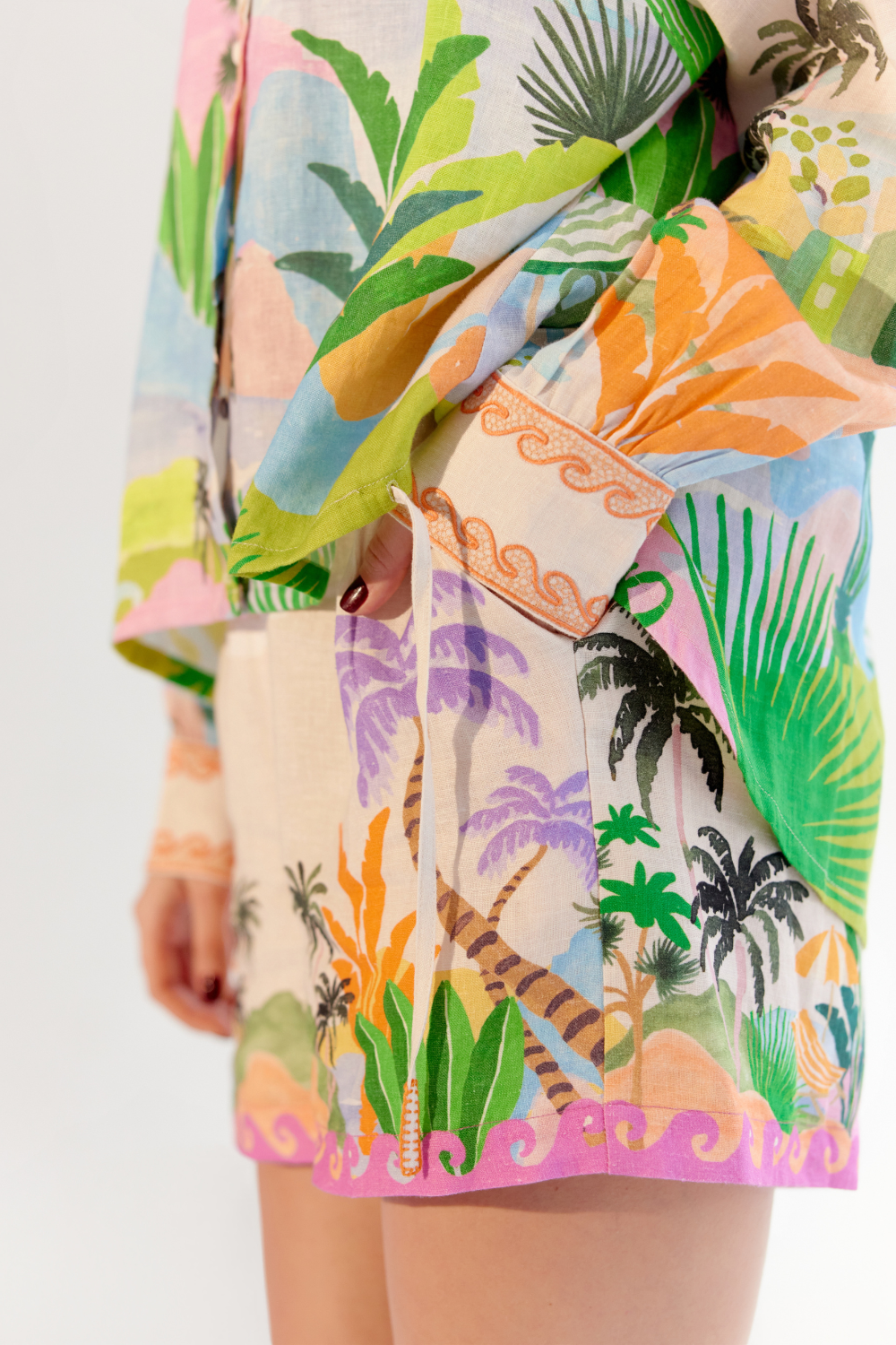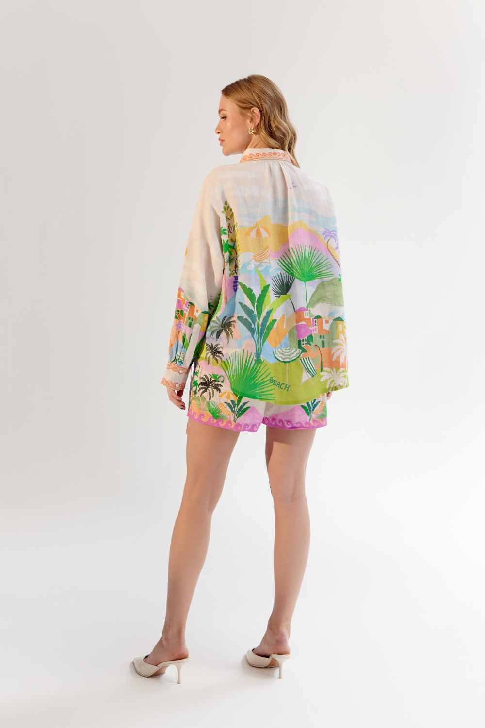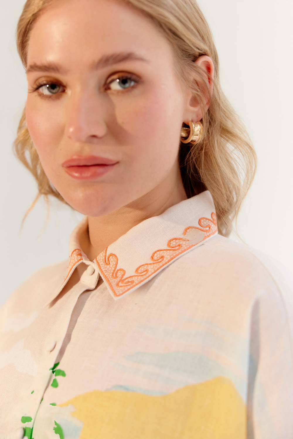 Introducing the Fleur Shirt that is crafted from lightweight linen viscose, it features the vibrant By the Sea placement print that captures the essence of coastal charm. Thoughtful embroidery detailing on the collar and cuffs adds a touch of elegance, while the drawstring at the front bottom hem creates a flattering ruching effect for a unique silhouette.