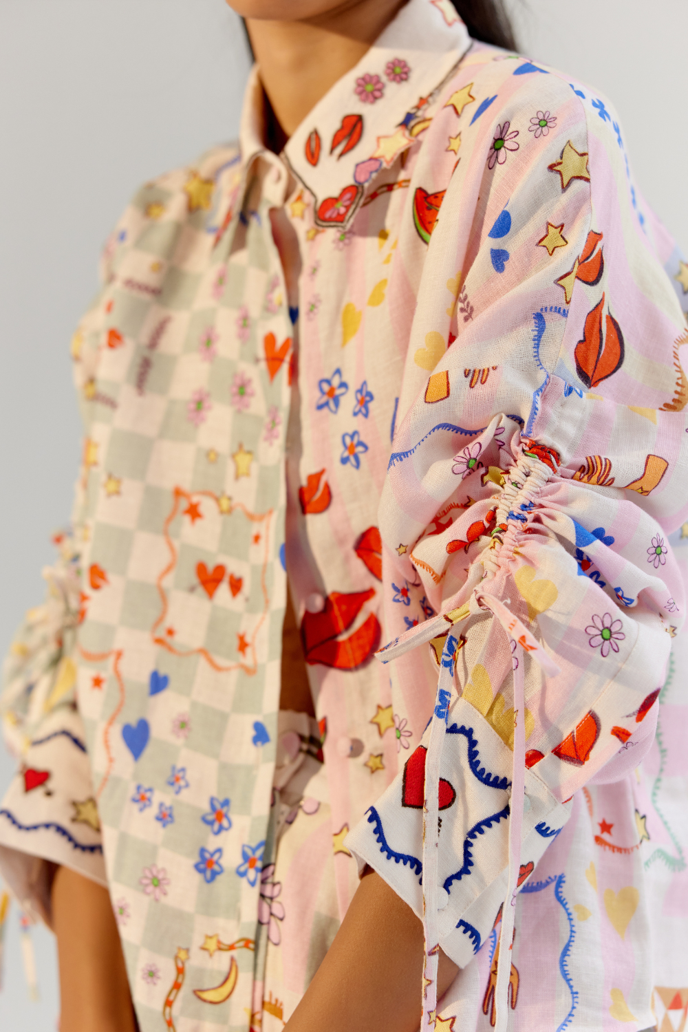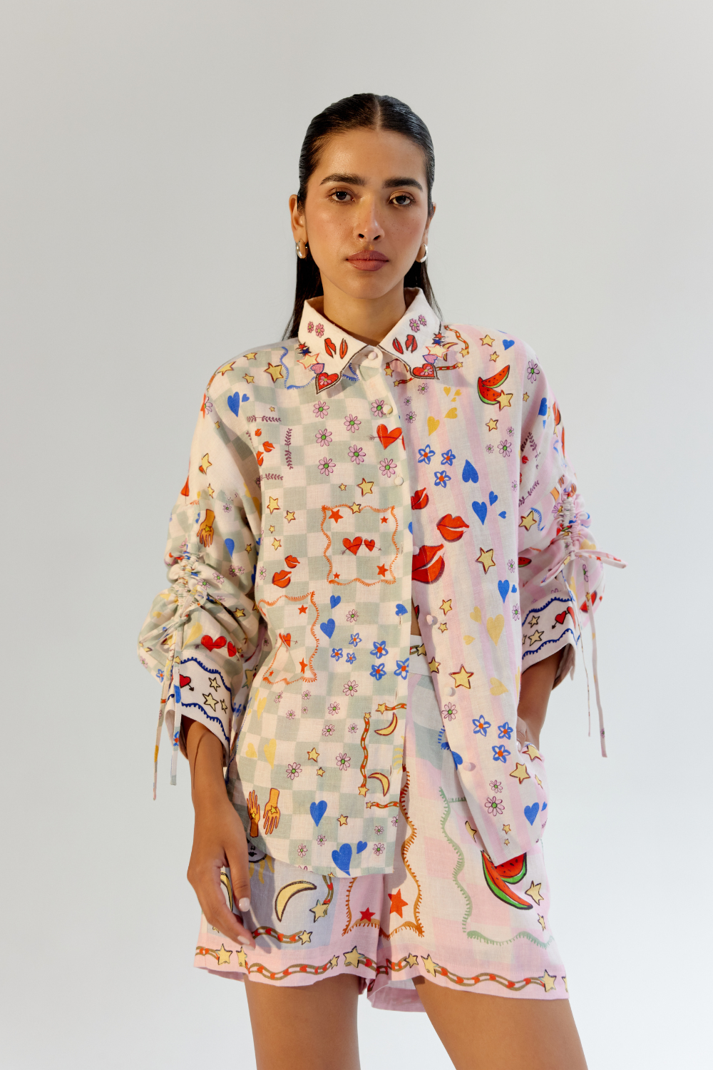 The Thais Shirt, a beloved bestseller from our previous collection, makes its return in two stunning new variations. Crafted for versatility and charm, it is available in Boardgame, featuring vibrant placement printing on linen lyocell with intricate collar and cuff embroidery, and a timeless All-Over Embroidery design on breathable giza poplin. Both styles feature adjustable drawstrings on the sleeves, creating a chic ruching effect that adds a touch of playfulness to its classic silhouette.
