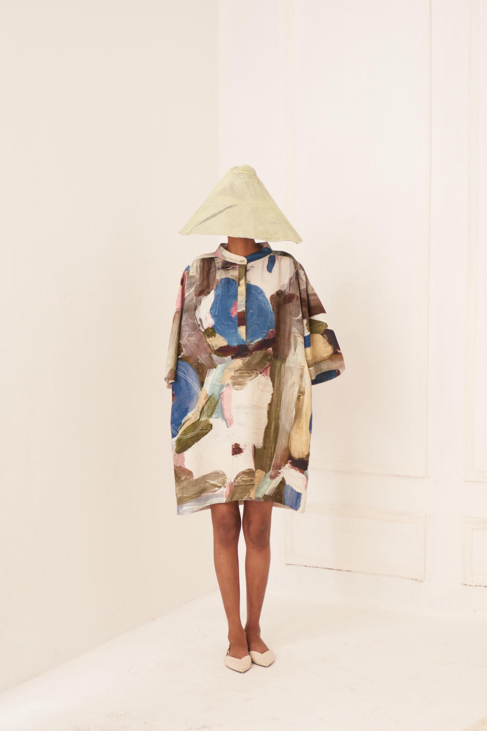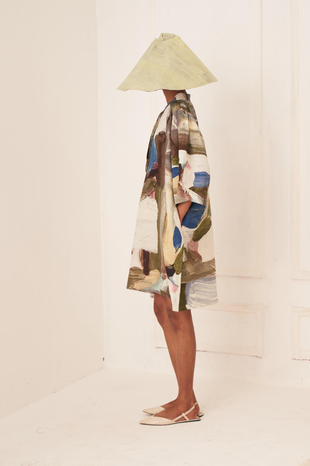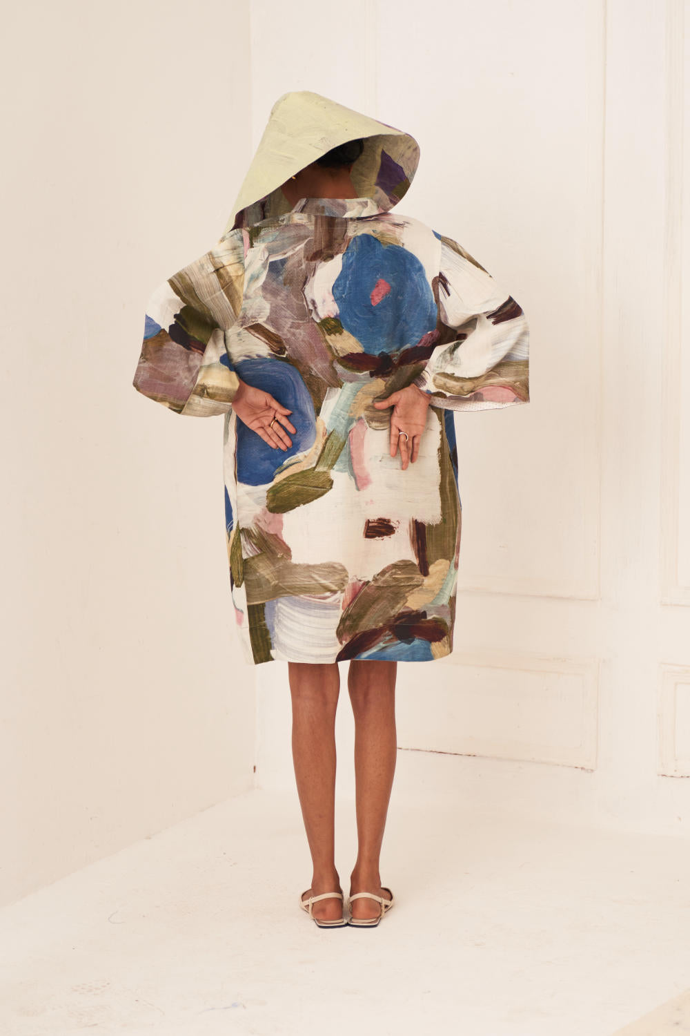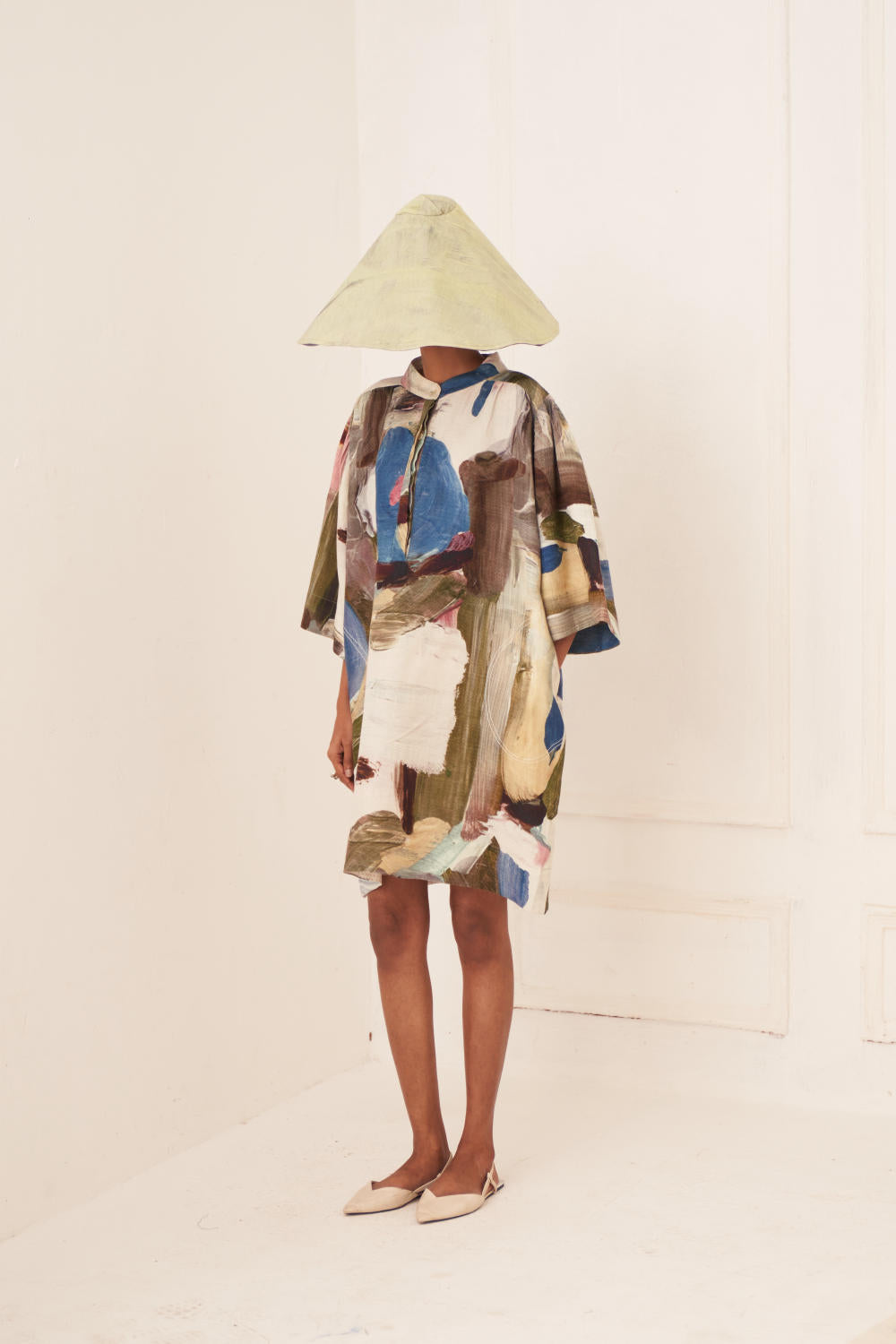 Anti–fit dress featuring a hand-painted abstract expressionist digitally transferred print with U–shaped pockets accented by top–stitch details. Designed with a mandarin collar (half placket) and gathers at the shoulder and sleeves, finished with a vintage coin at the back yoke. Print placement will vary - single piece. Model is wearing size M.