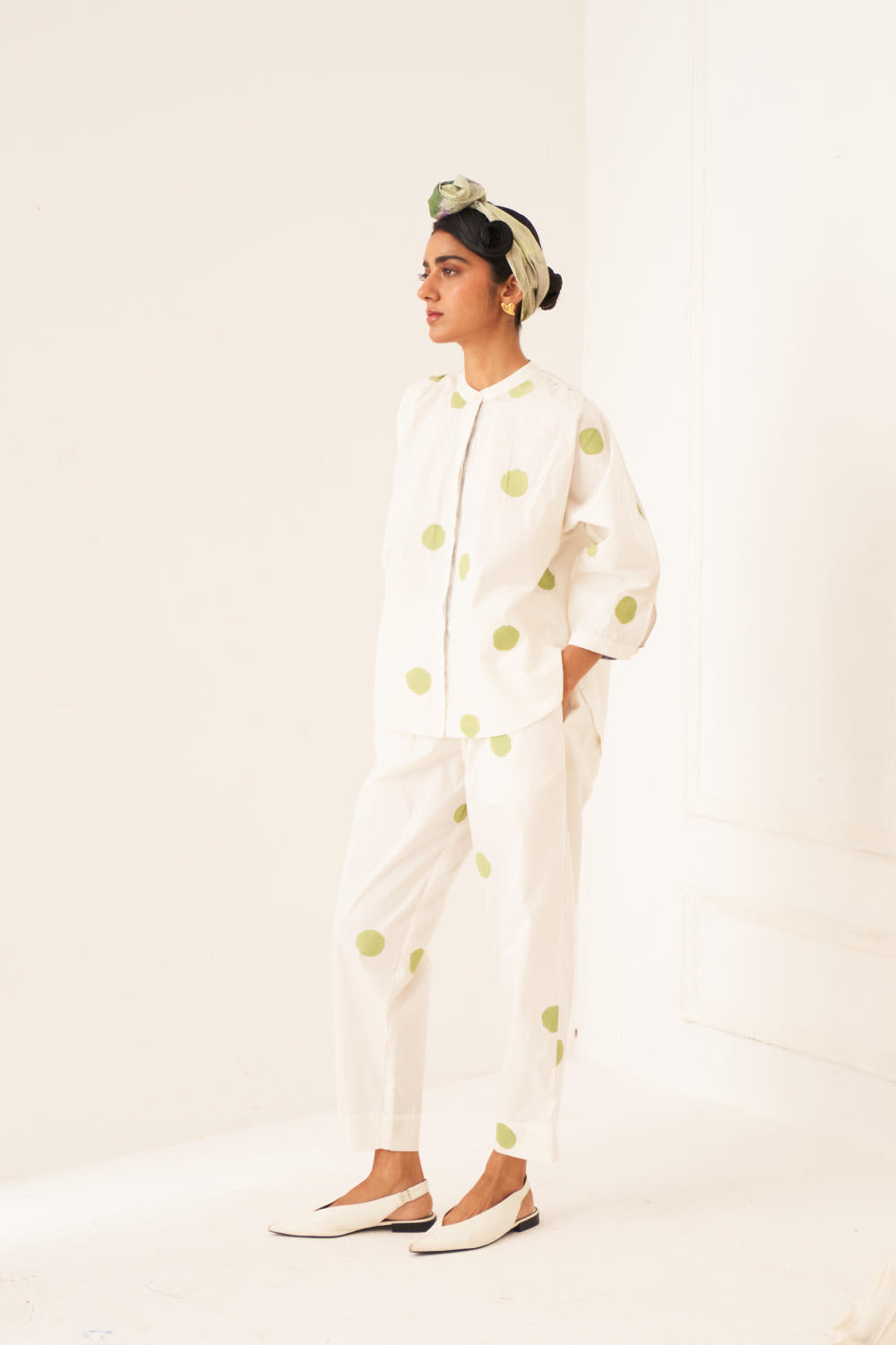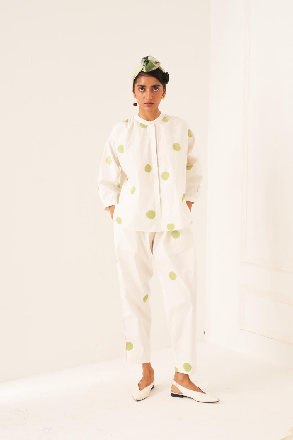 The RJ shirt has a hand-painted polka which features a gathered neck, with side slits and a front button placket. It has our Signature vintage coin at the back which adds a unique touch. print placements will vary. Model is wearing size M.