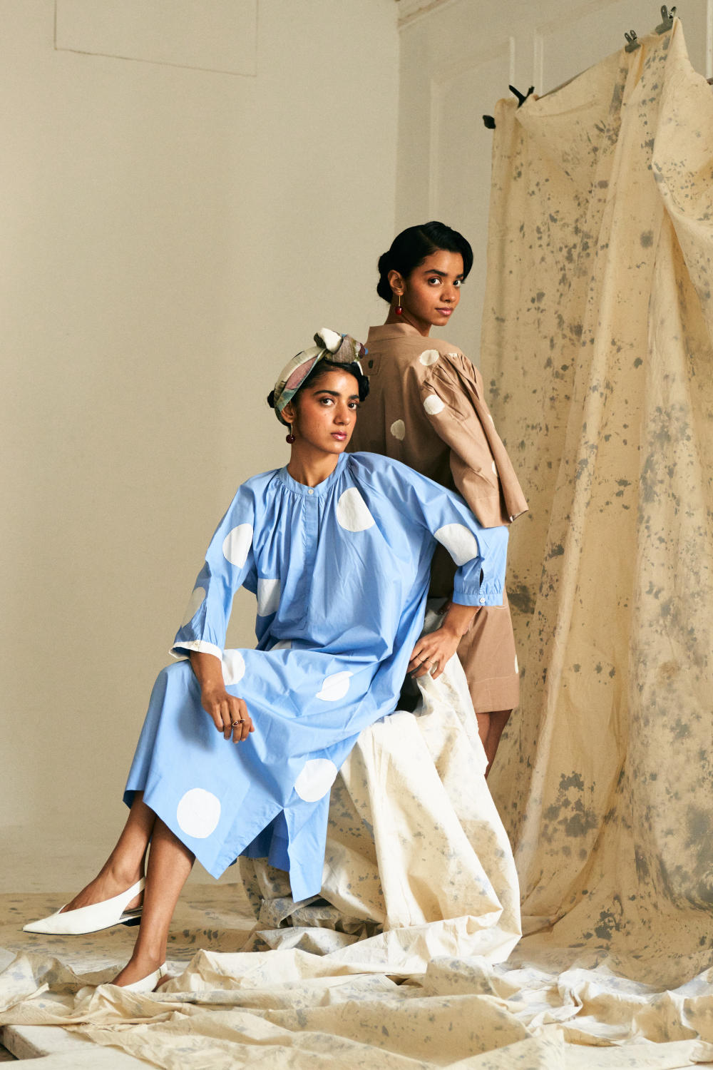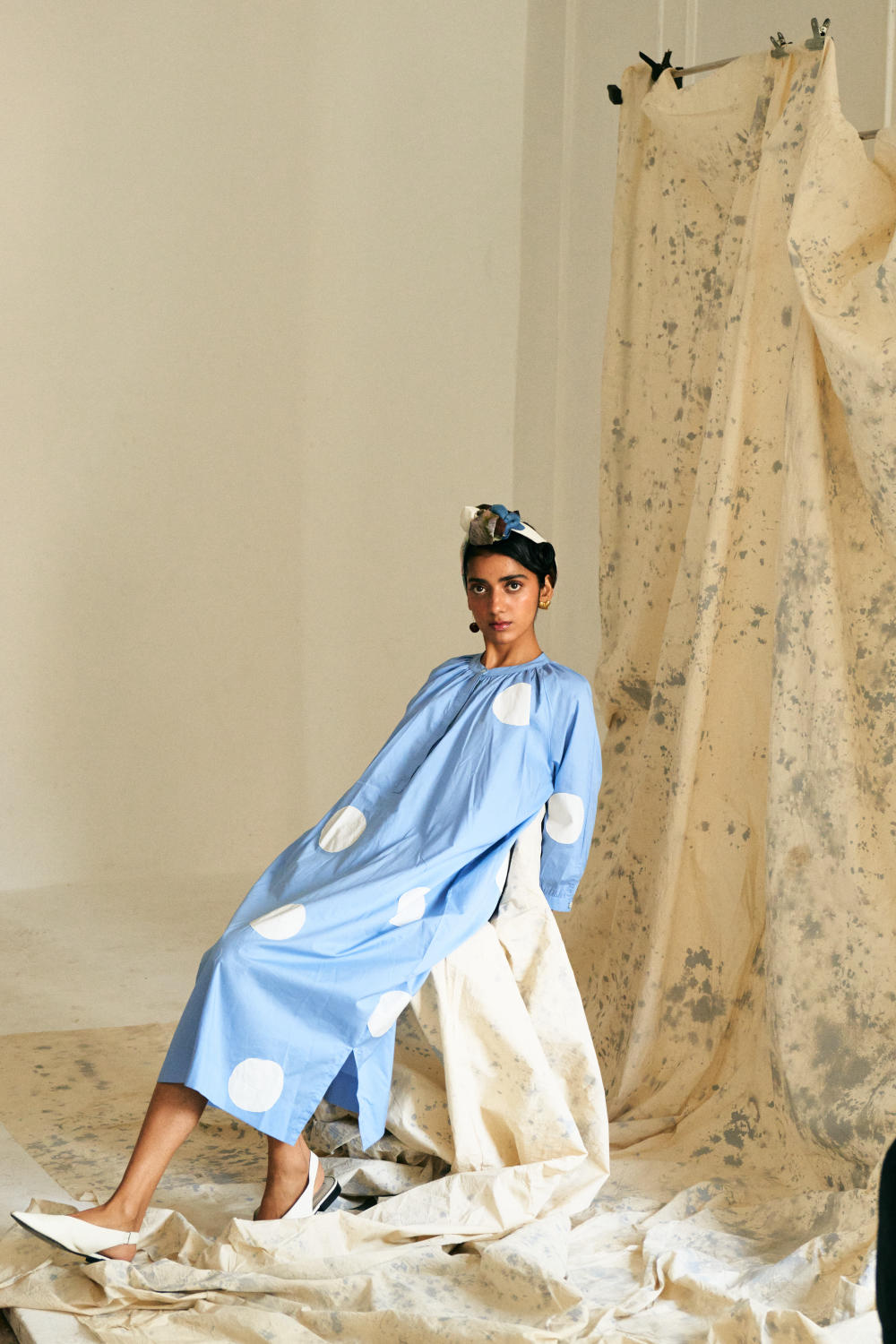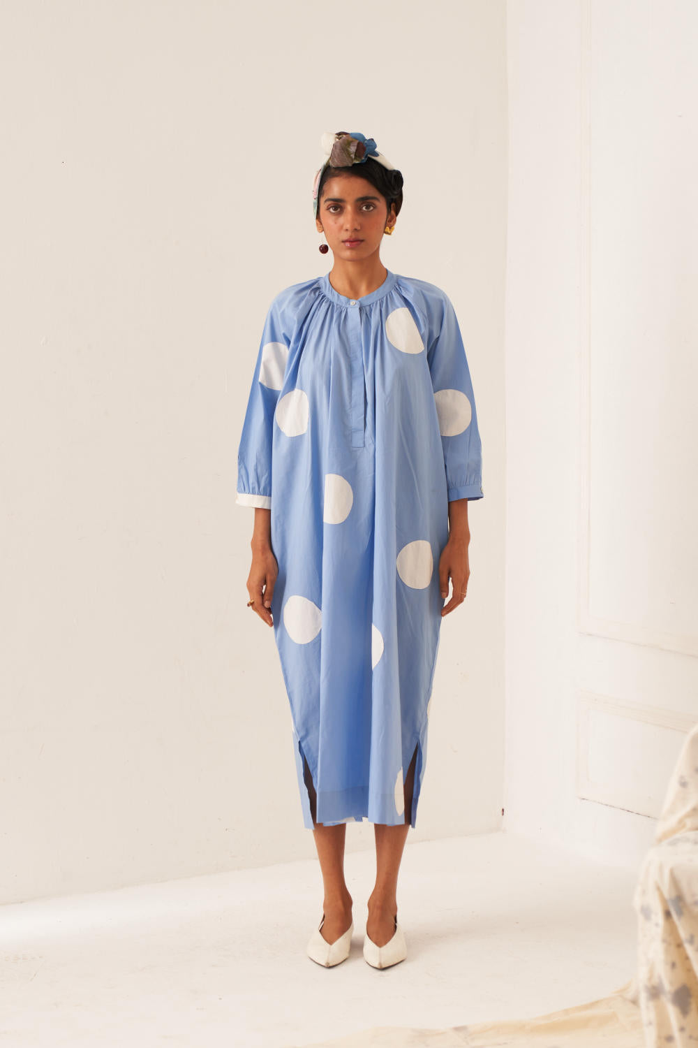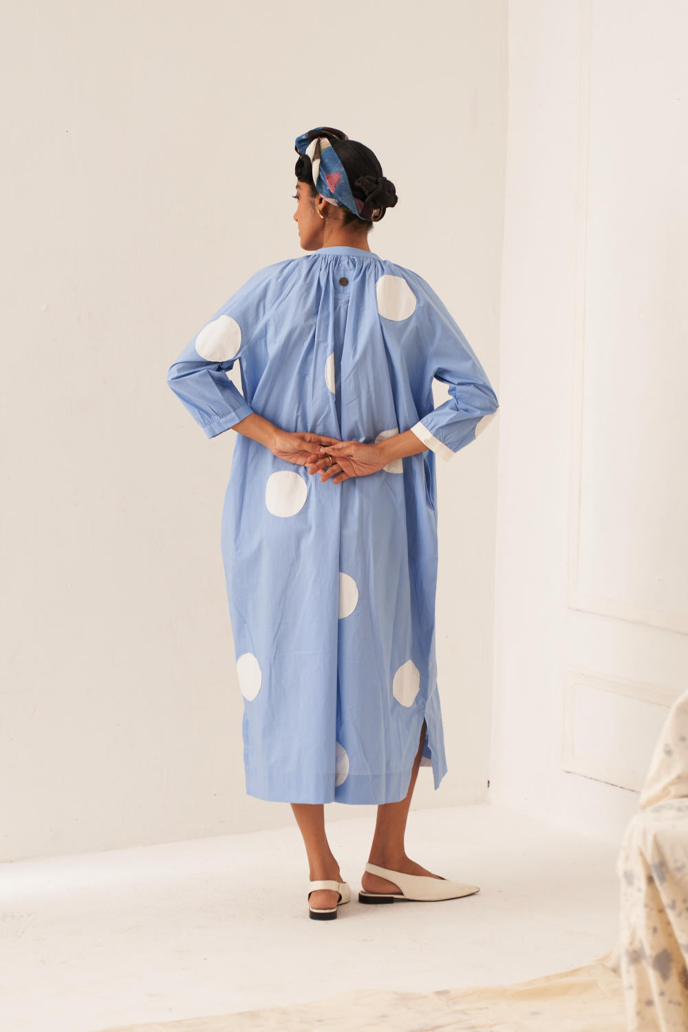 Anti-fit Polka Appliqué Dress with Mandarin Collar, Half Placket, and Gathered Neck & Sleeves, Featuring Vintage Coin Detailing on the Back. Model is wearing size M.