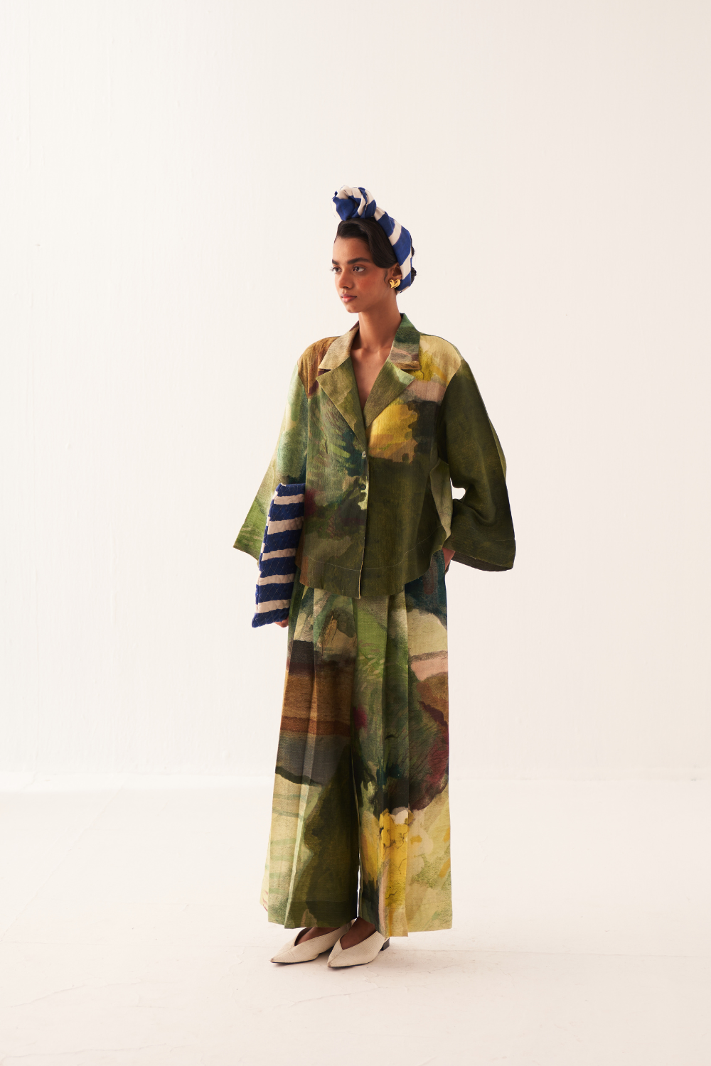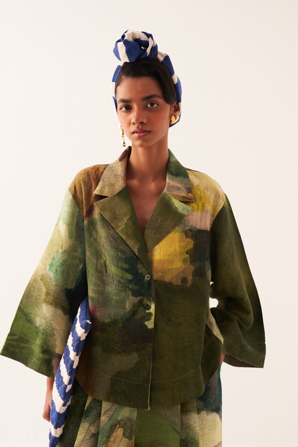 Anti-fit jacket shirt is hand-painted abstract expressionist print, digitally transferred. The shirt features a lapel collar, Kimono sleeves. Signature OFR lune embroidery at back. Print placements will vary—single piece. Model is wearing - M.
