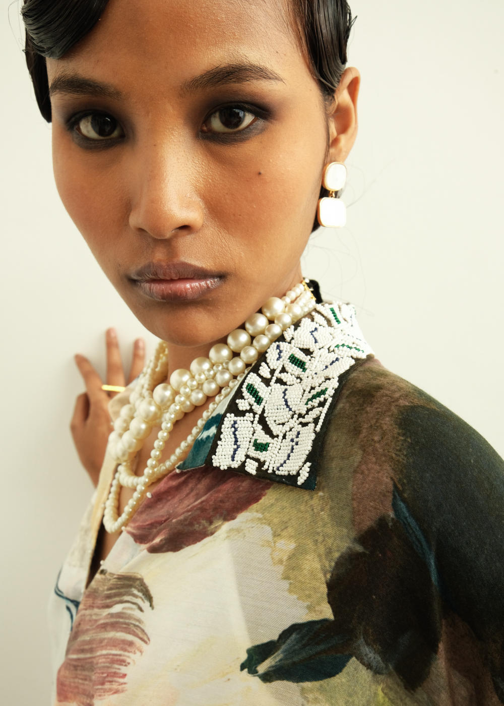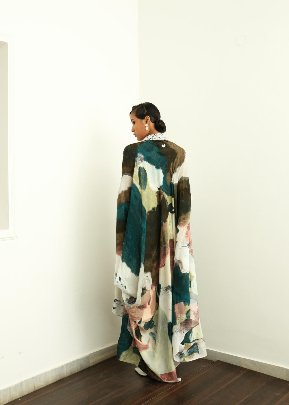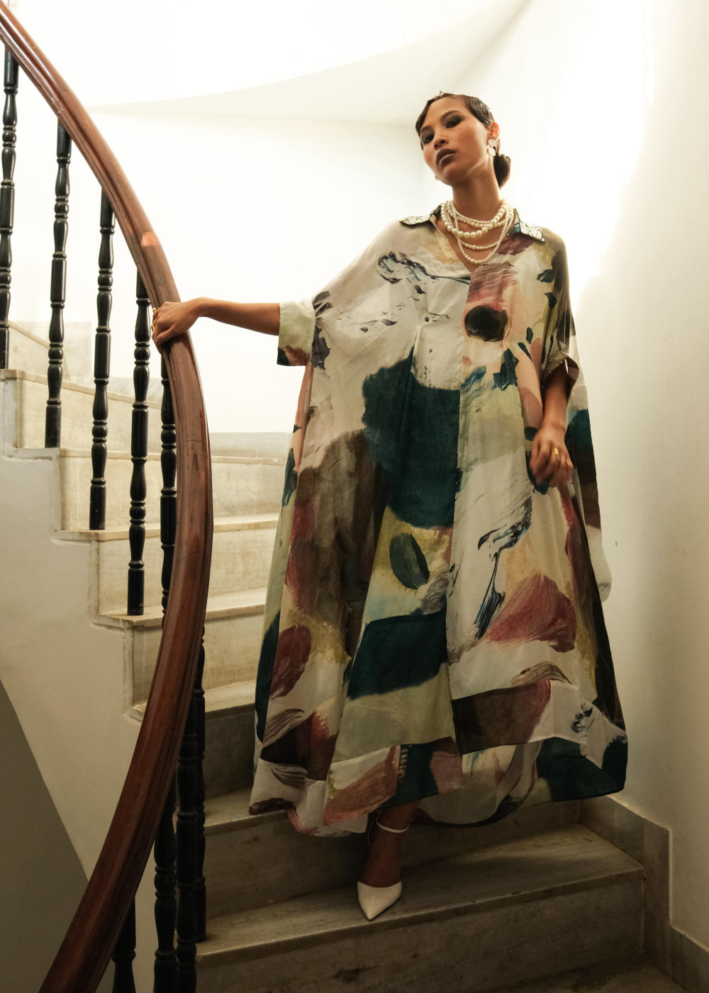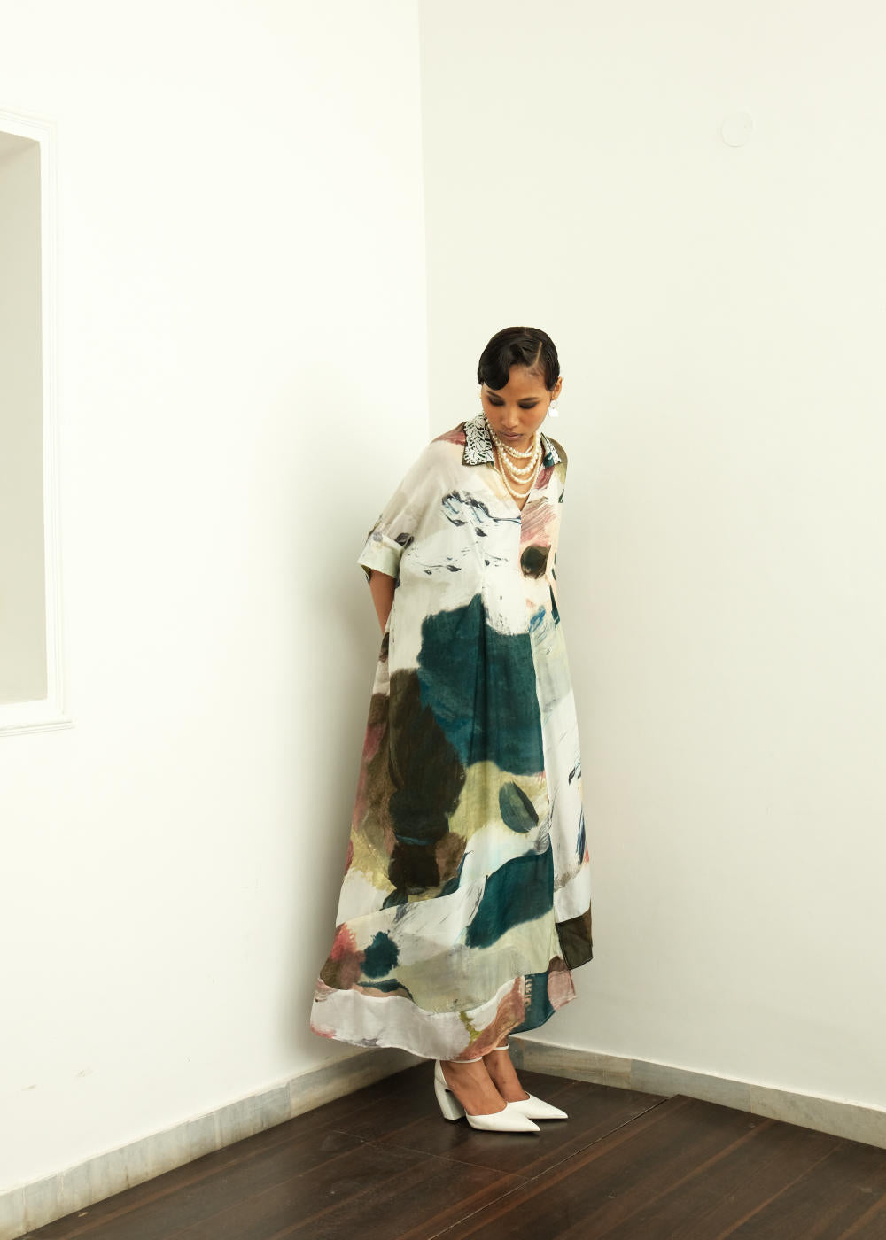 Signature OFRIDA Drape Anti-Fit Dress, Perfect for afternoon soirees, resort weddings & parties. Hand-painted abstract expressionist digitally transferred print—hand-beaded & embroidered collar. Hand embroidered Signature OFR Lune. Lightweight textile. Front pleats and back drape. Print placements will vary—single Piece.