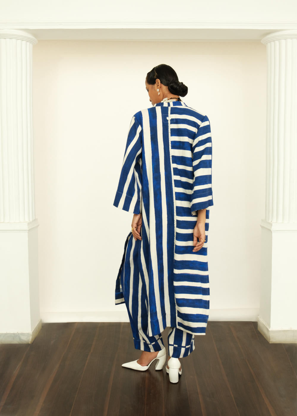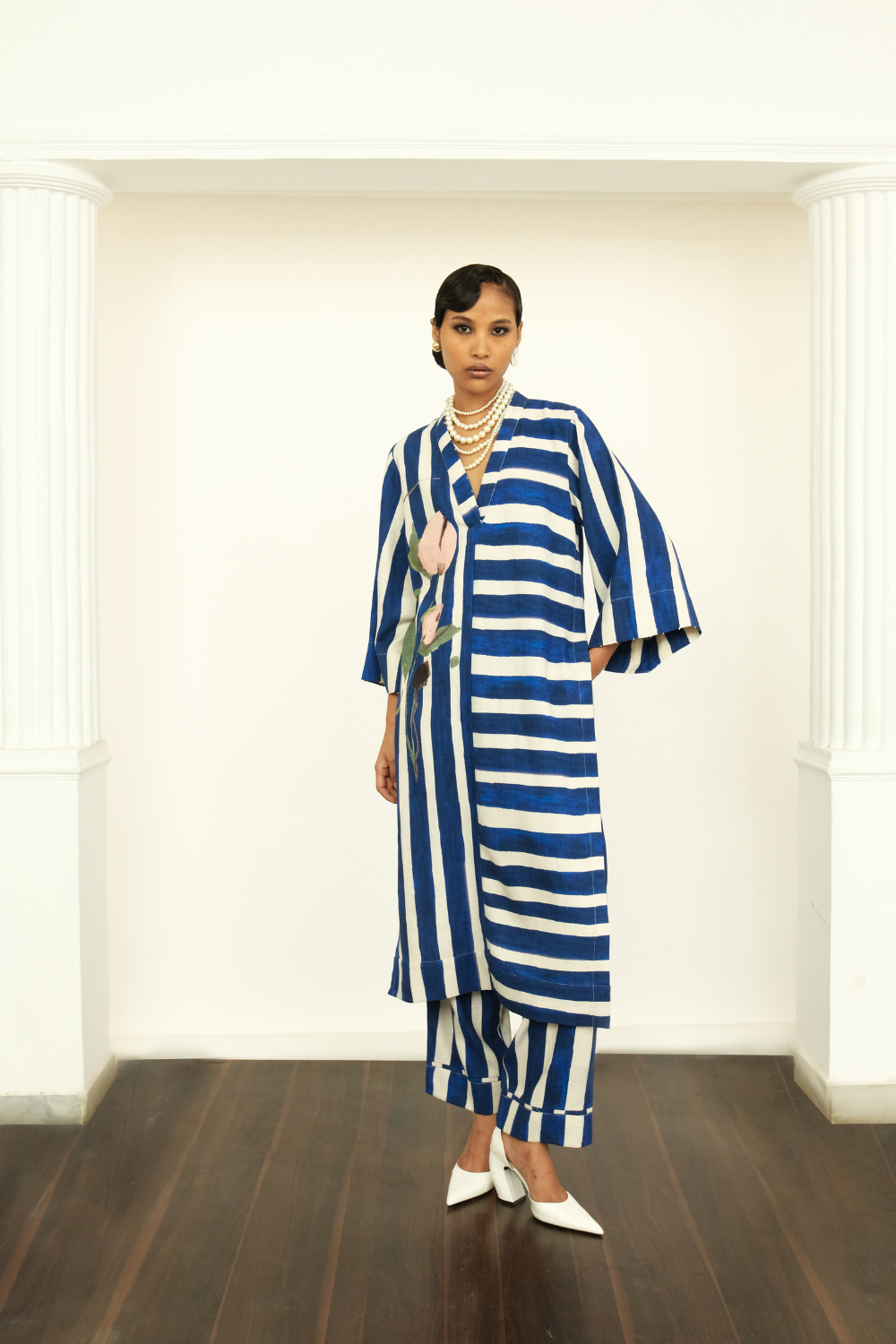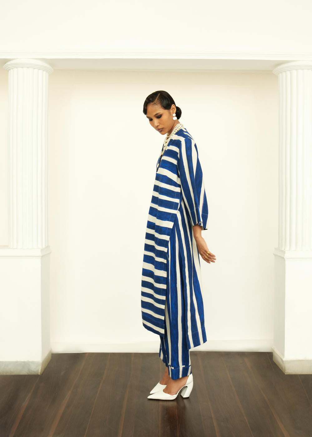 Anti-Fit, Hand-painted abstract expressionist digitally transferred print, V-neck kurta, Side pockets, Center back kantha embroidery, Hand beaded neck and cuffs, Hand-embroidered Signature OFR Lune. Print placements will vary—single Piece.